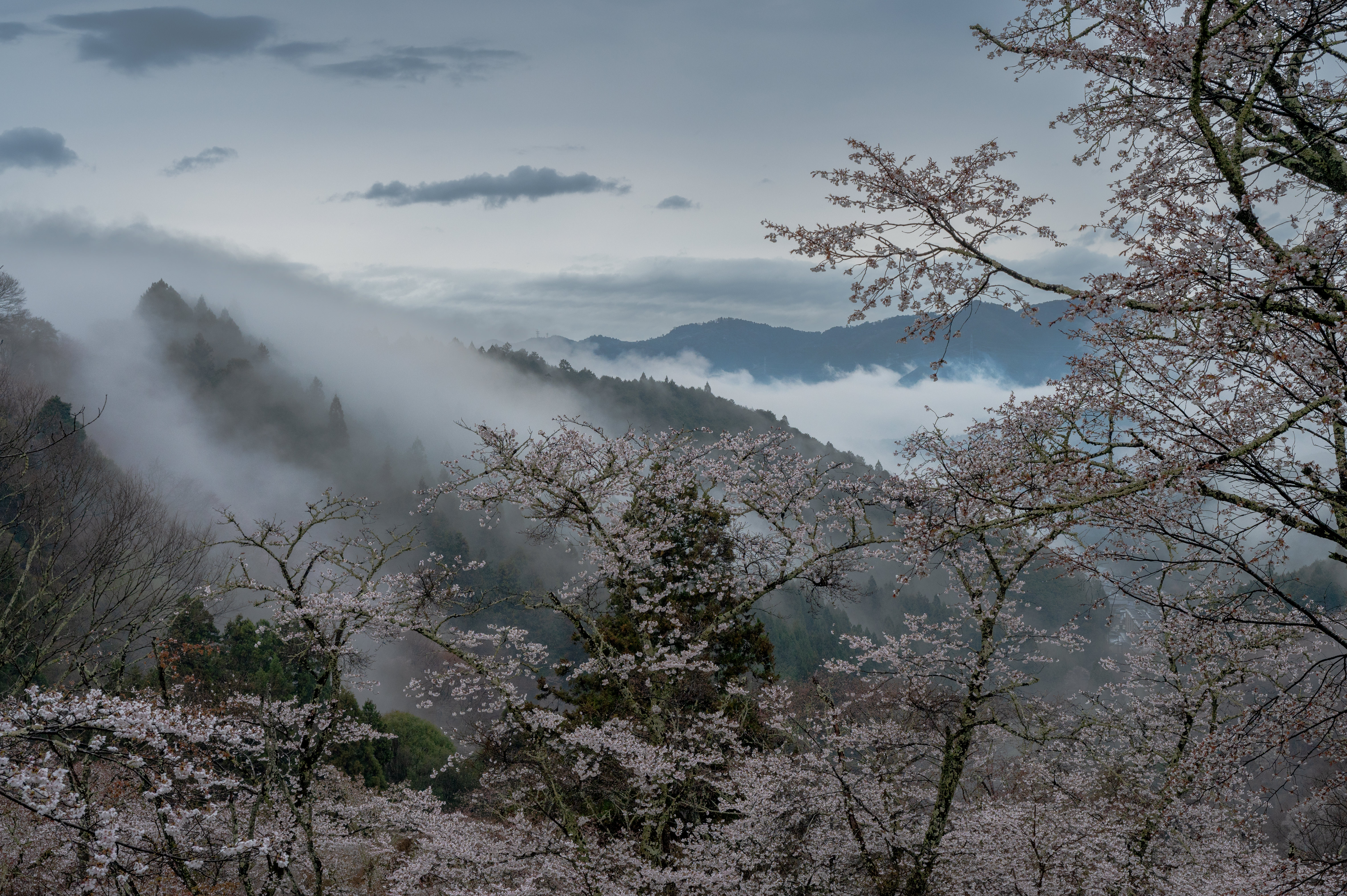 吉野山中千本の写真です。この日は降ったりやんだりの雨。