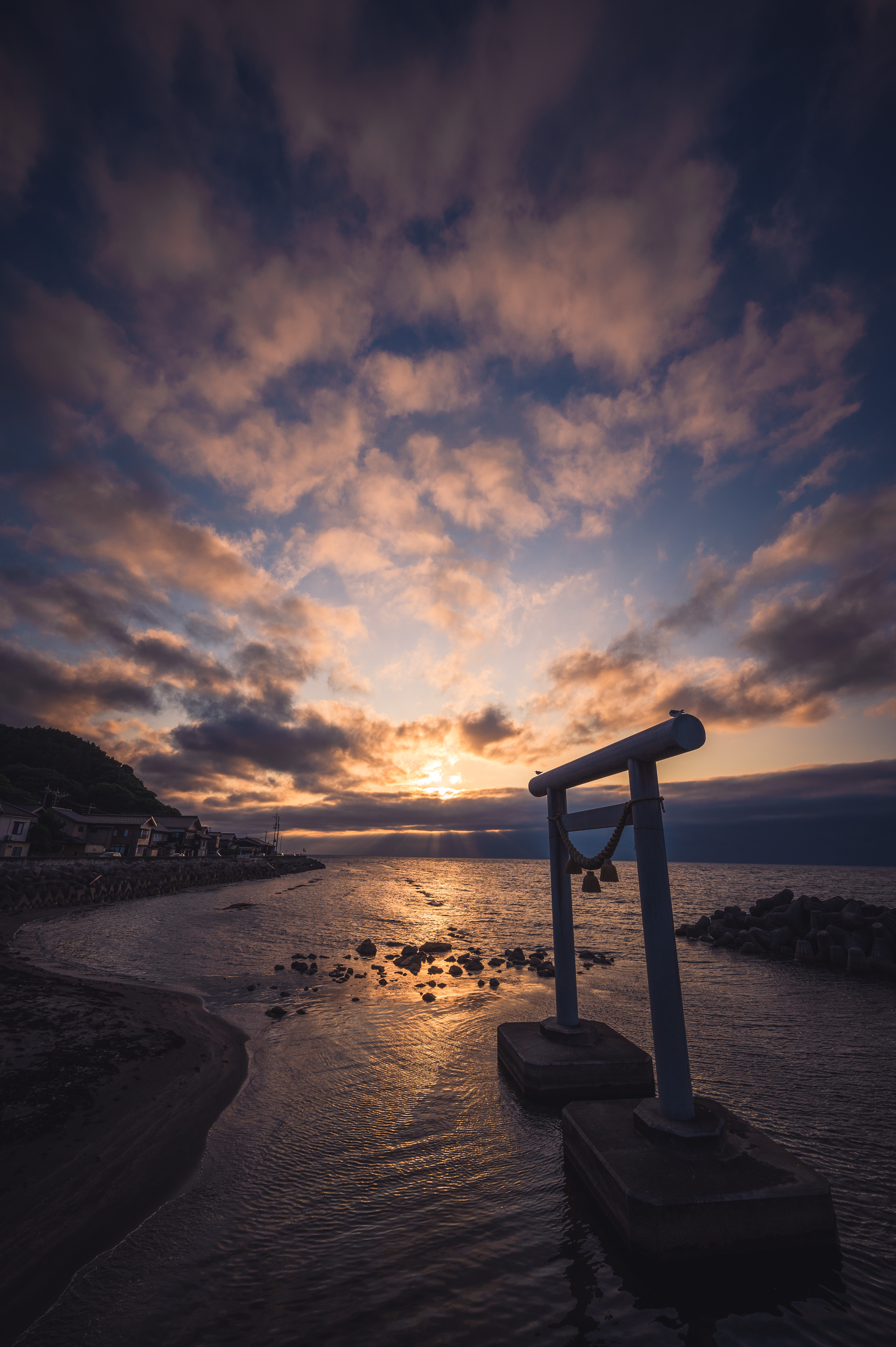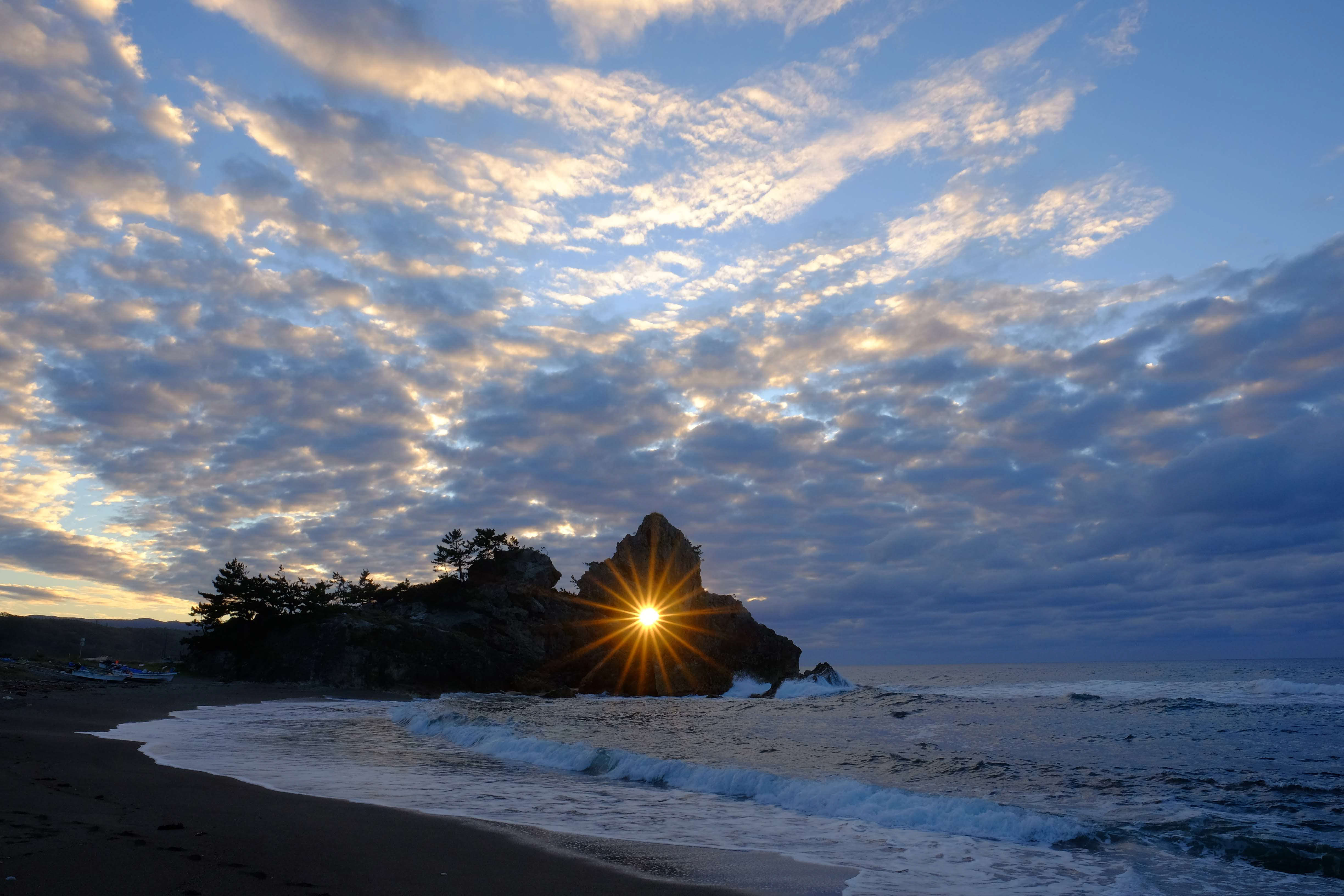 石川県輪島市曽々木海岸「窓岩」の窓の中に太陽が入ったところを撮影しました。
