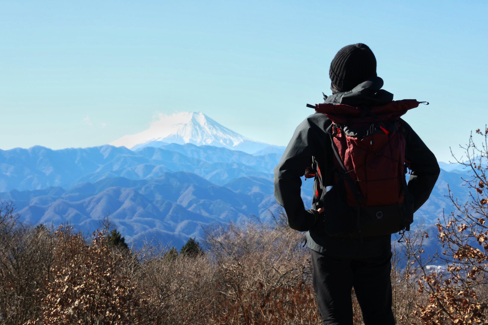 陣馬山から見える富士山をバックに友人を撮影