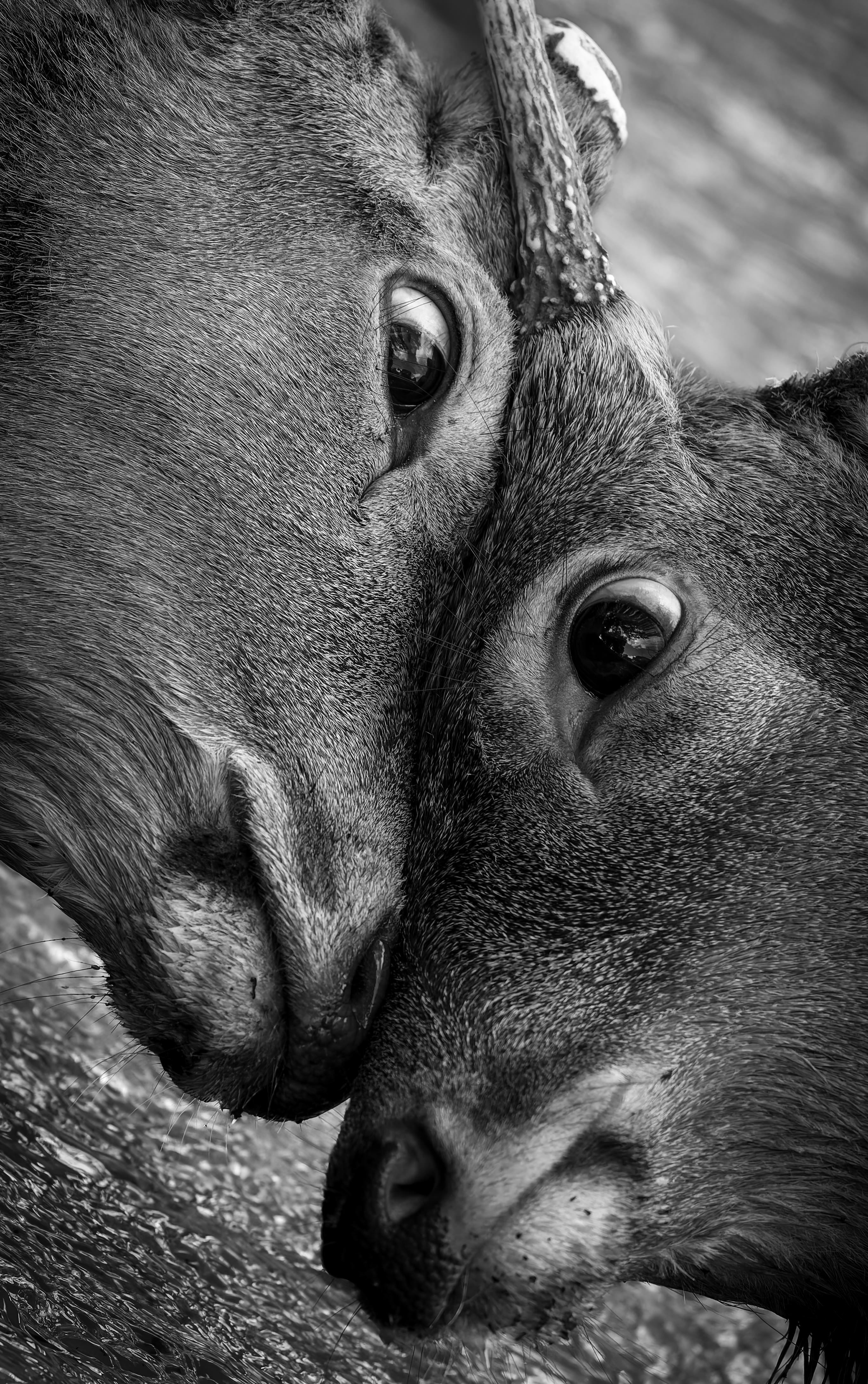 雄鹿2頭が池の中で喧嘩していた。鬼の形相でぶつかり合っており、その表情に生命力を感じ注目したかった。