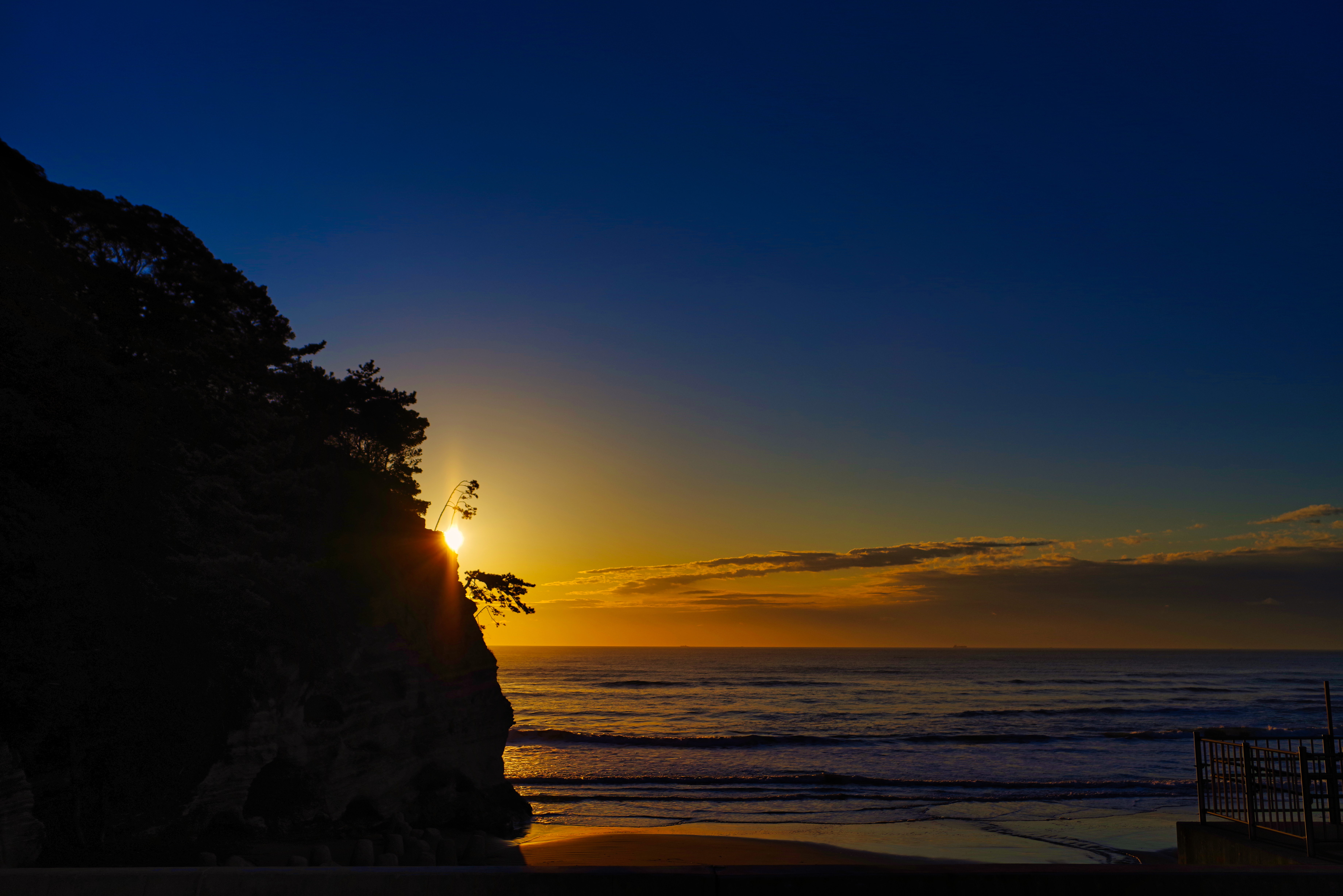 干潮と凪が重なり、空が夕陽で色づき始めたので長秒露光で撮影しました。