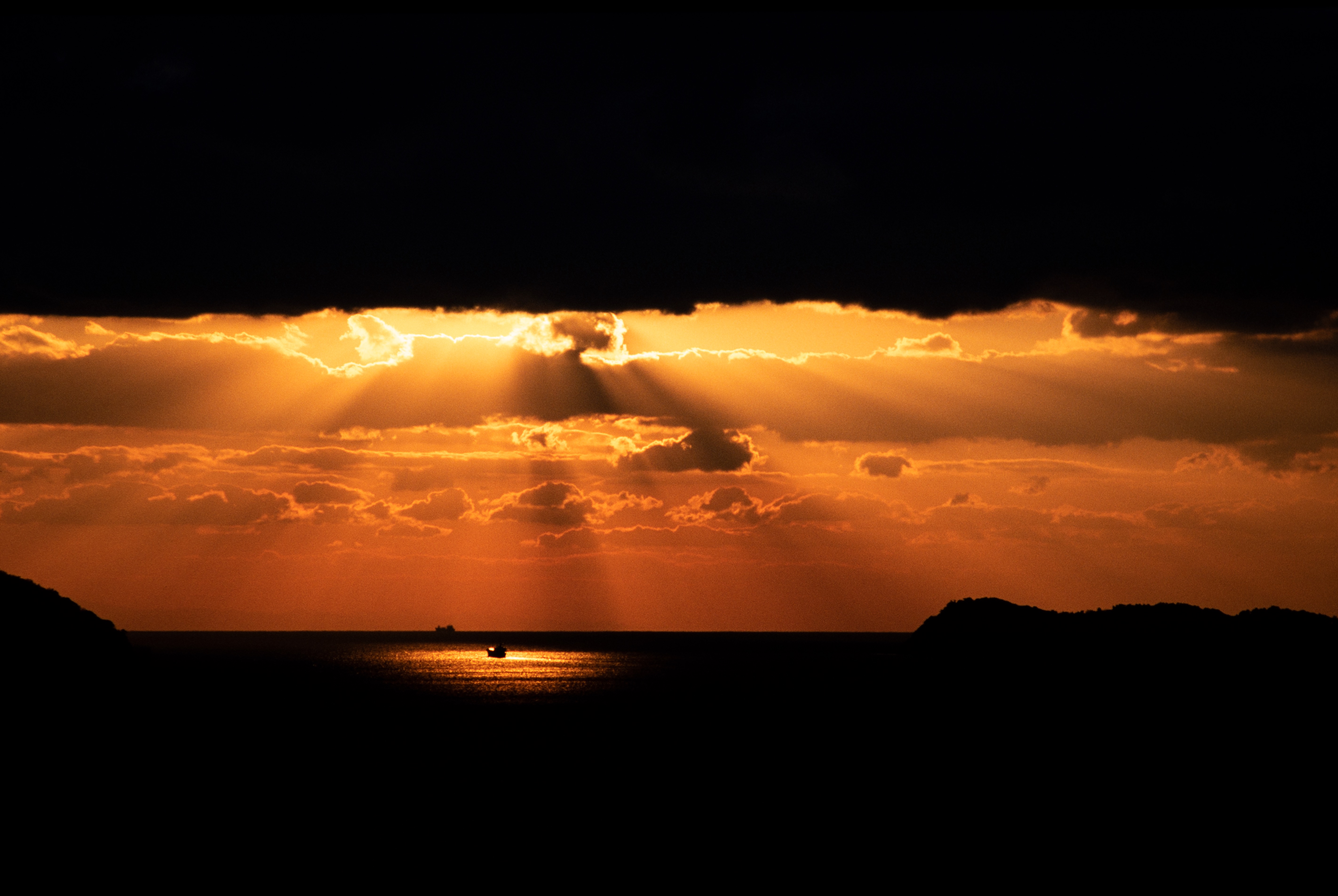 笠戸島へ旅行した際、雲の向こうに夕日が降りてきました。光芒の光の中にちょうど船がさしかかった時シャッターを切りました。