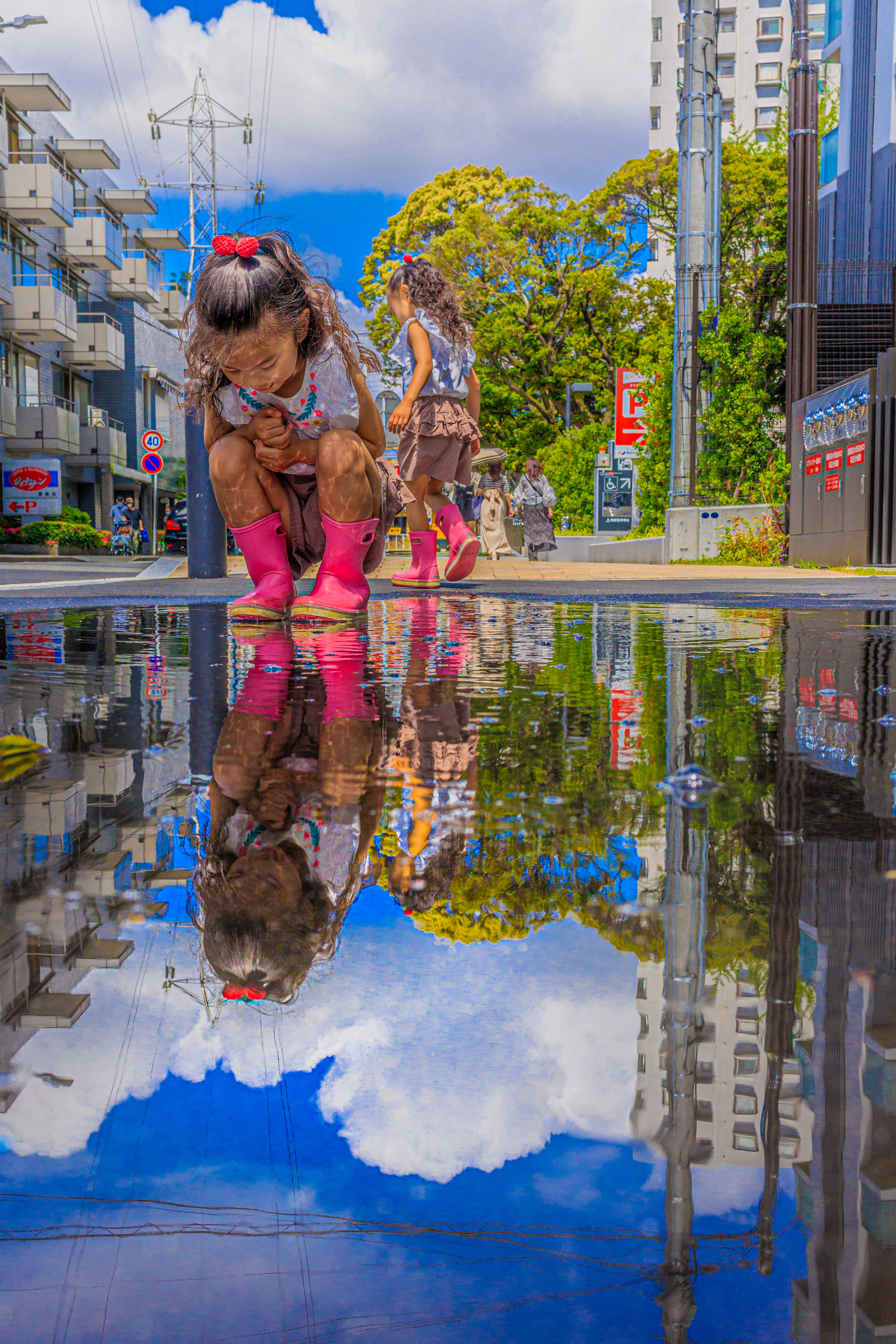 朝から雨が降り、外に遊びに行きたがっていた娘が雨上りに家から飛び出して行った際の写真です。自分からは娘と青空が水たまりに映り込んできれいでした。娘の視点からはどんな世界が広がっていたのか...(^^)