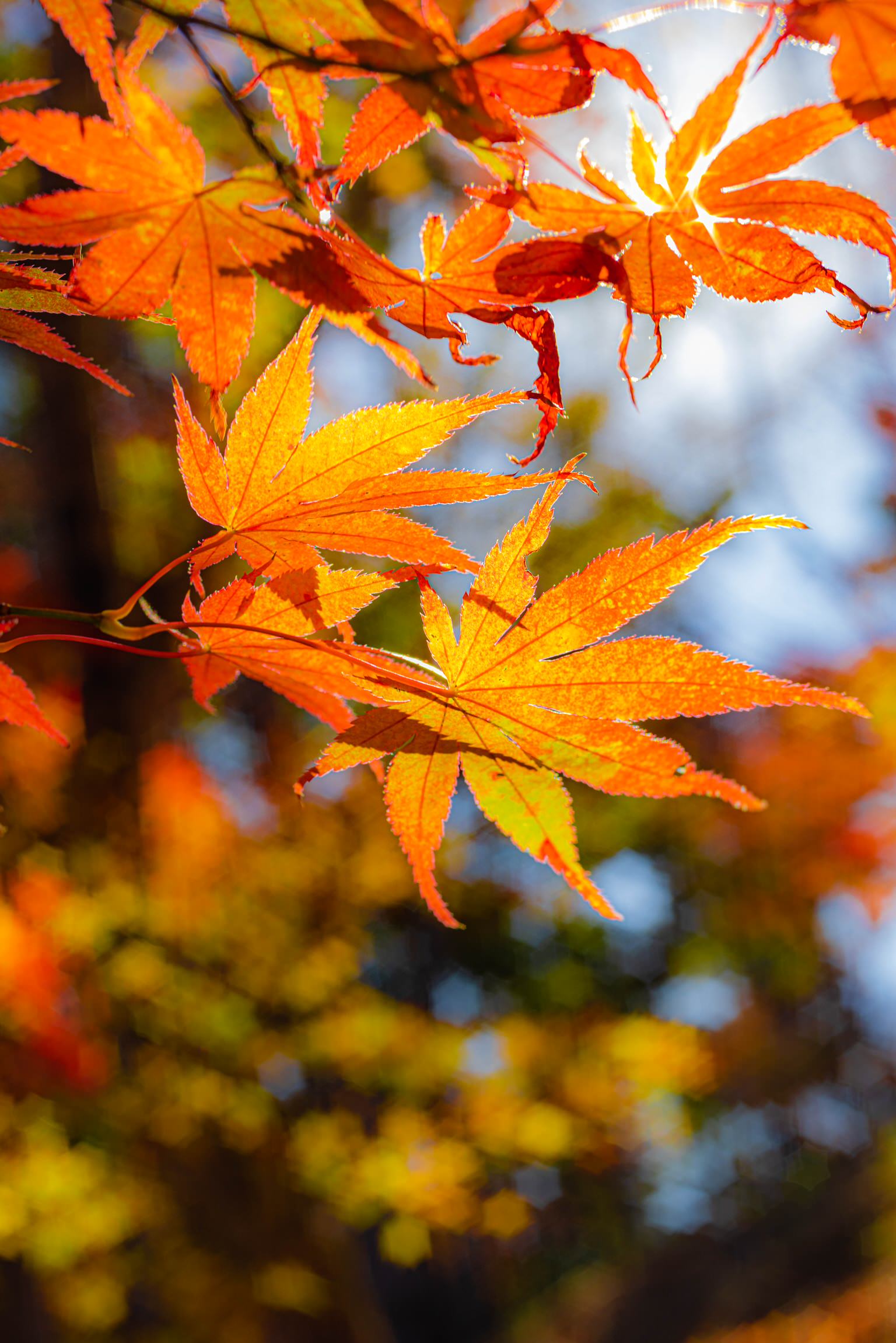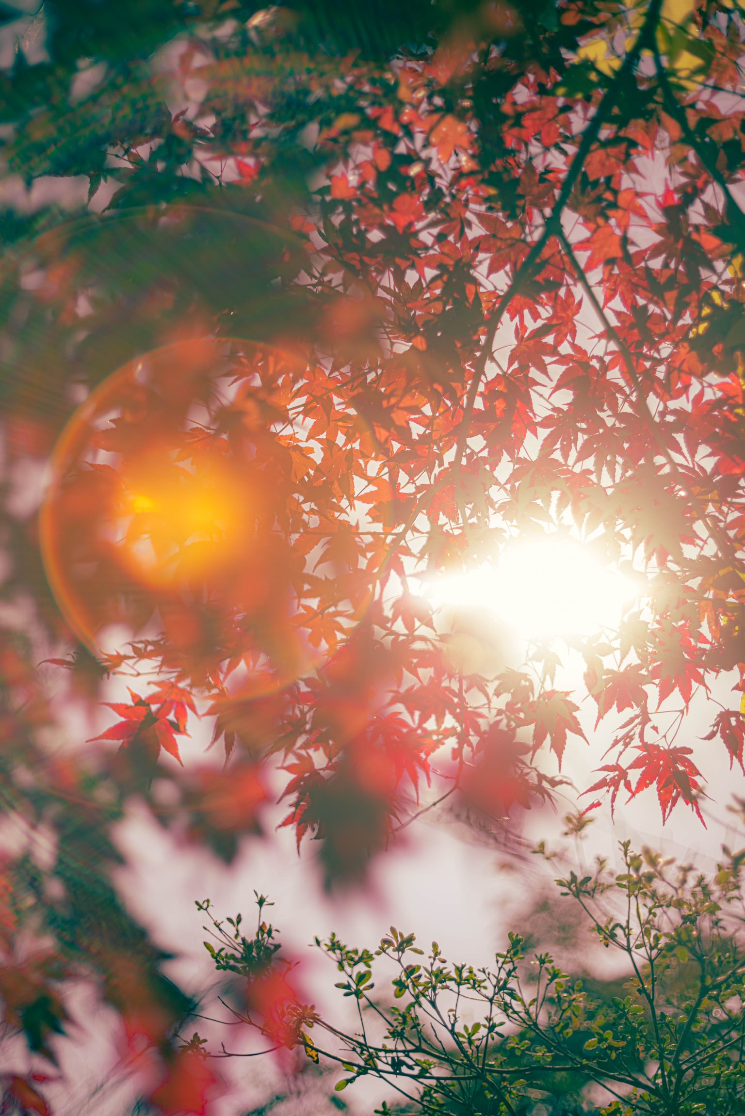 色とりどりの落ち葉に朝日が差し込んできたところです