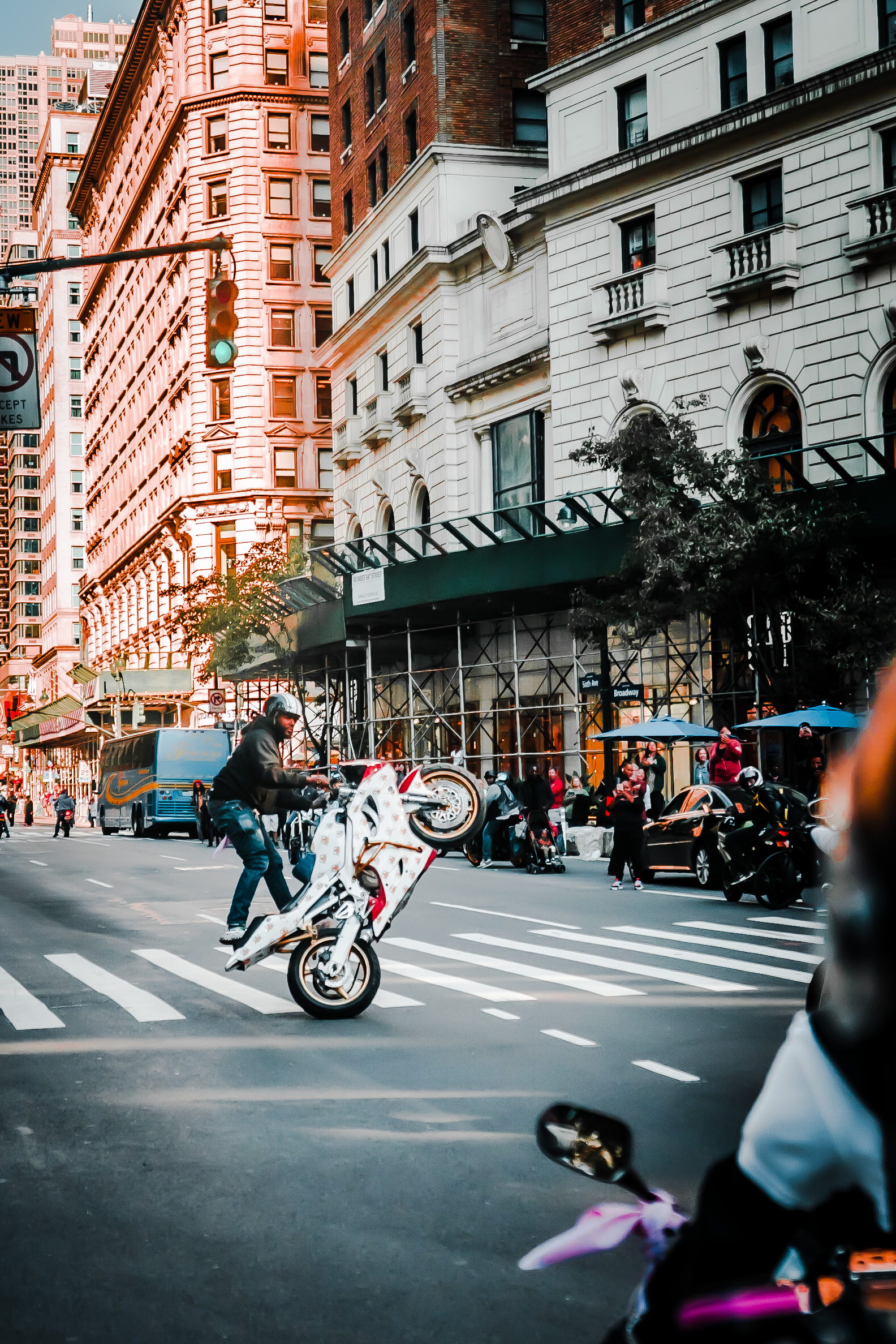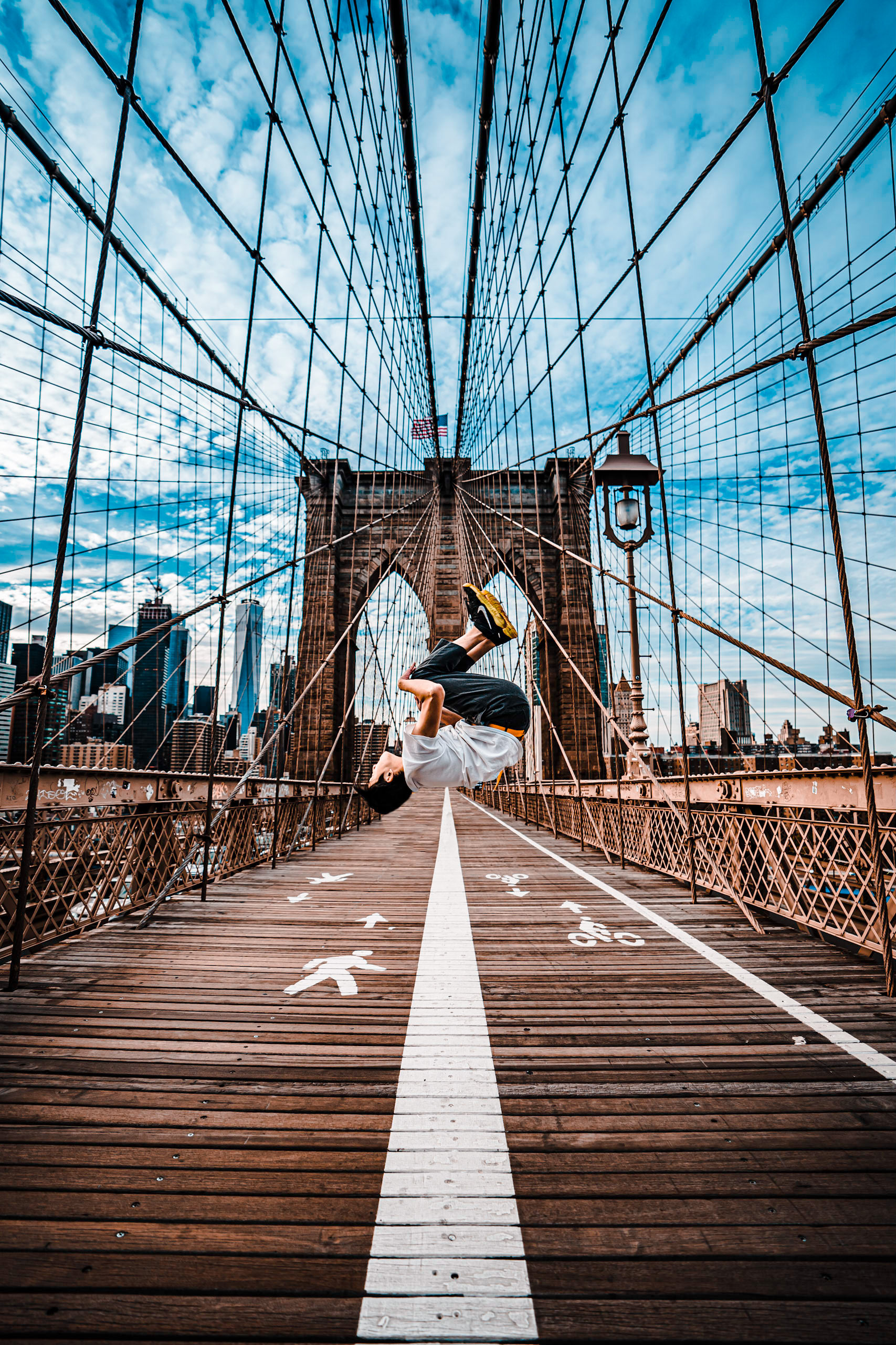 ブルックリンブリッジは有名な橋で人通りも多く、バク宙するタイミングはなかなかありませんでしたが、この一瞬だけ前も後ろも人が通っていませんでした。この一回の連写で捉えた渾身の決定的瞬間です。