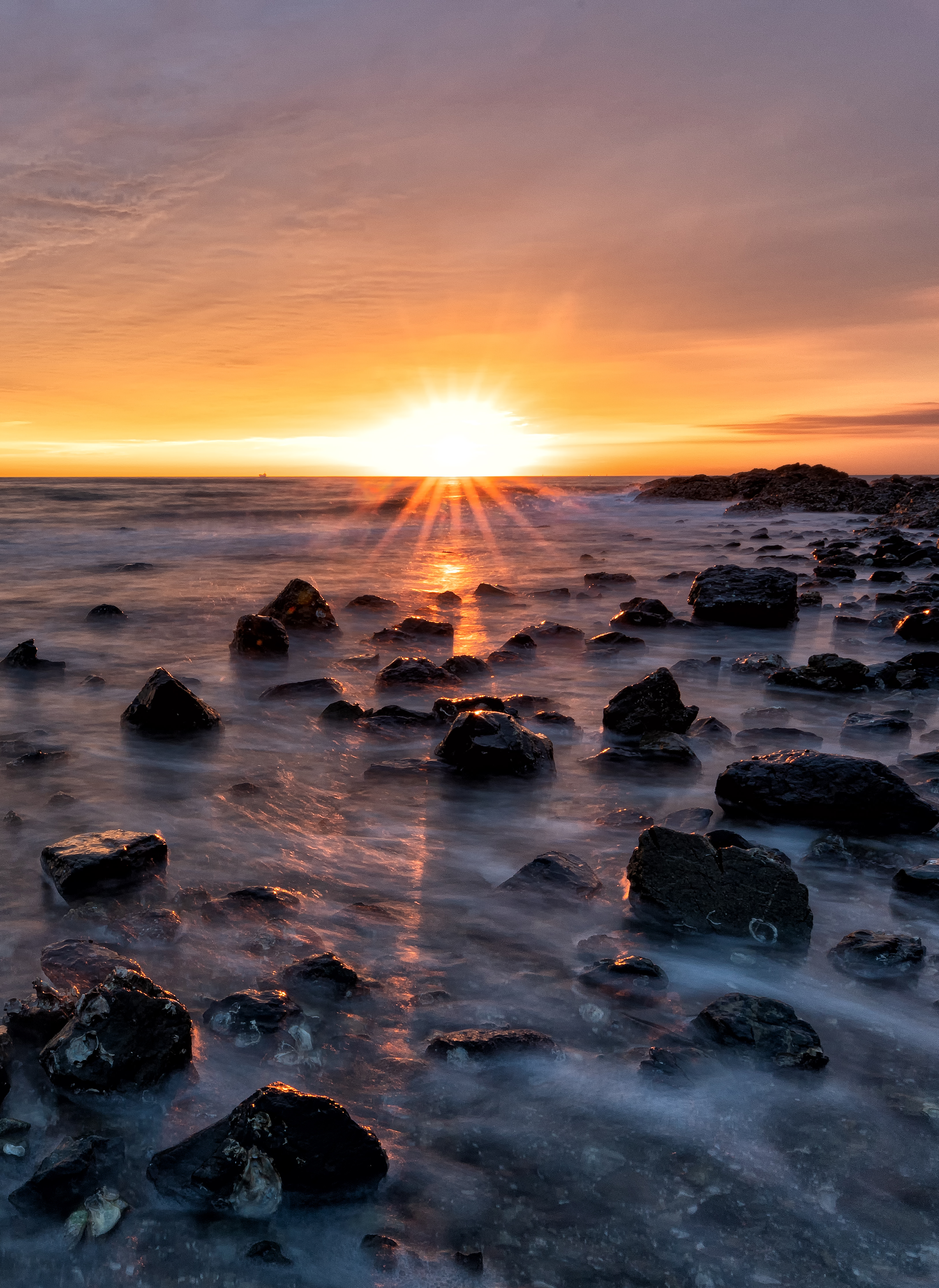 朝焼けの空、太陽がとても綺麗で、波や岩の流れがそこに向かう旅路のように感じました。
