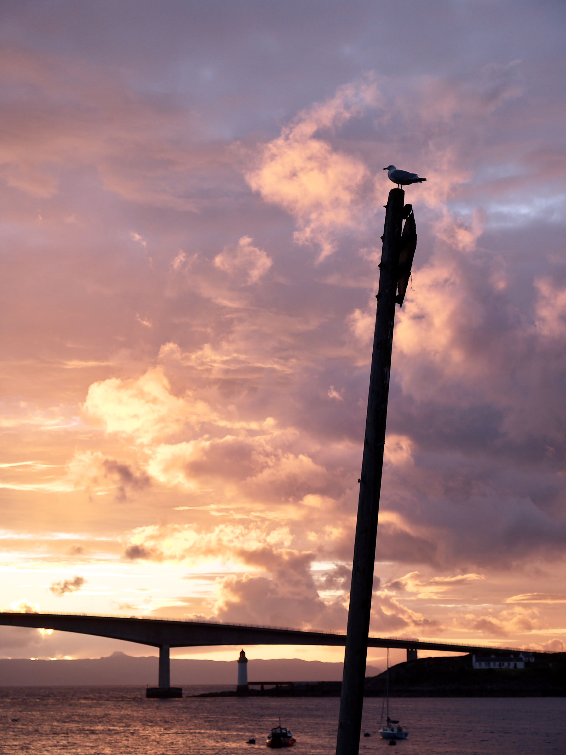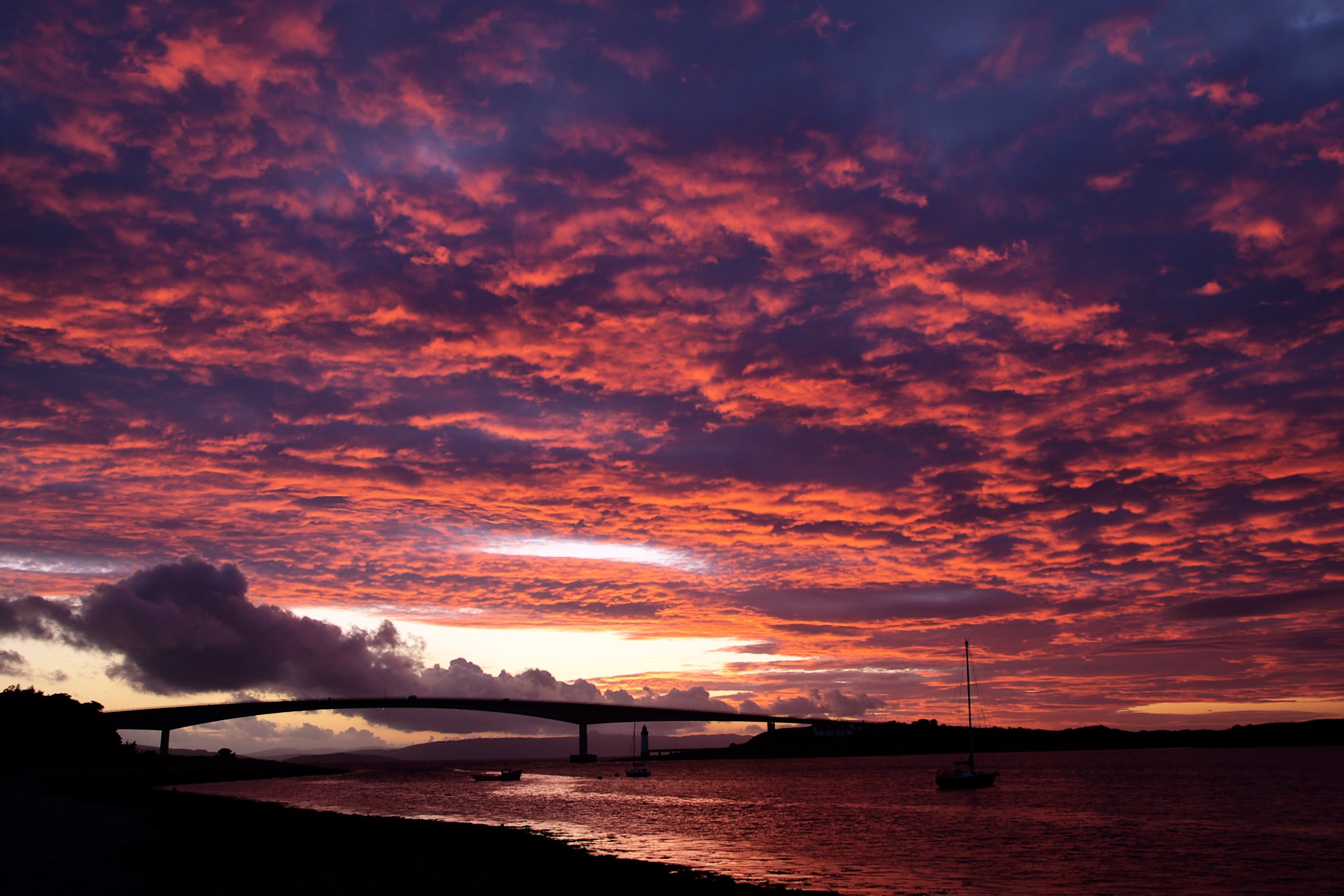スカイに到着してすぐ海辺のホテルでチェックインしていた時に、夕焼けがきれいだよということで急いで外に出てみました。記憶では自分が見た夕焼けの中で一番ドラマチックなものでした。下奥に見えるのは直前に通ってきた本土と島を繋ぐスカイ・ブリッジです。