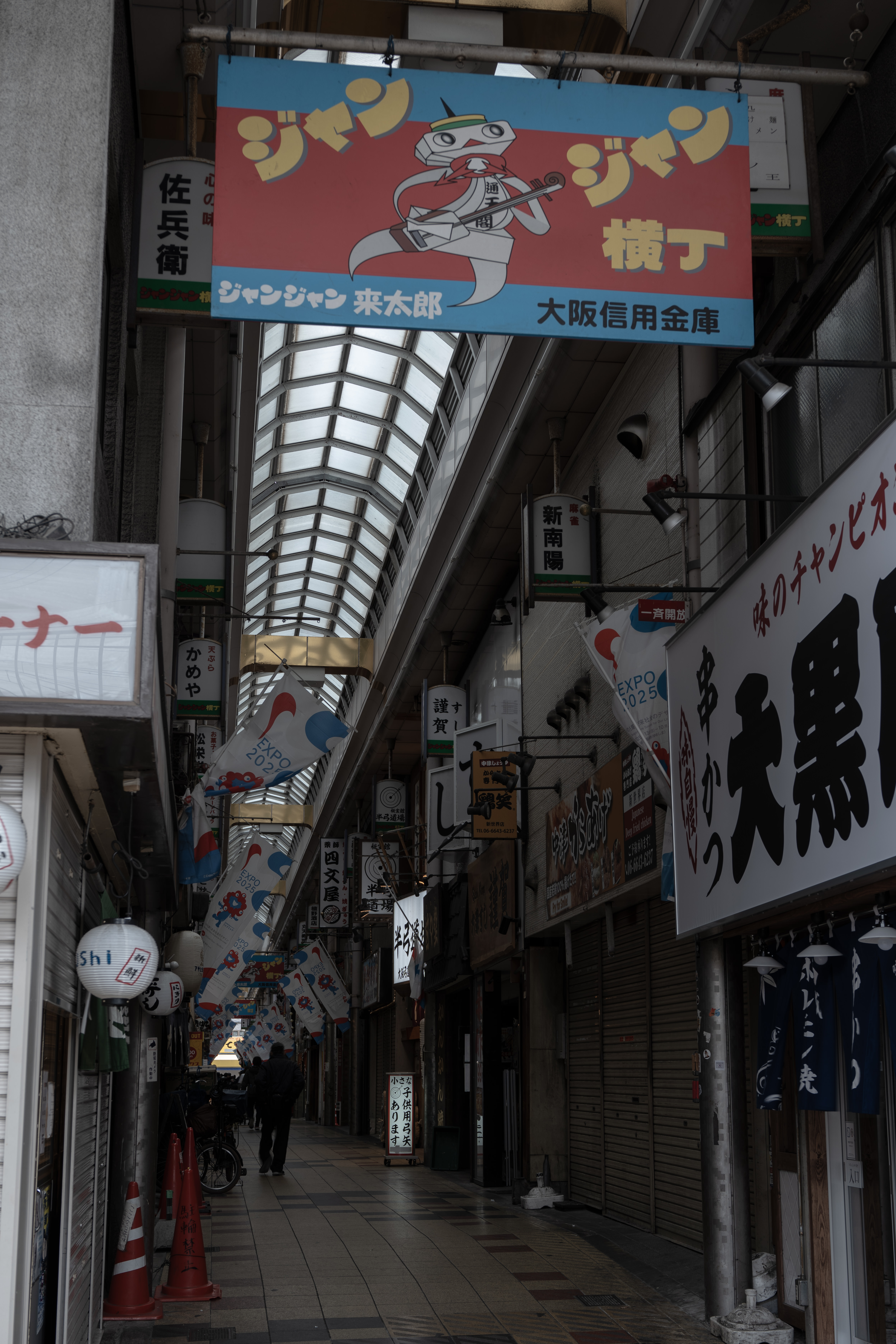 外国人の観光スポットとなって賑わっている新世界のジャンジャン横丁ですが、朝早い時間に行ったら寂れた商店街みたいで、昭和の頃のレトロな雰囲気が出ていて個人的に好きな絵になります。万博はもう終わってますが・・・(^_^;)