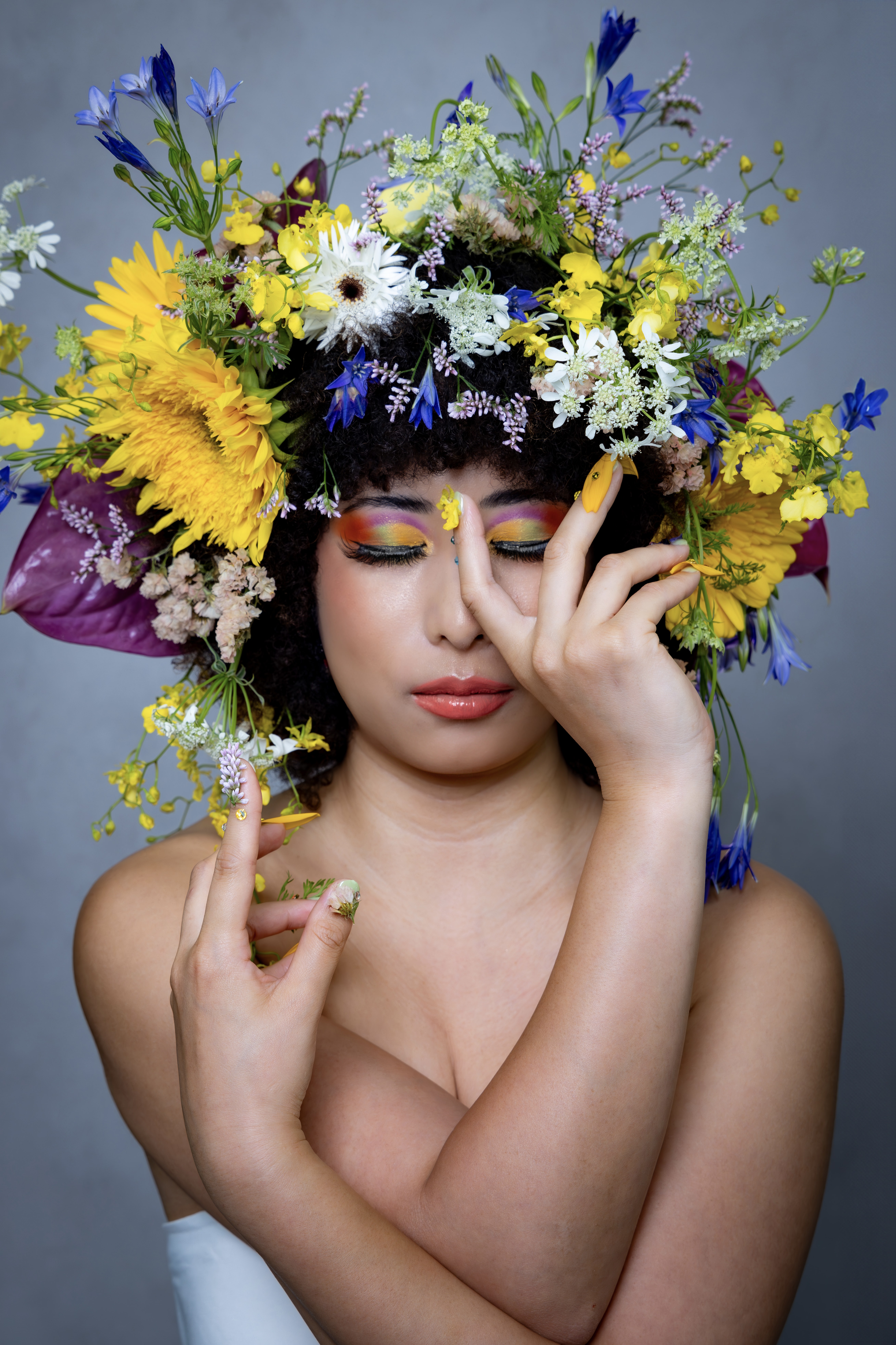 アフロヘアに花を生け、メイク、ネイルでバランスをとった夏のイメージの中にある洗練された上品さと華やかさを表現しました!