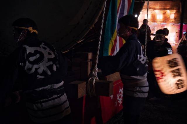 夏祭りで演舞を見る少女。人混みの中に入り込んだ松明の光がうっすらと顔を照らしている。
