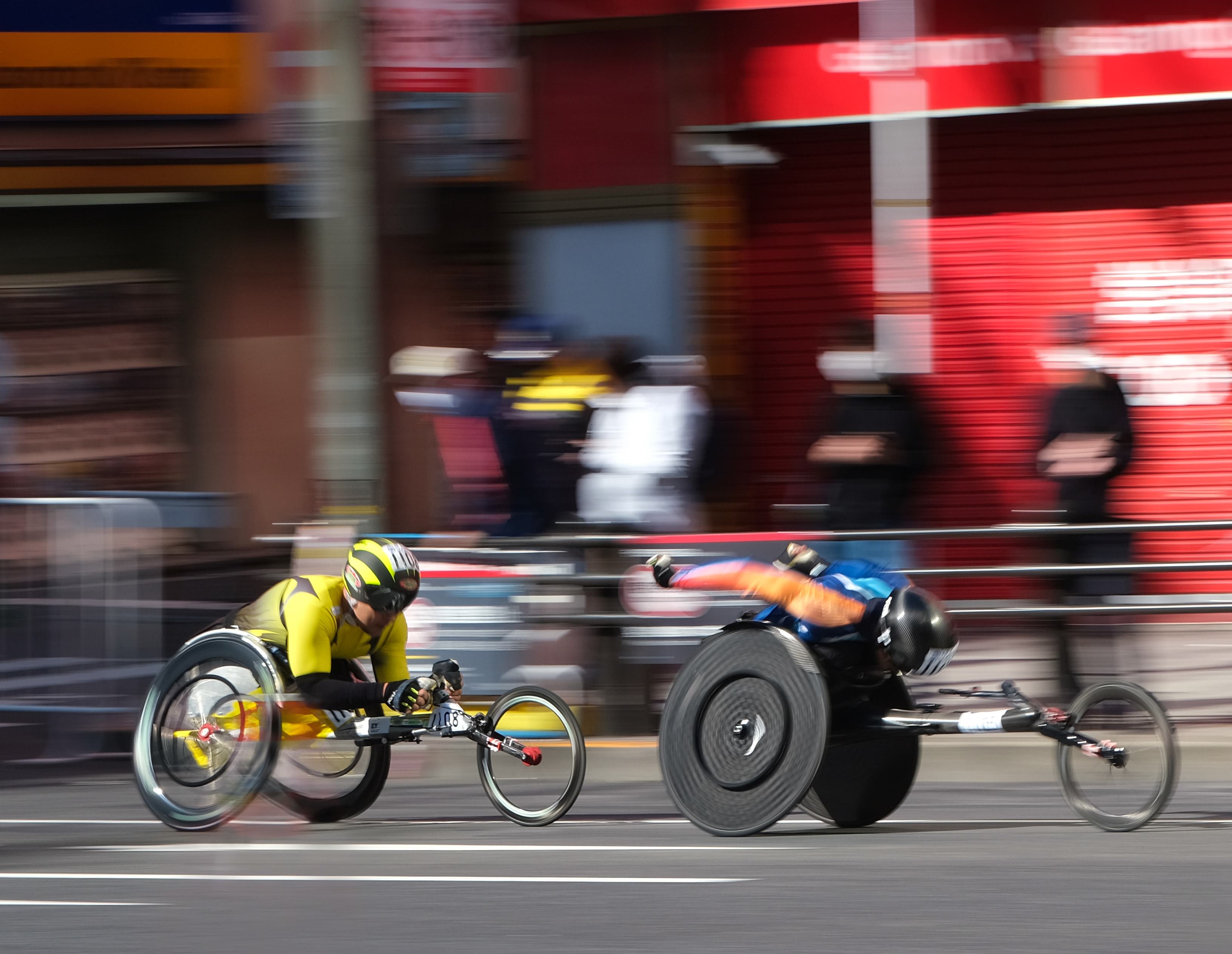 東京マラソン、車いすの部のレースを秋葉原駅付近で撮影。赤いジャケットに白い車いす、ダイナミックに爆走する姿が印象的なレーサーを見つけ、流し撮りで動きが出るよう撮影した。