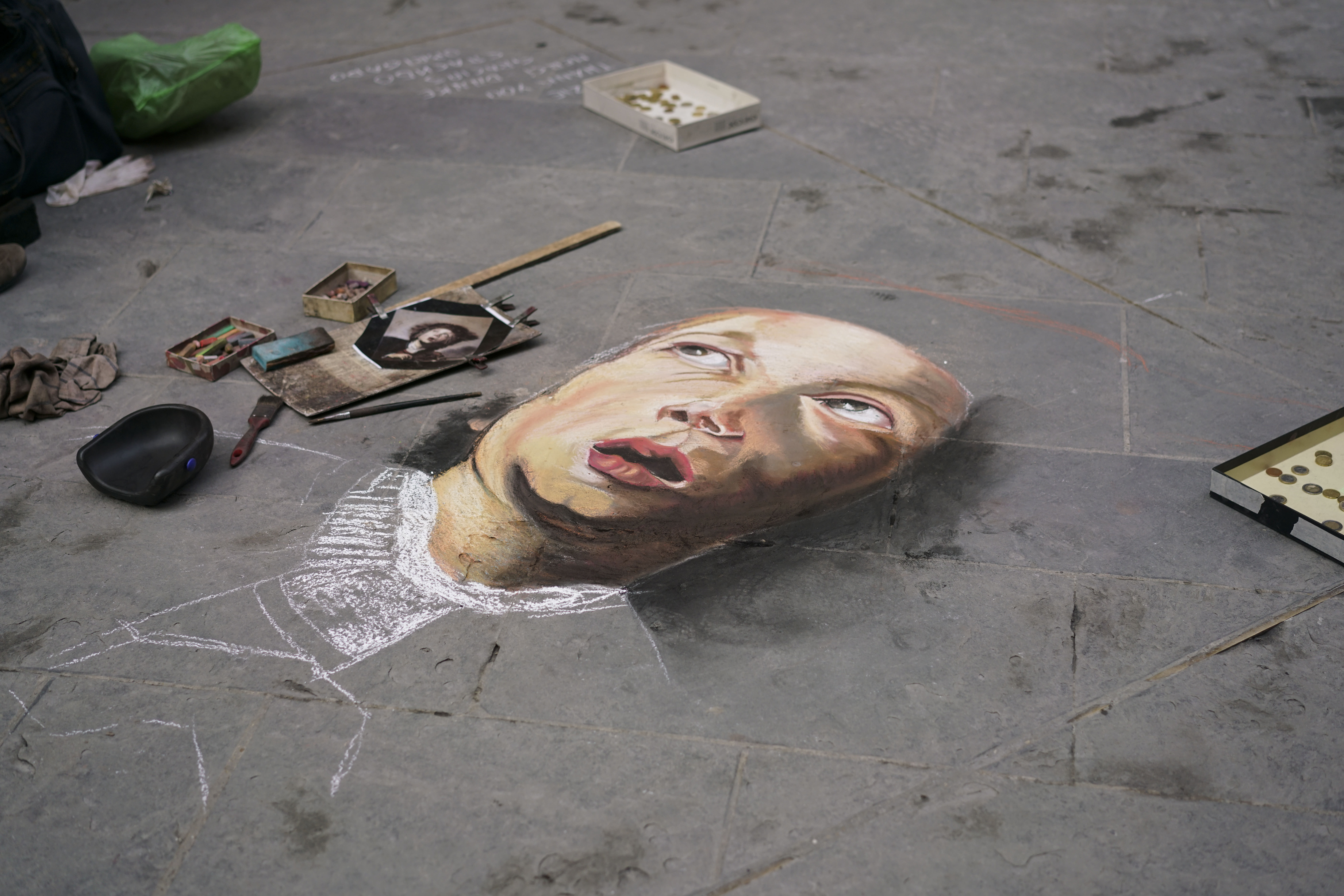 旅先で見かけた描きかけの顔。完成が気になりましたが、戻れませんでした。