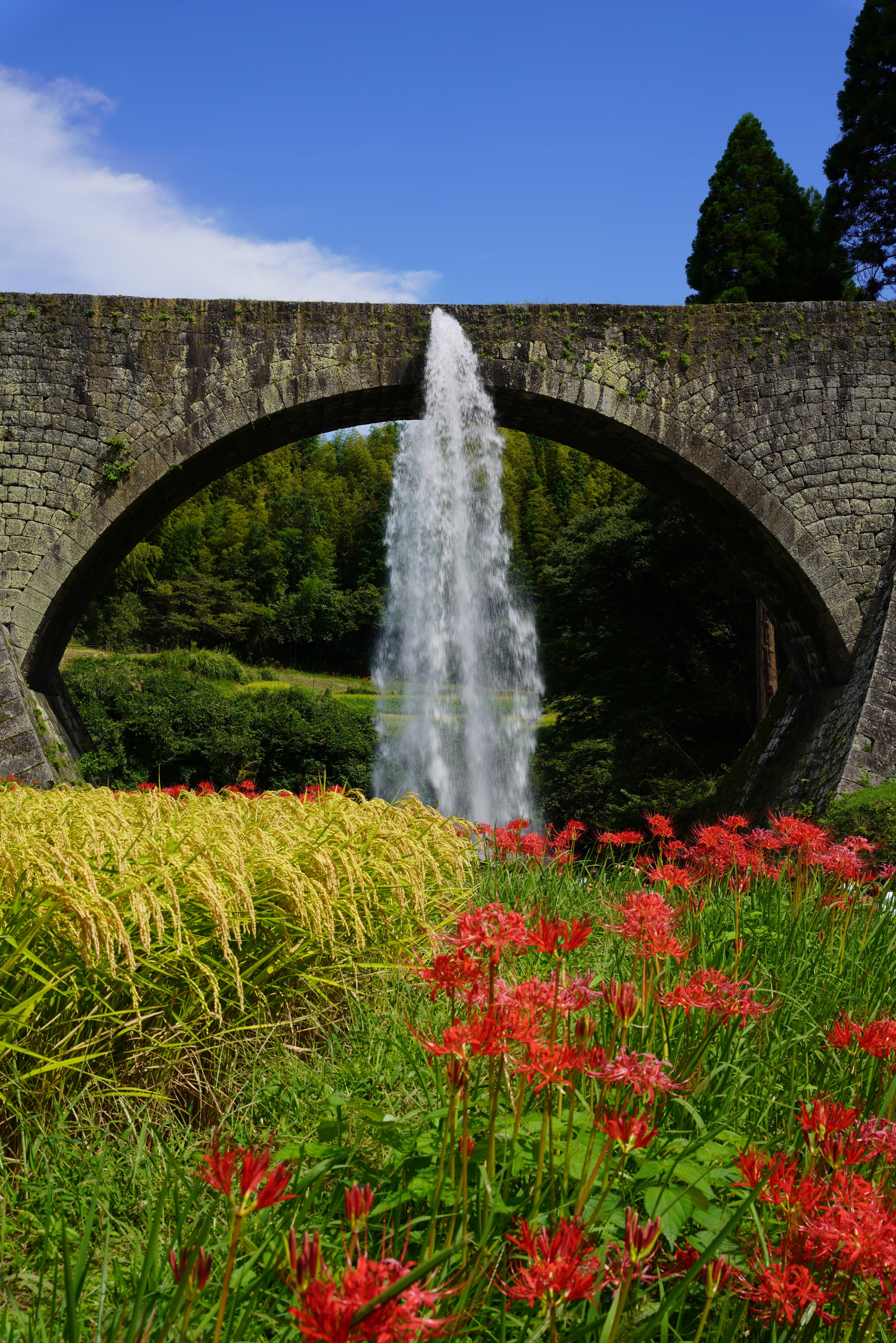 稲穂と彼岸花が色鮮やかな秋の晴れ空に、通潤橋の放水が気持ちよかったです!