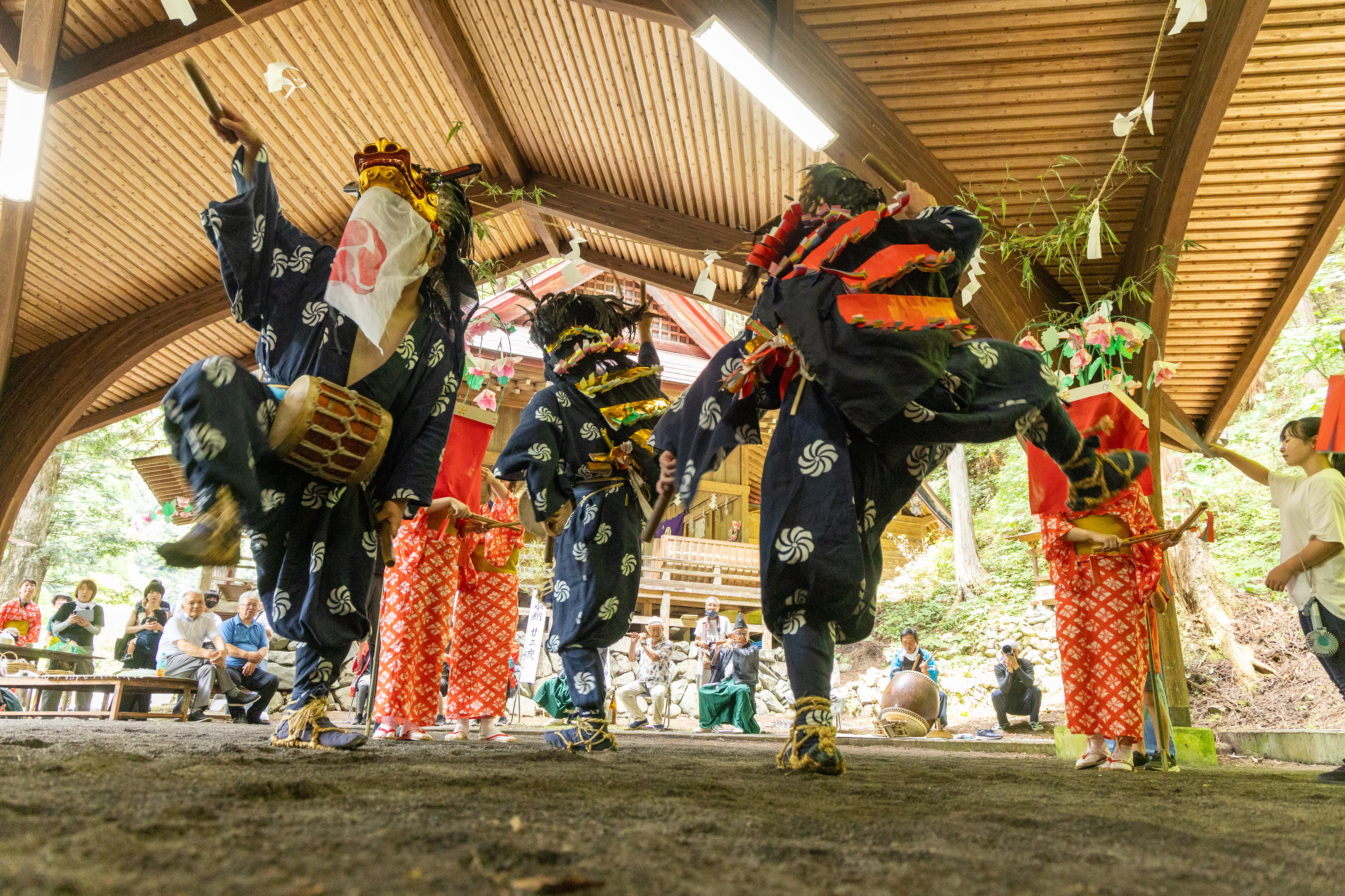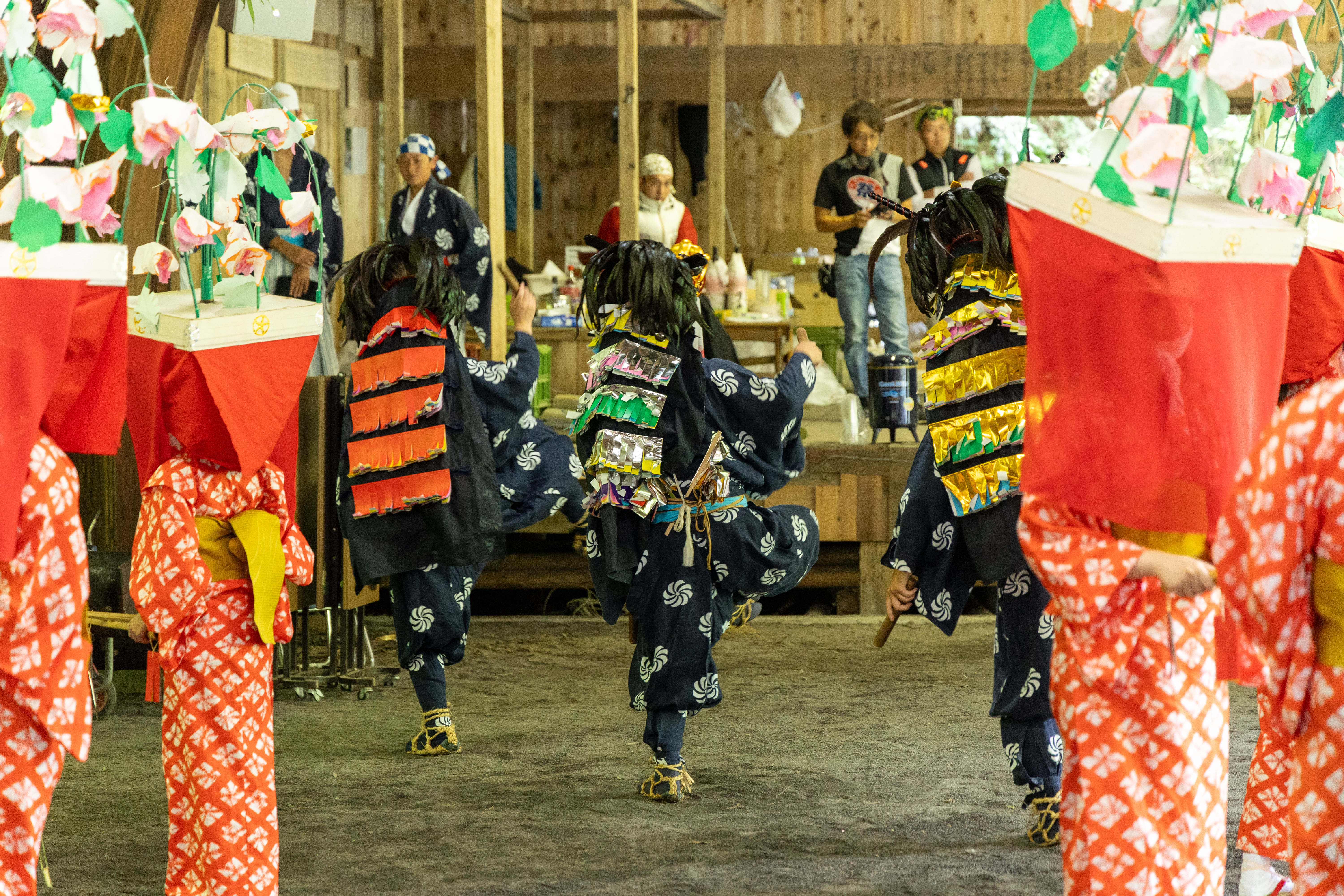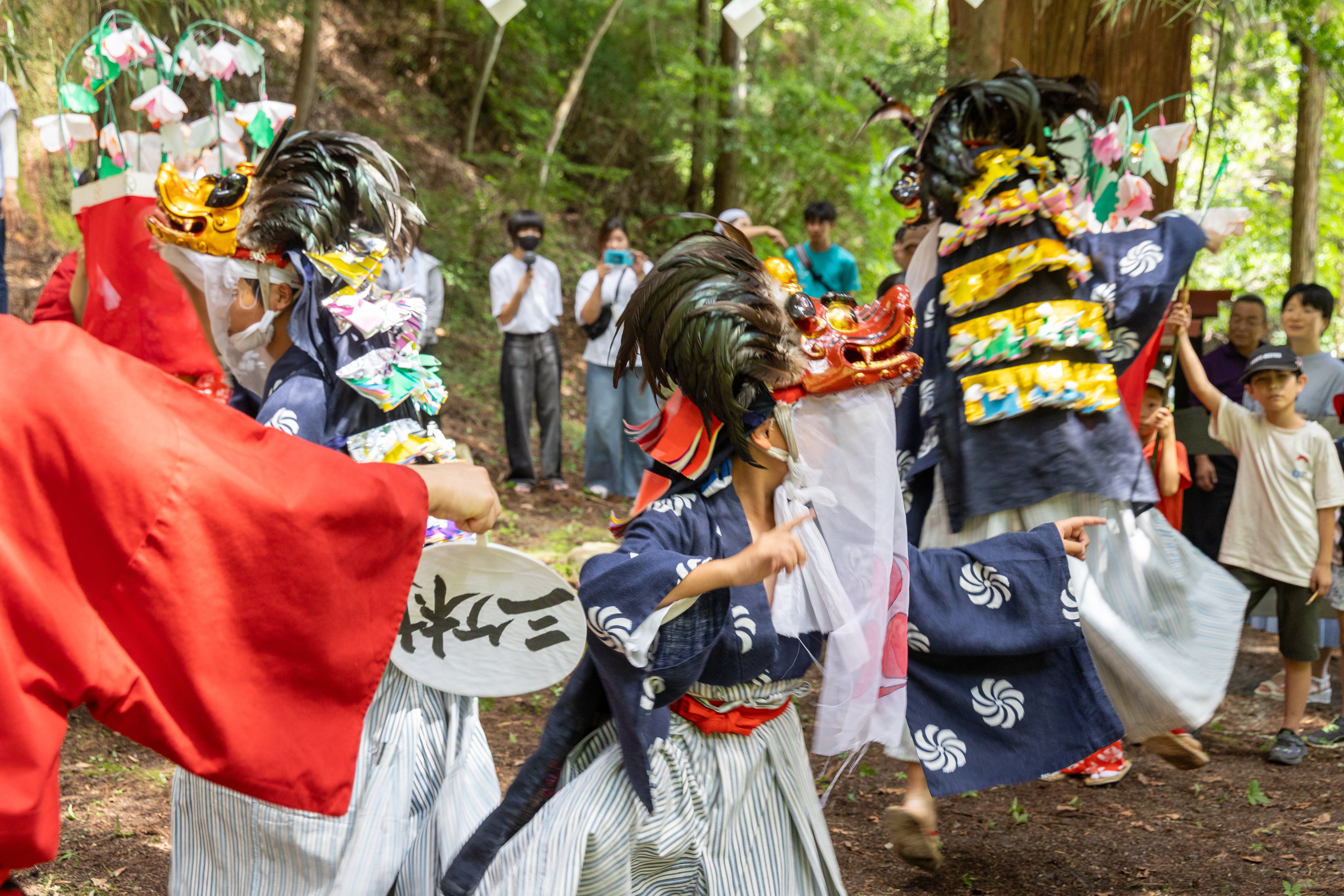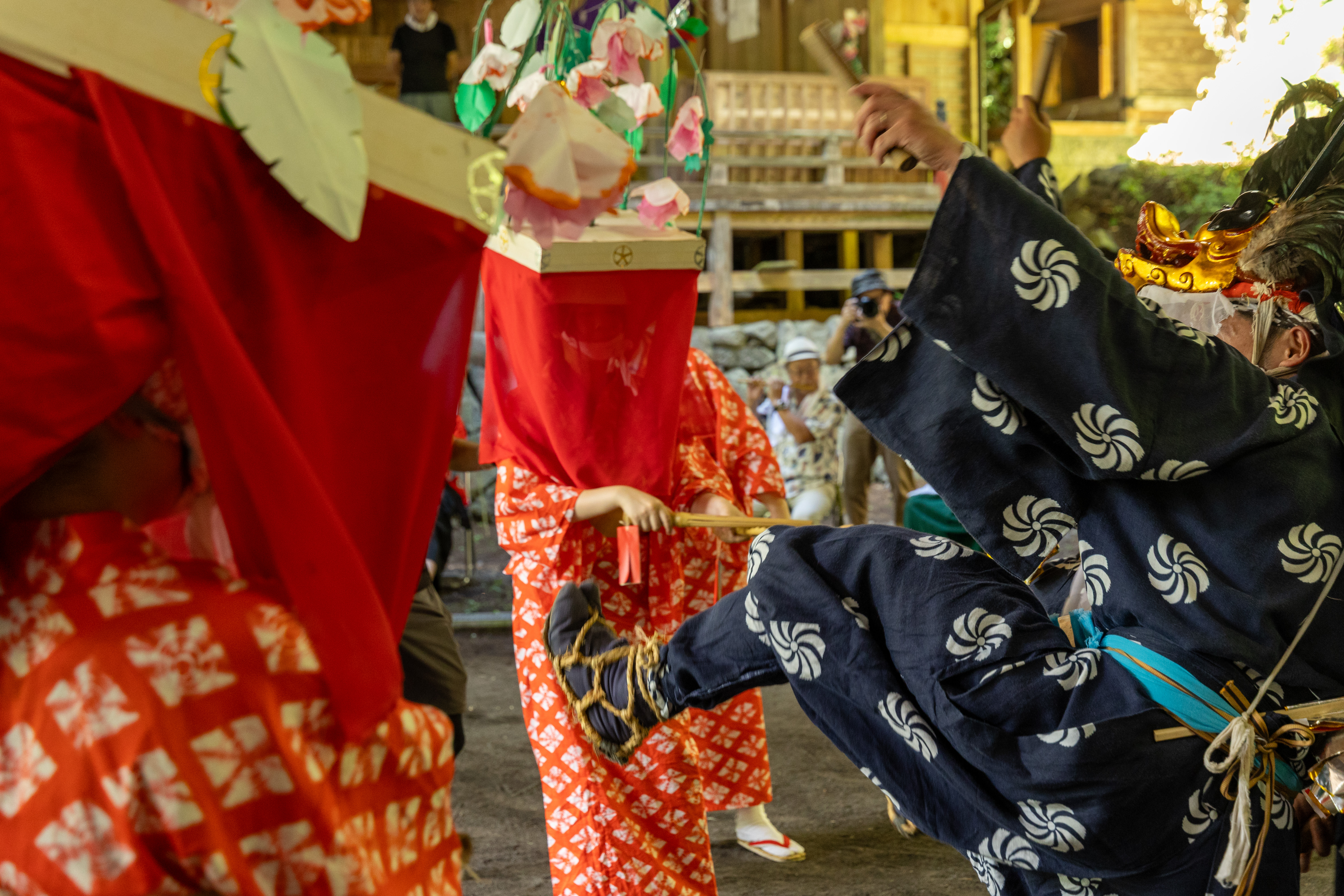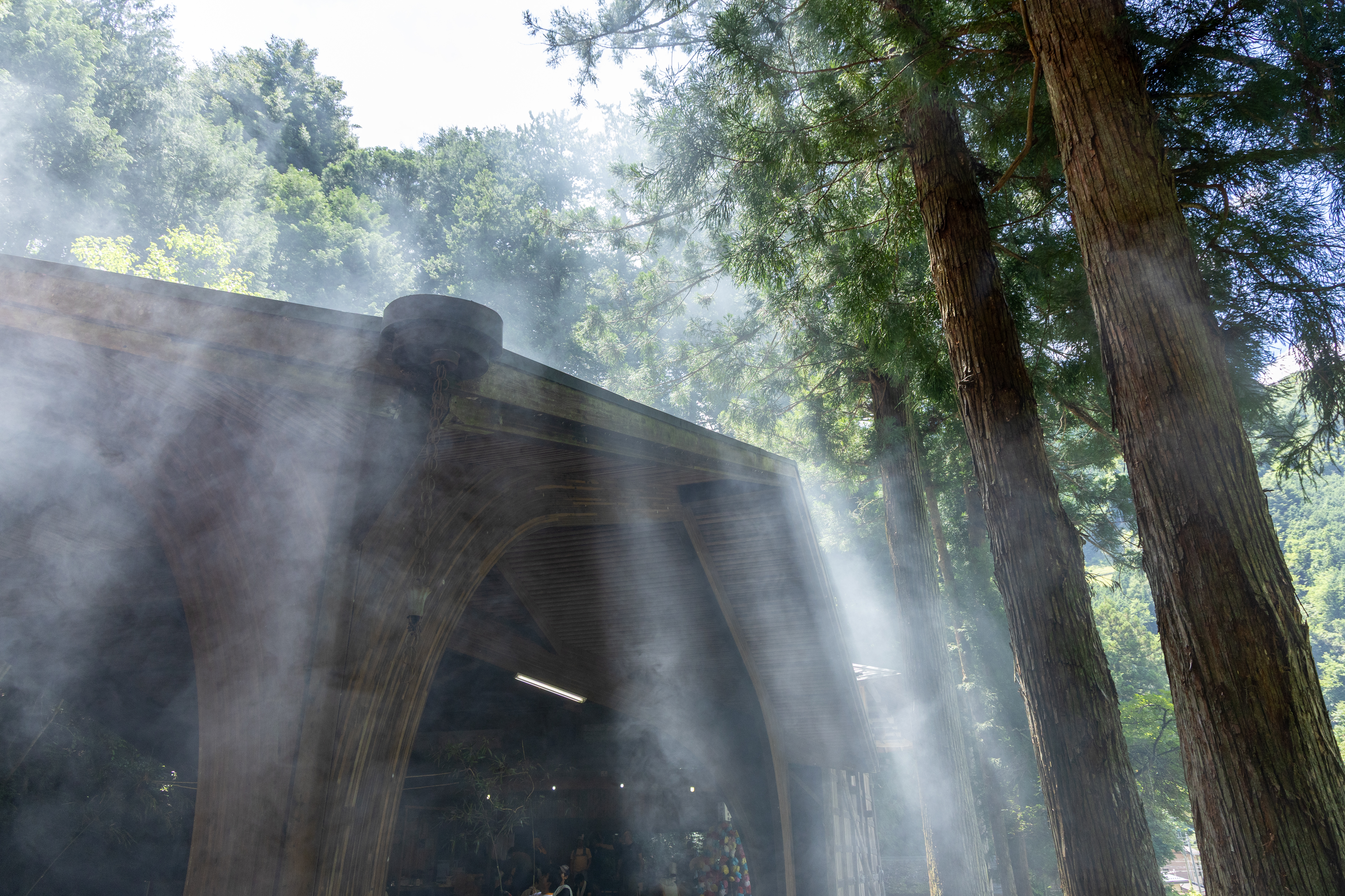 祭当日の朝。神社の掃除で出た松の葉や木々を燃やす。煙に朝日が差し込み光芒が。毎年これから祭が始まるんだなと感じる風景です。