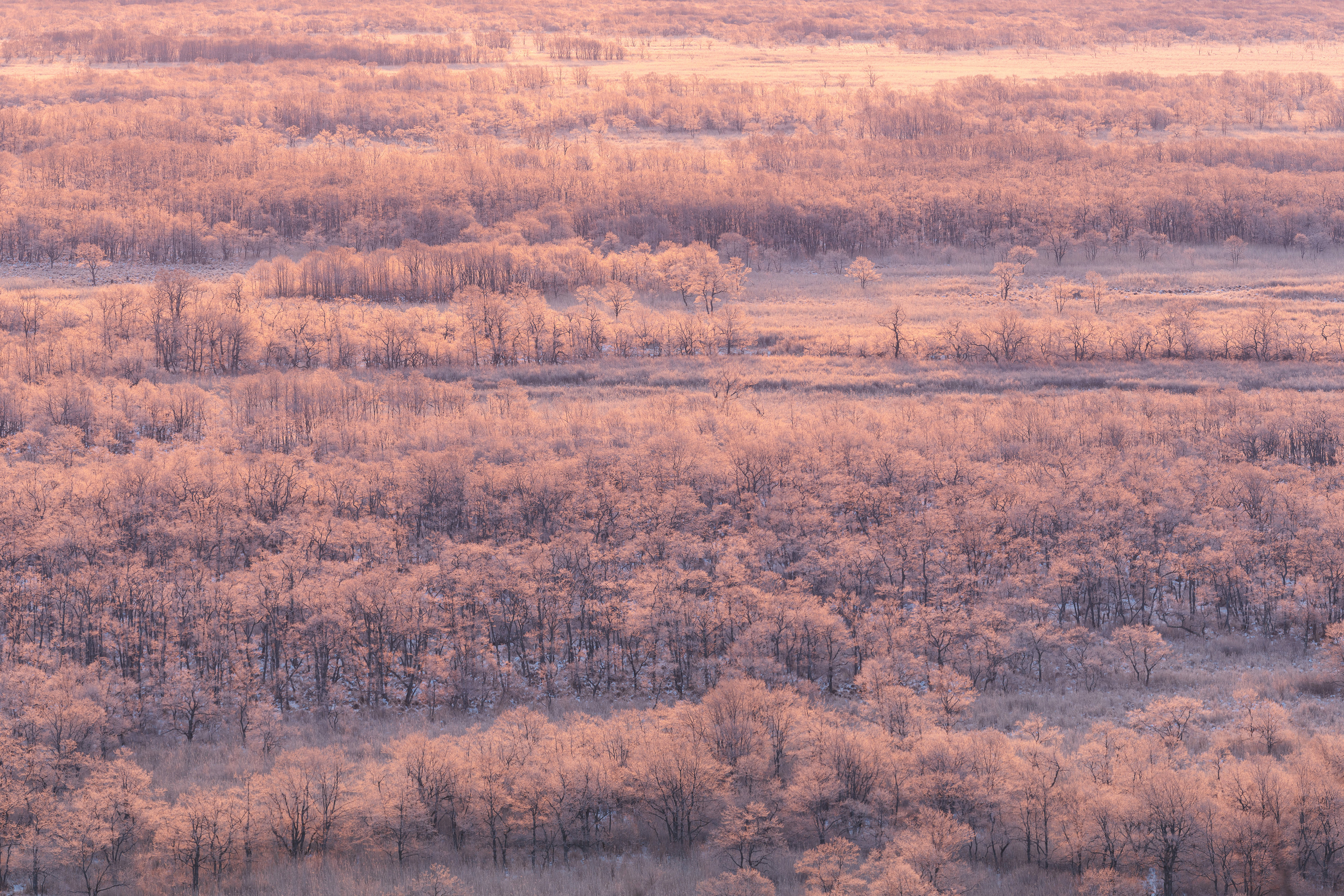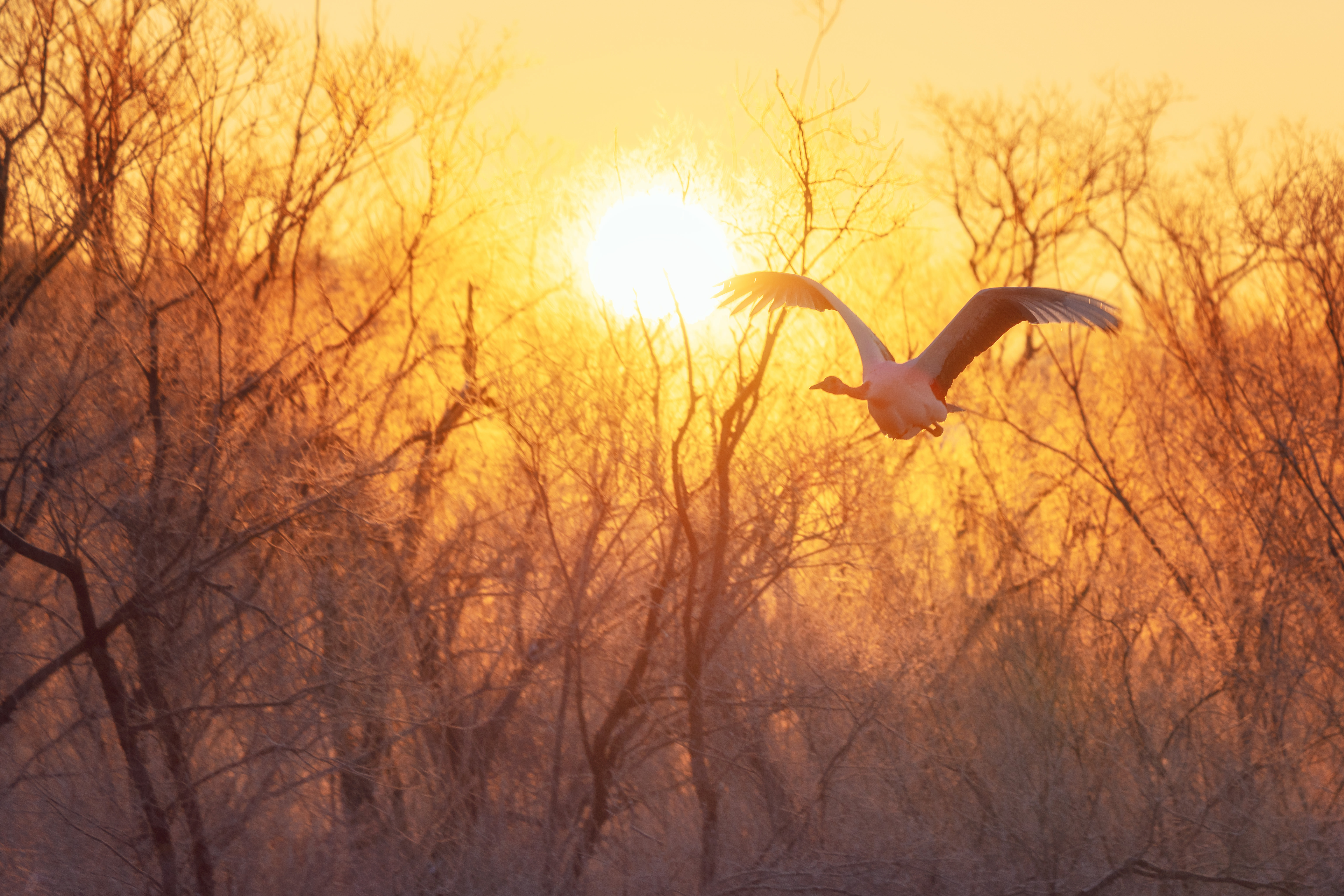 鶴居村音羽橋。 −15°の朝。一面霧氷で覆われた中、タンチョウが飛び立つ瞬間を朝日と撮れました。