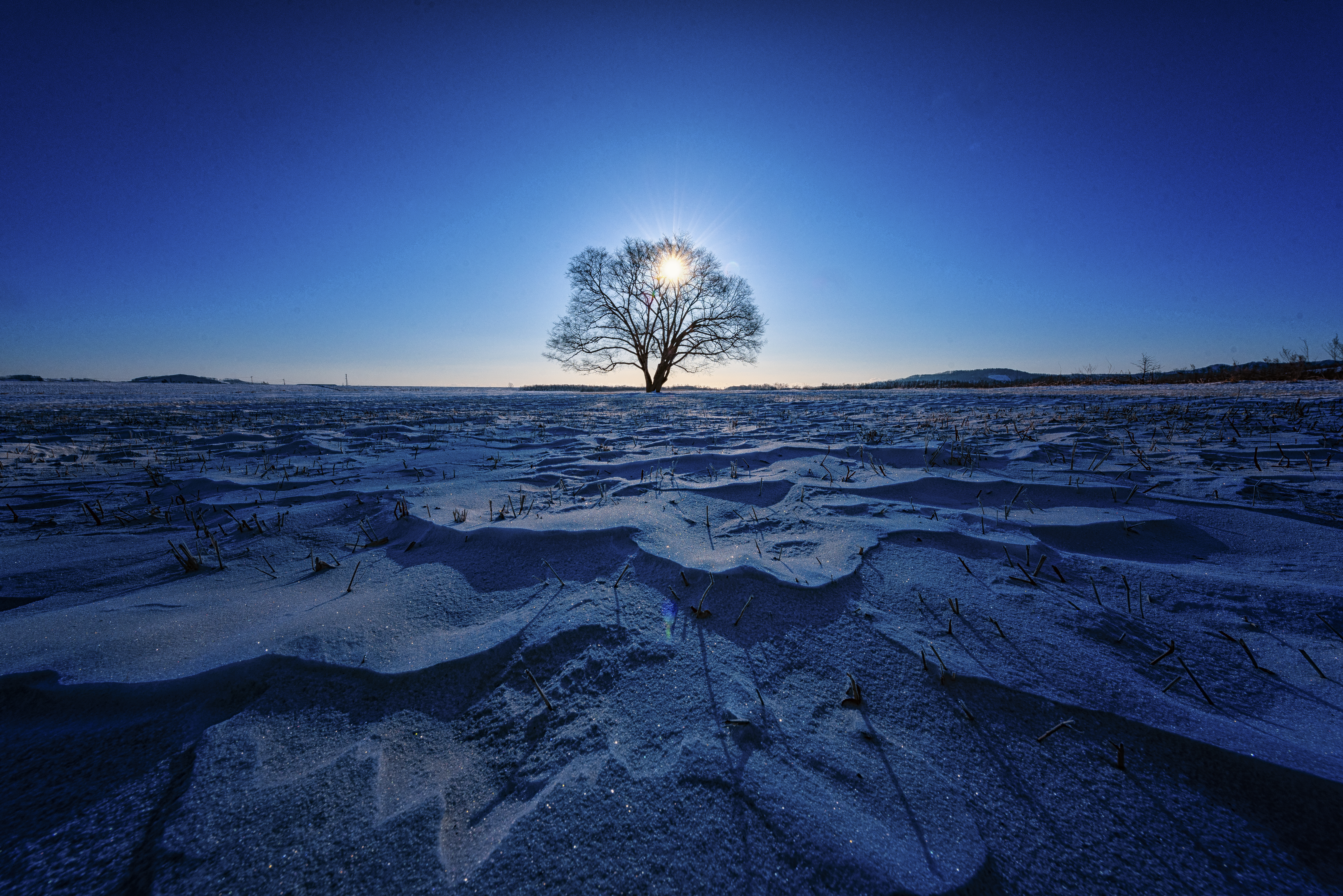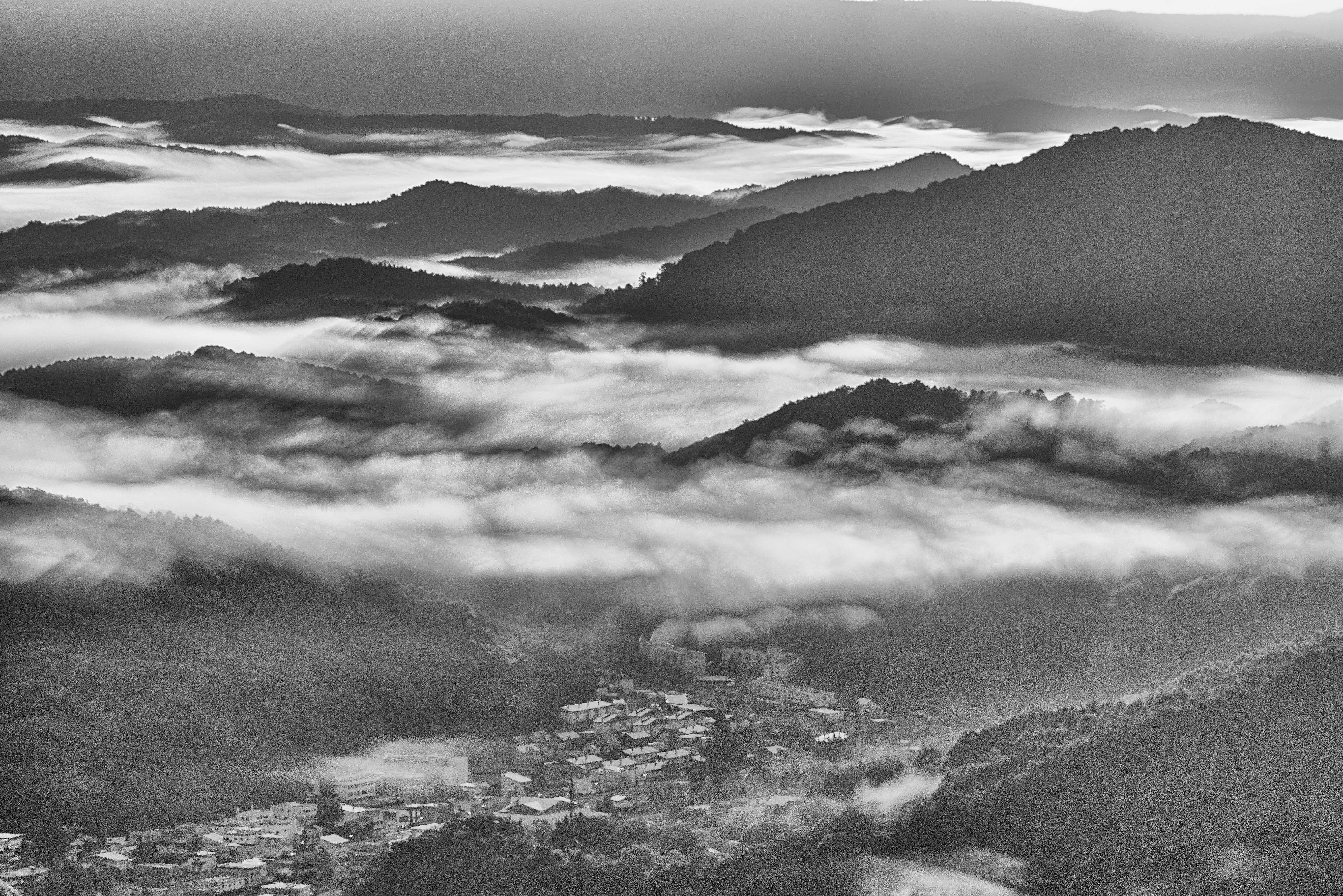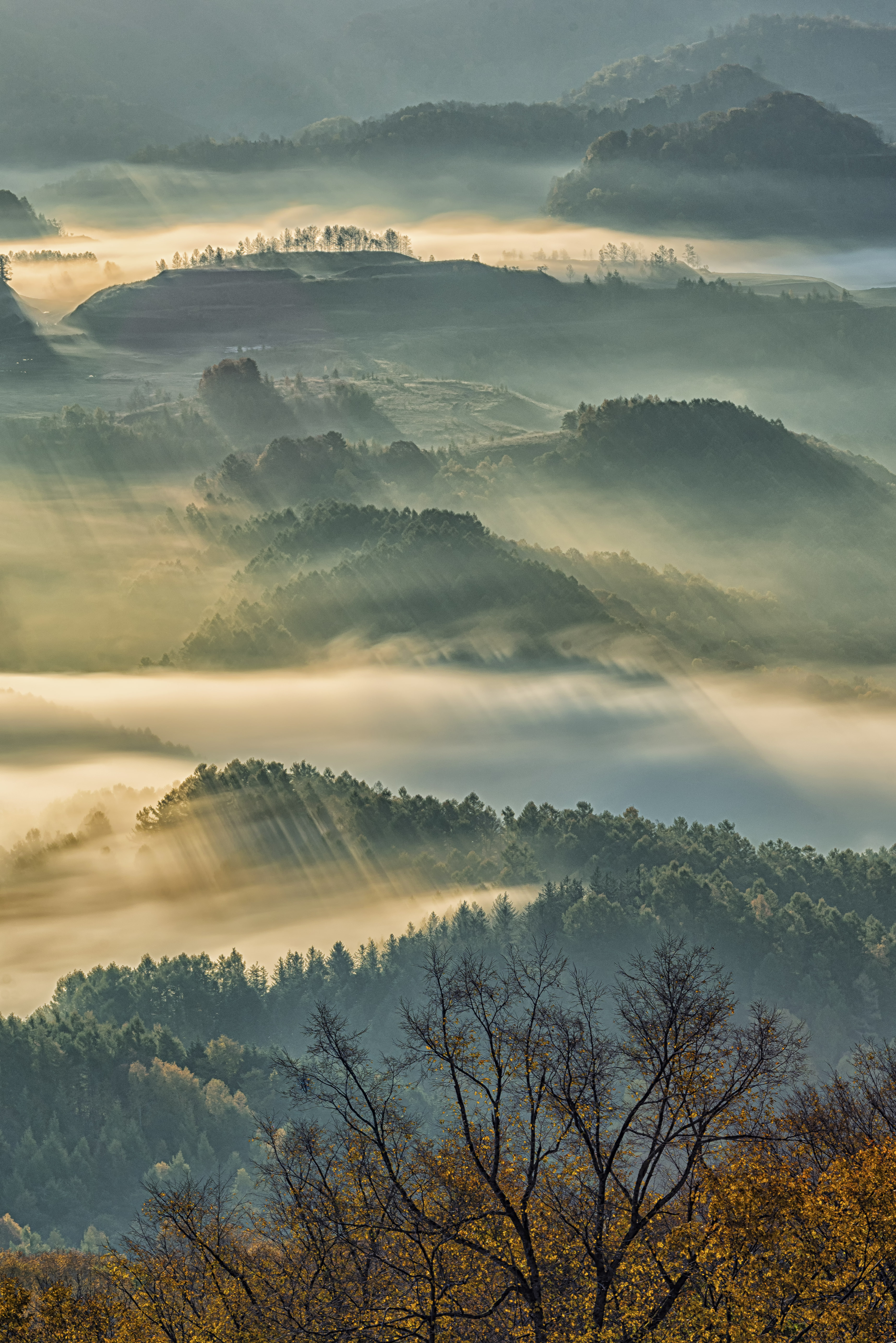 ハーフNDフィルターとND1000フィルターを重ね、雲海の動きを出し明暗差を調整して撮影しました。煙る雲海を陽光が貫き、その直線美が美しい朝の幕開けとなりました。