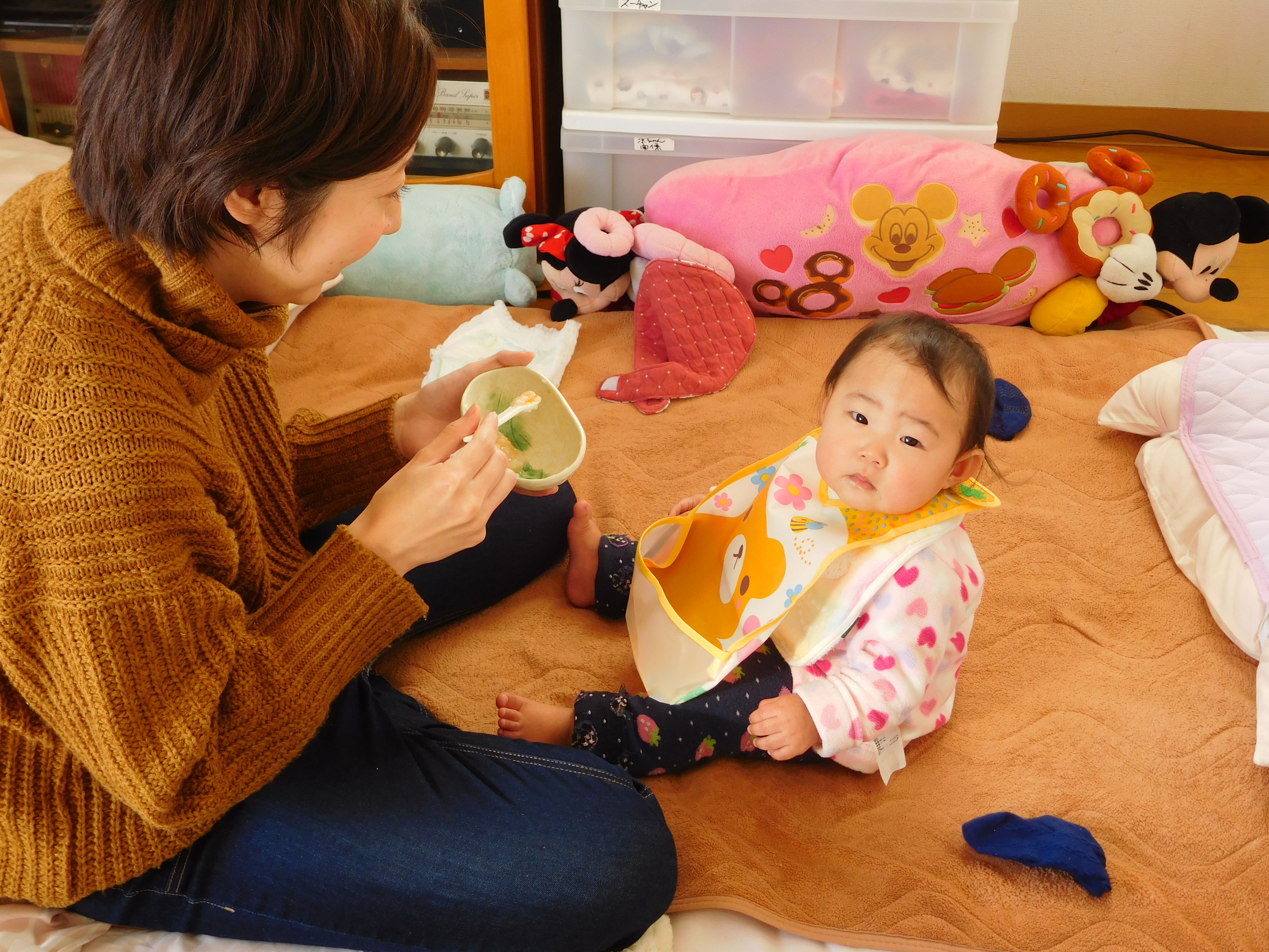 自宅で孫に食事を与える娘