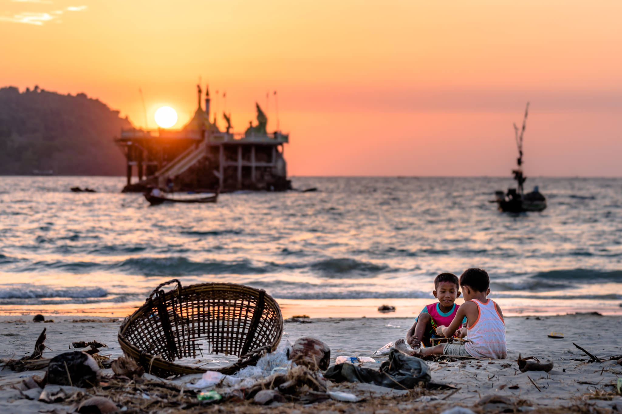 ミャンマーのガパリビーチの夕暮れです。海上のパゴダに夕日が沈みます。