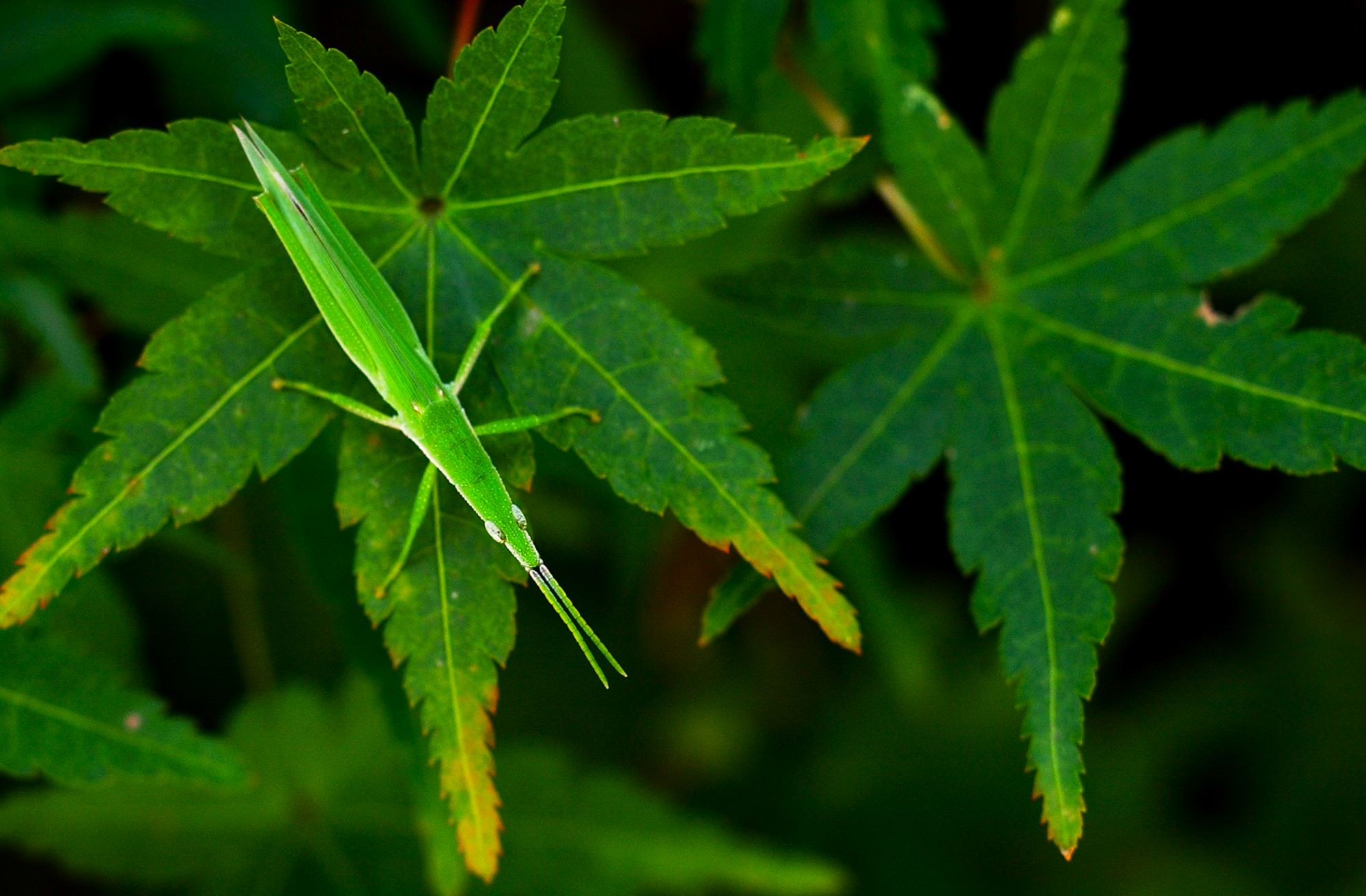 草むらの楓にバッタが止まっているのを見つけました