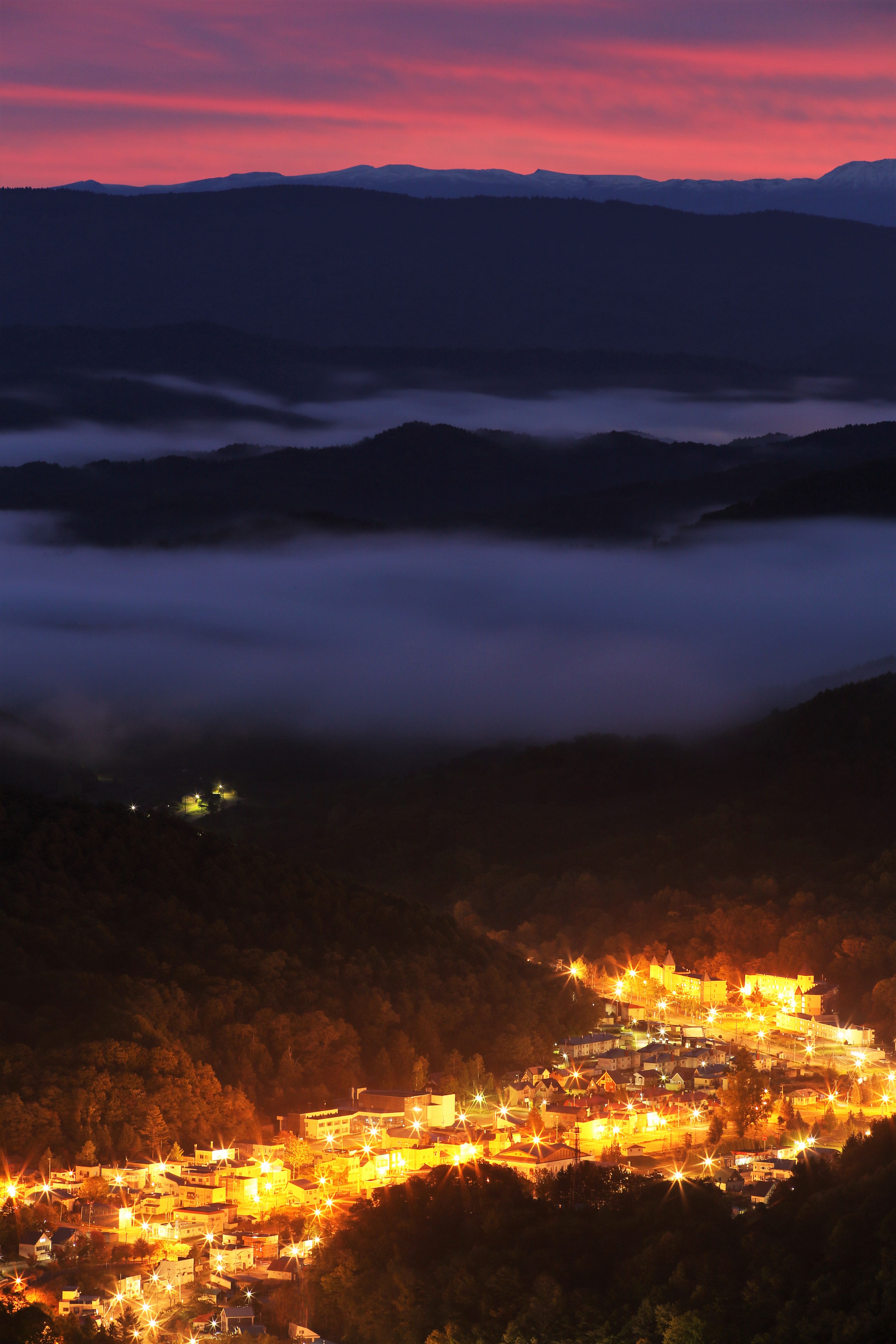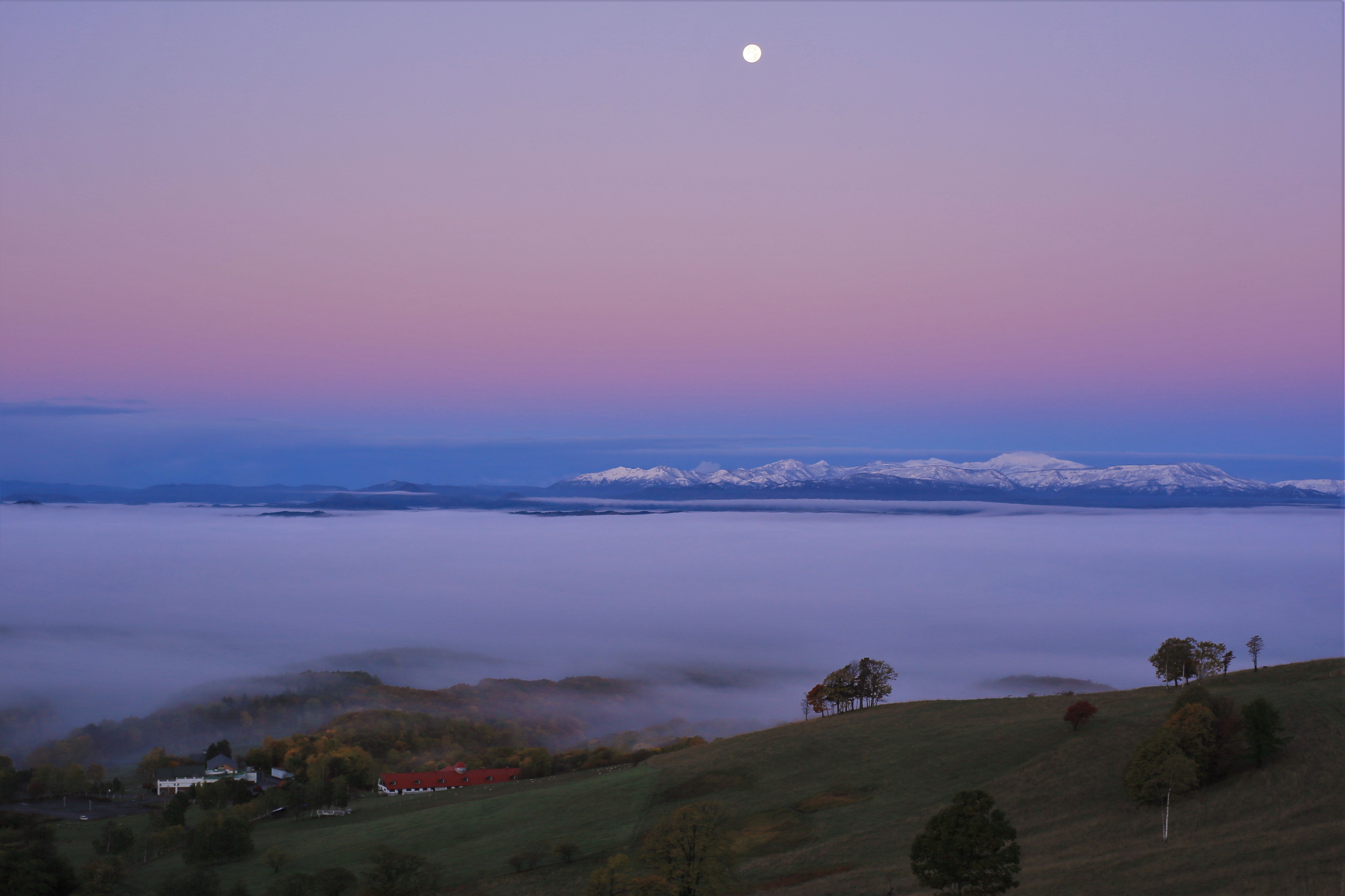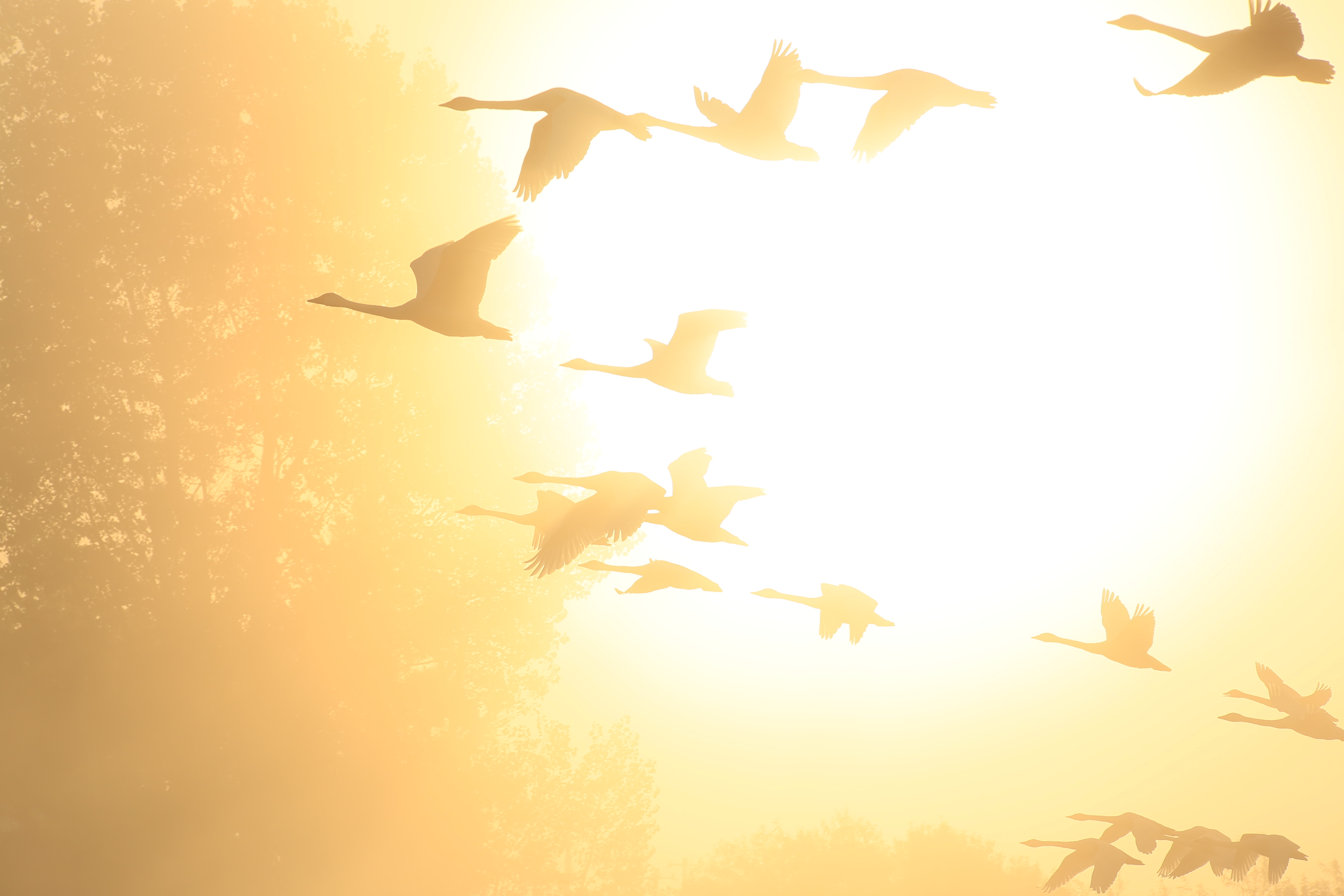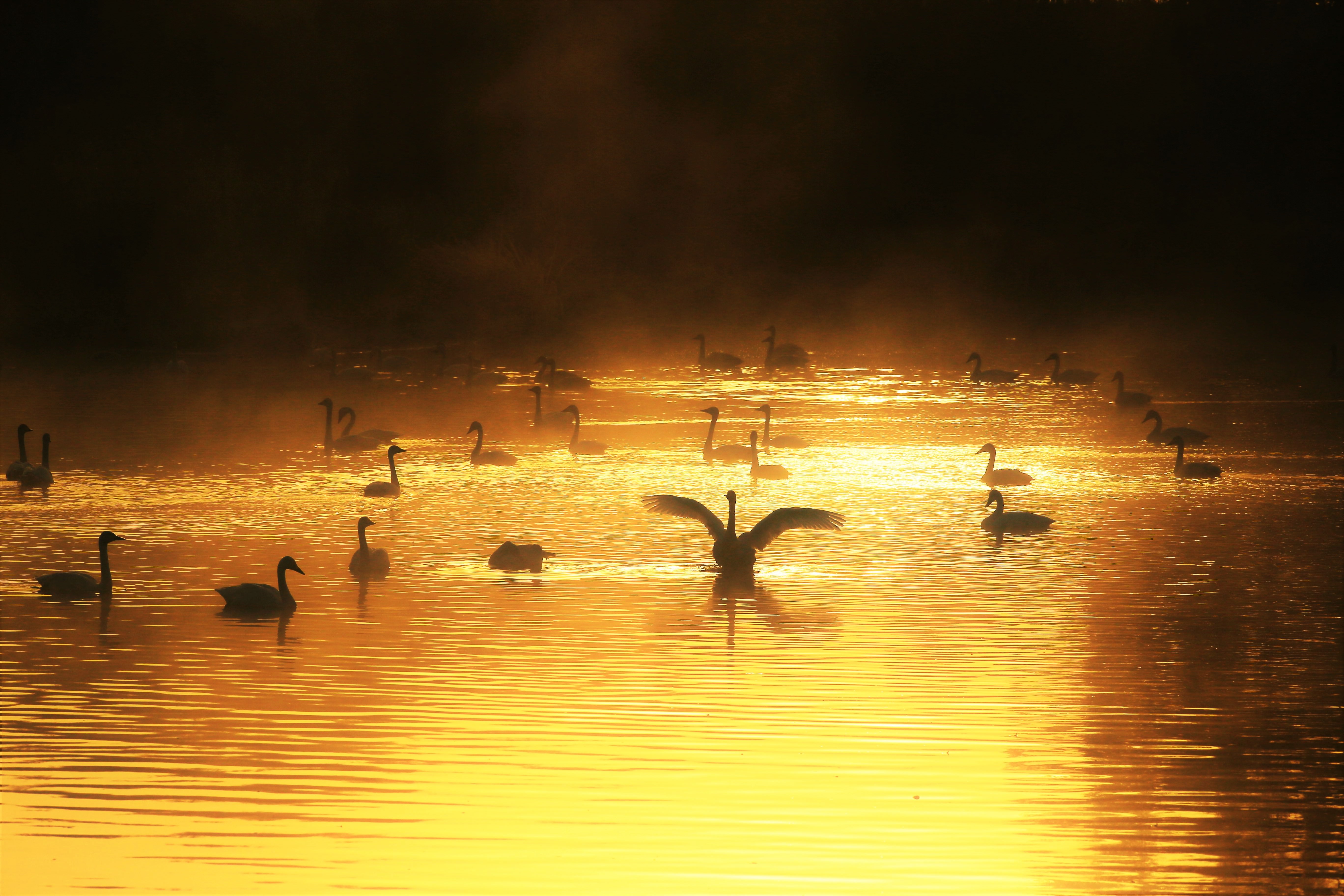 西日が静かに沈んでゆくと川がワインレッドに染まった。渡りの季節のほんのひととき、真っ白な白鳥が優雅に浮かんだ。