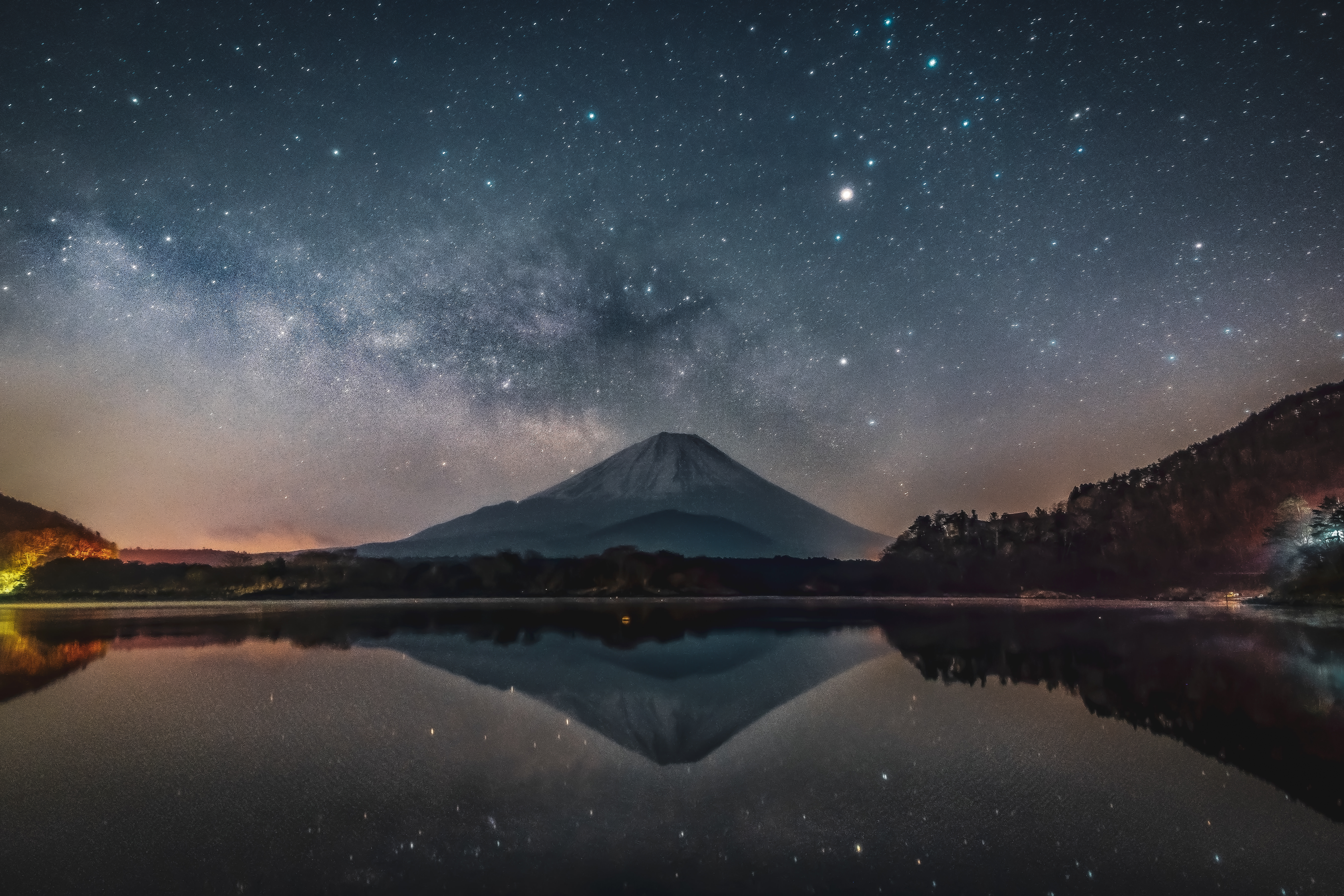富士山を撮影しました。天の川とさそり座が写っており、湖にもリフレクションしています。