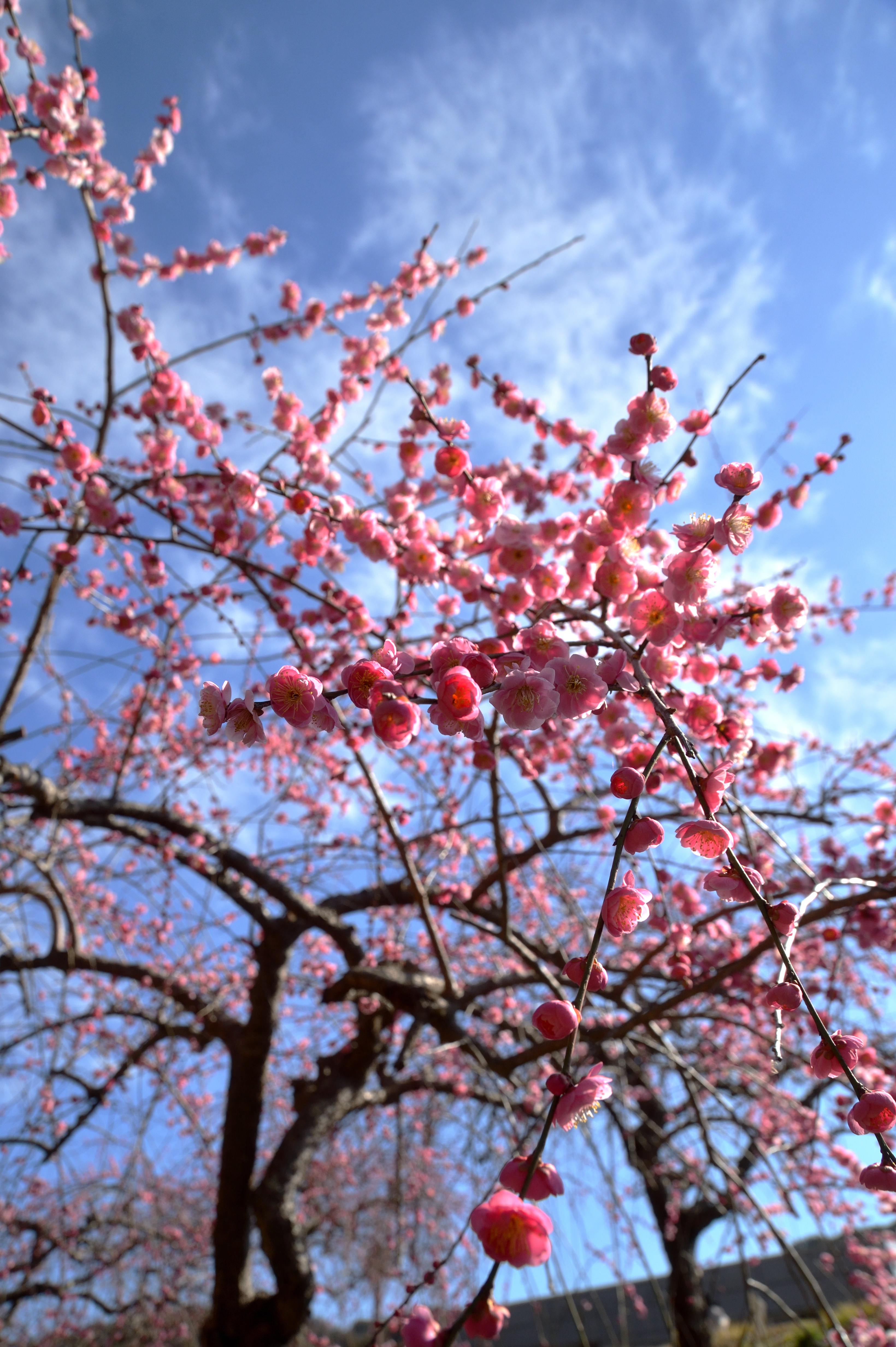下から梅を見上げる場所があり、下からのアングルで日光に当たり透ける梅を撮りました。