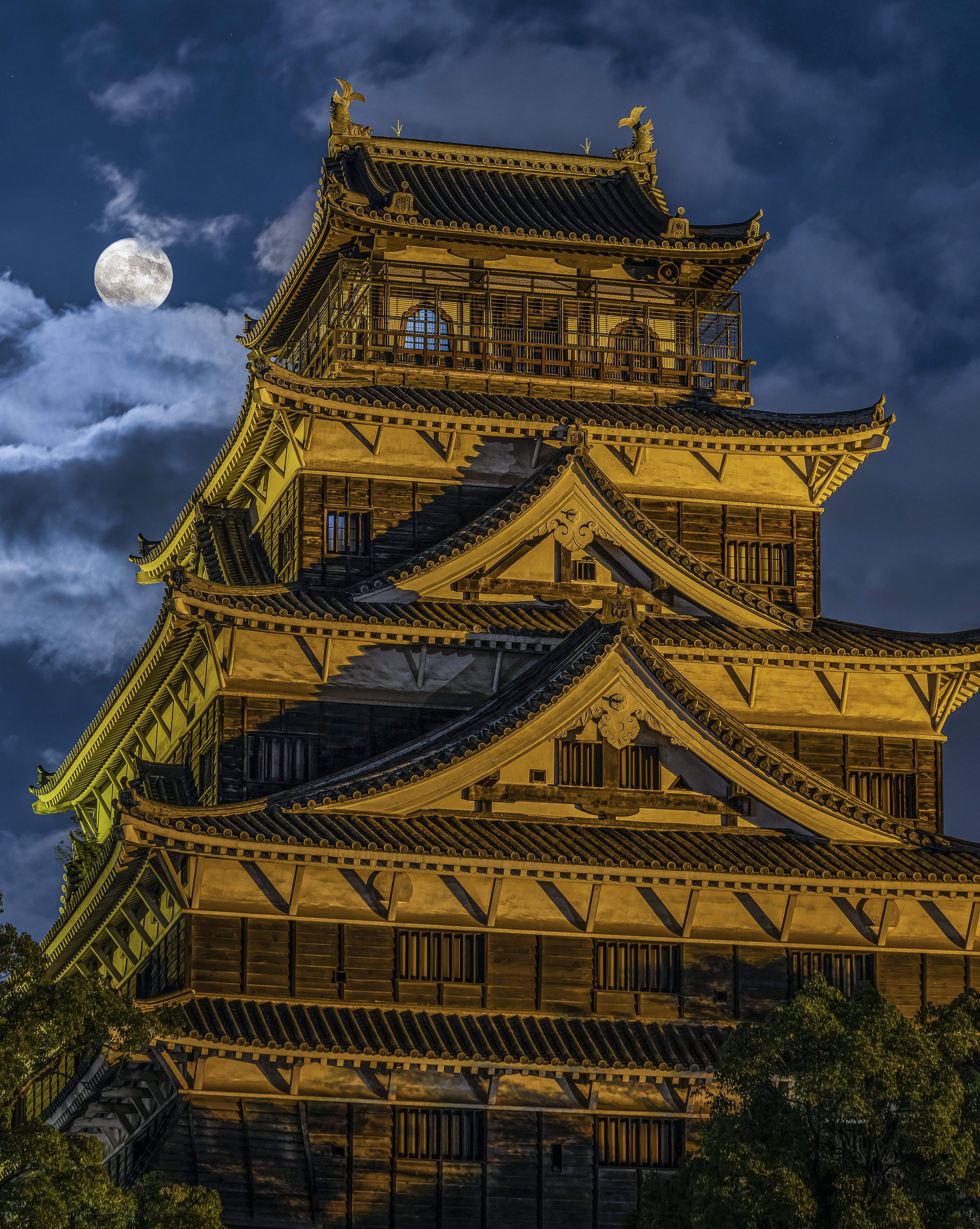 世界小児がん啓発キャンペーンで金色にライトアップされた広島城と満月