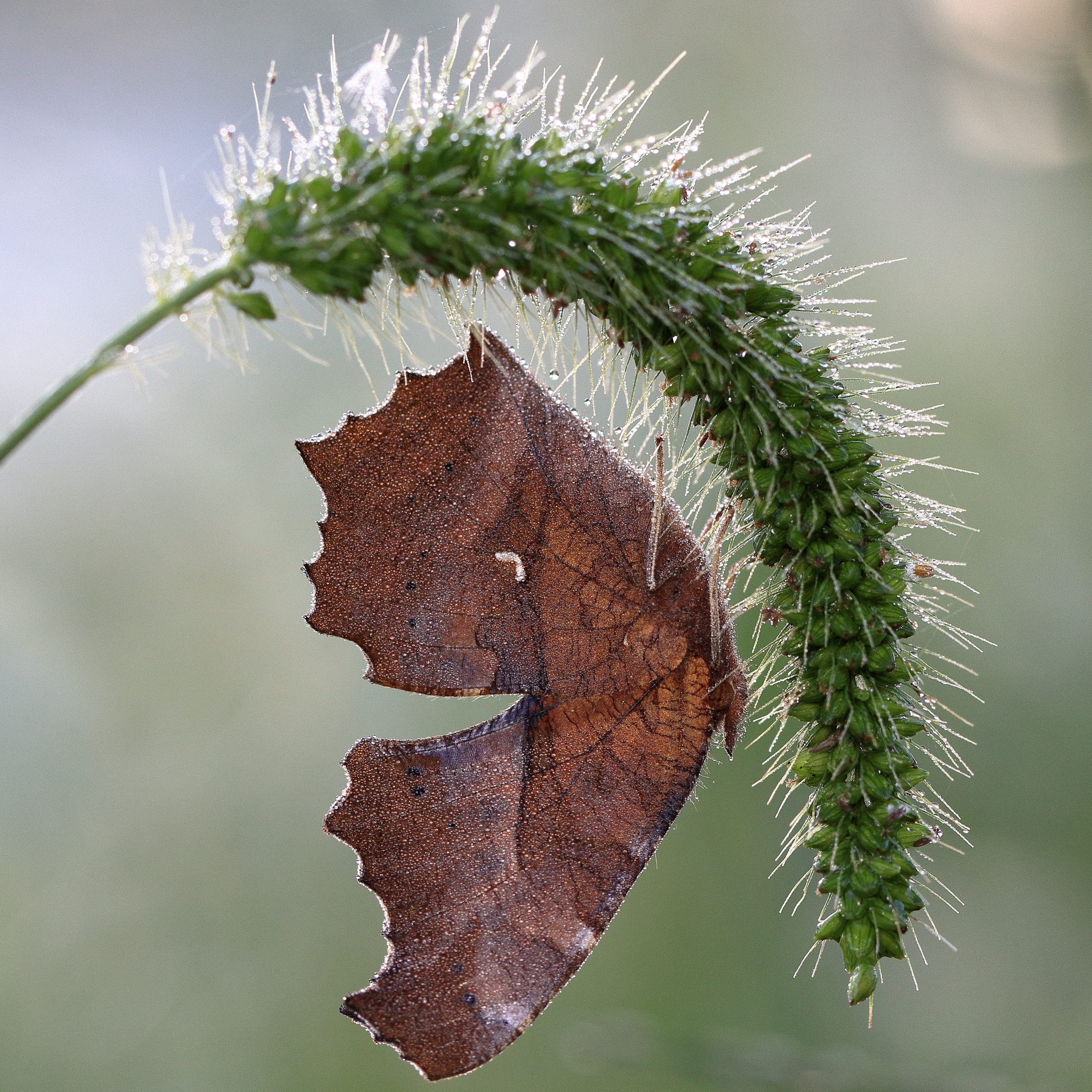 朝露に濡れながらエノコログサにつかまった「シータテハ」翅をたたんだ状態で側面から見ると、人の笑顔に見えてきます。新年早々の能登震災で隣の件に住む我が家も壁土が落ちるなど被害がありました。また飛行機事故など・・・。暗いニュースでのスタートとなりましたが、今こそ『スマイルジャパン』笑顔を取り戻しましょう。