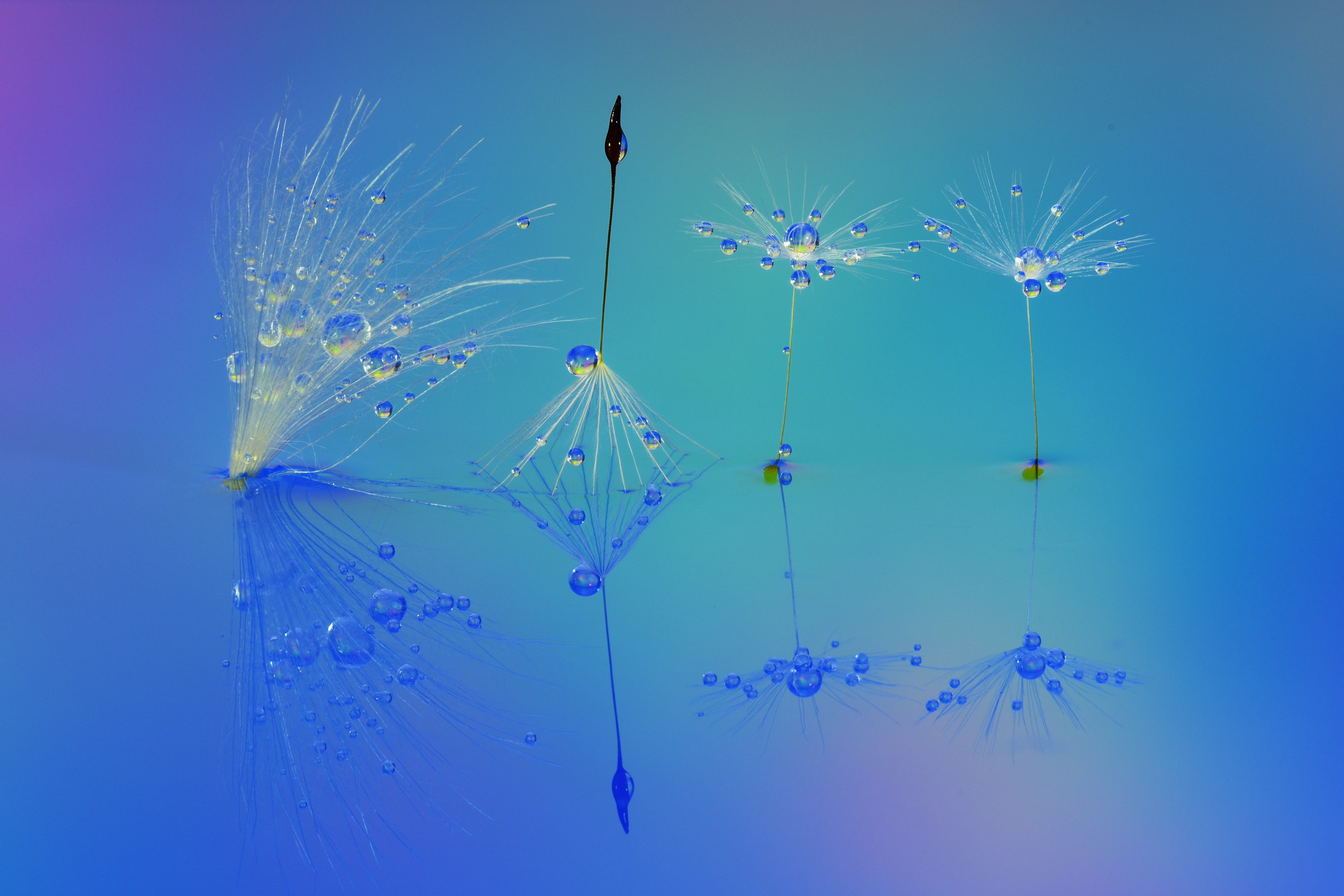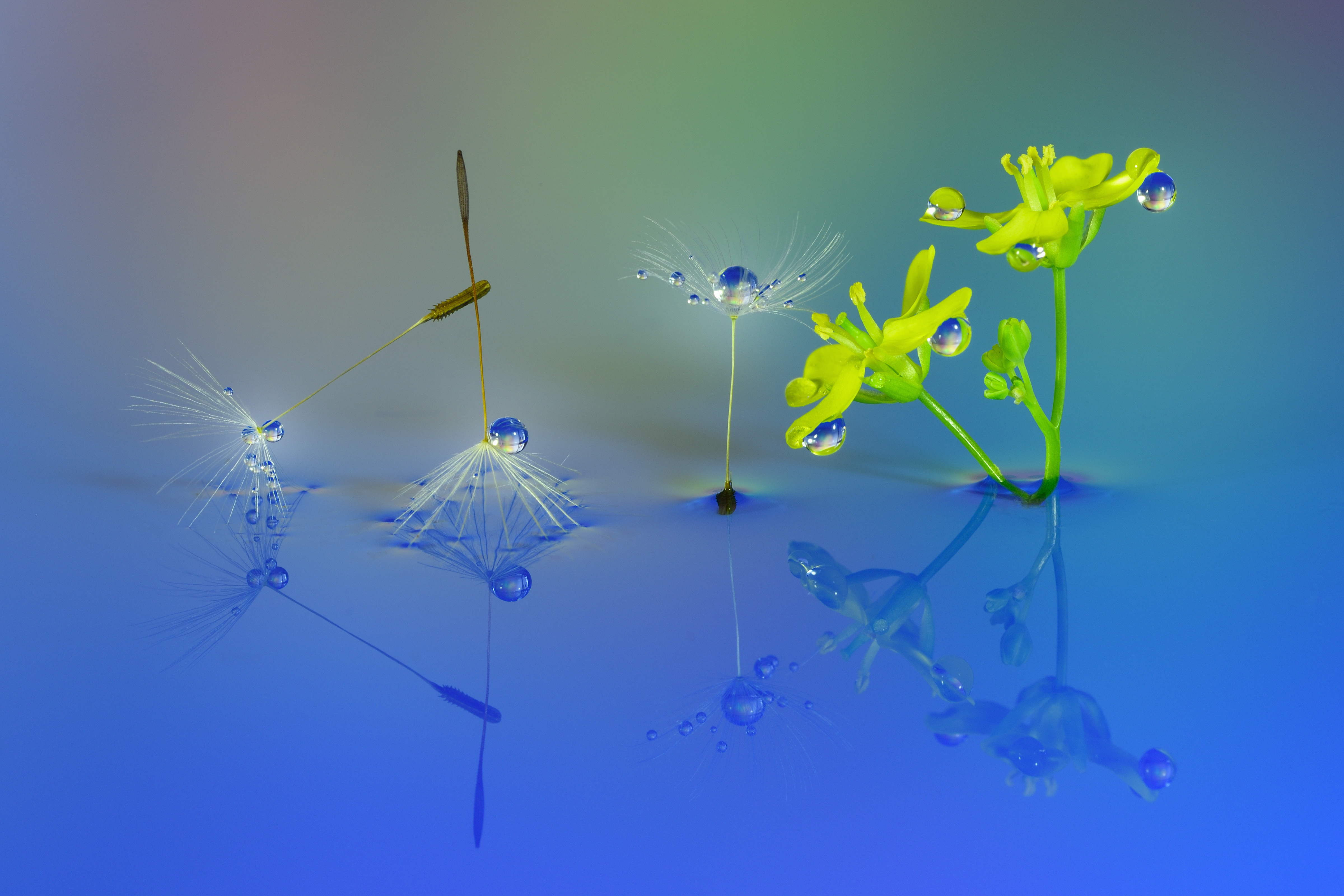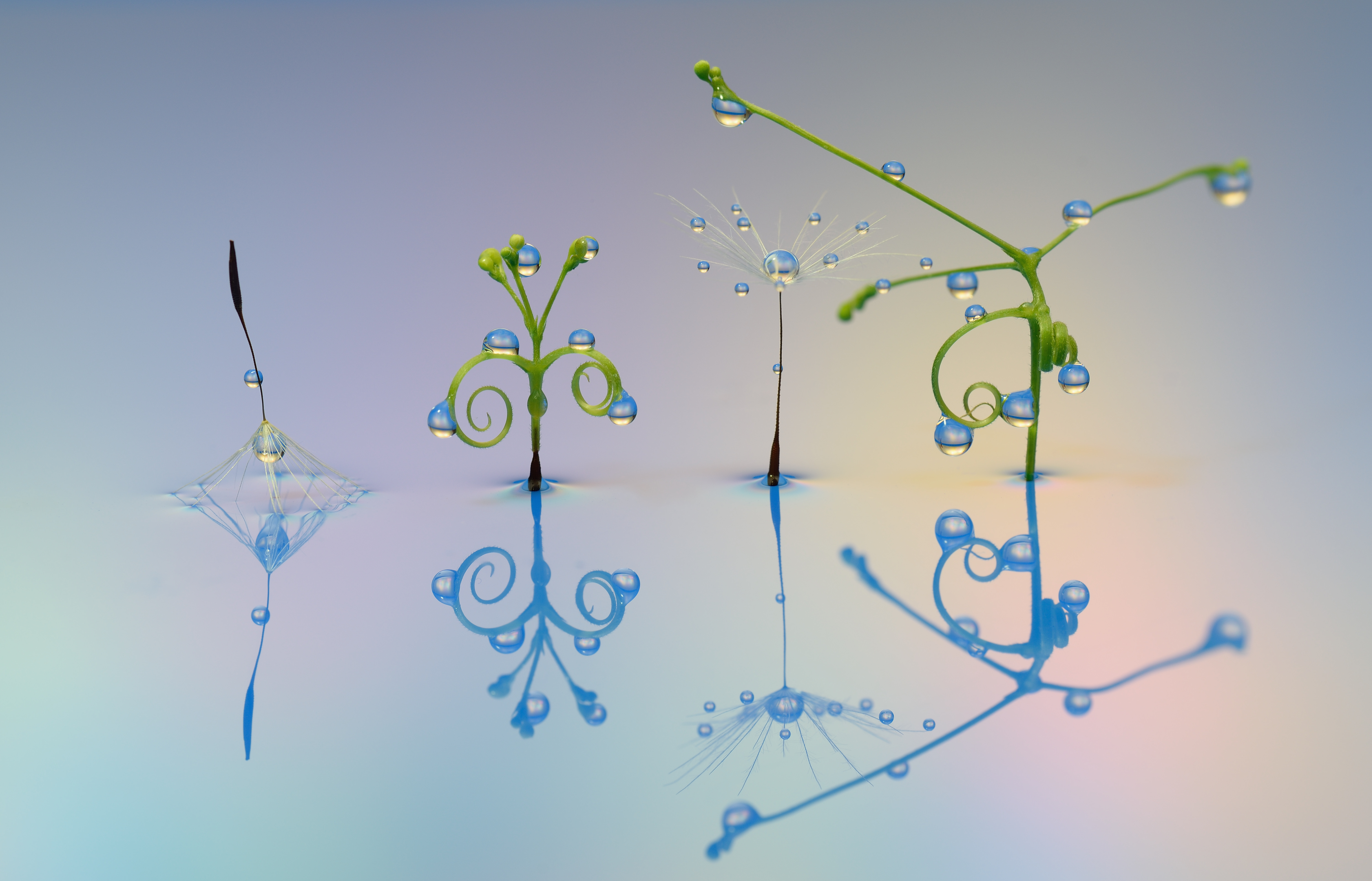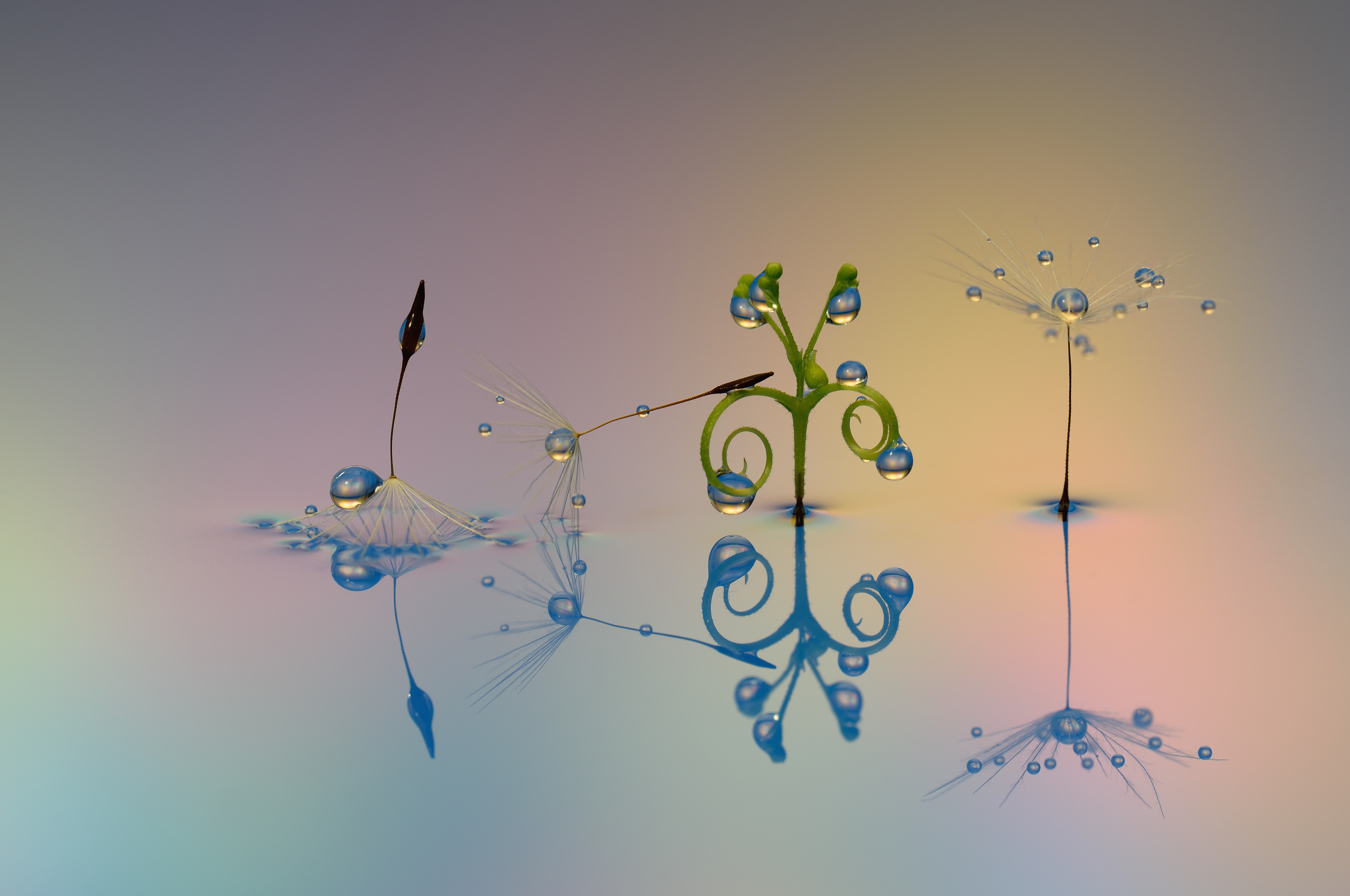水滴写真 創作写真です。つる状の被写体とタンポポ綿毛のコラボです。淡い色でまとめてみました。