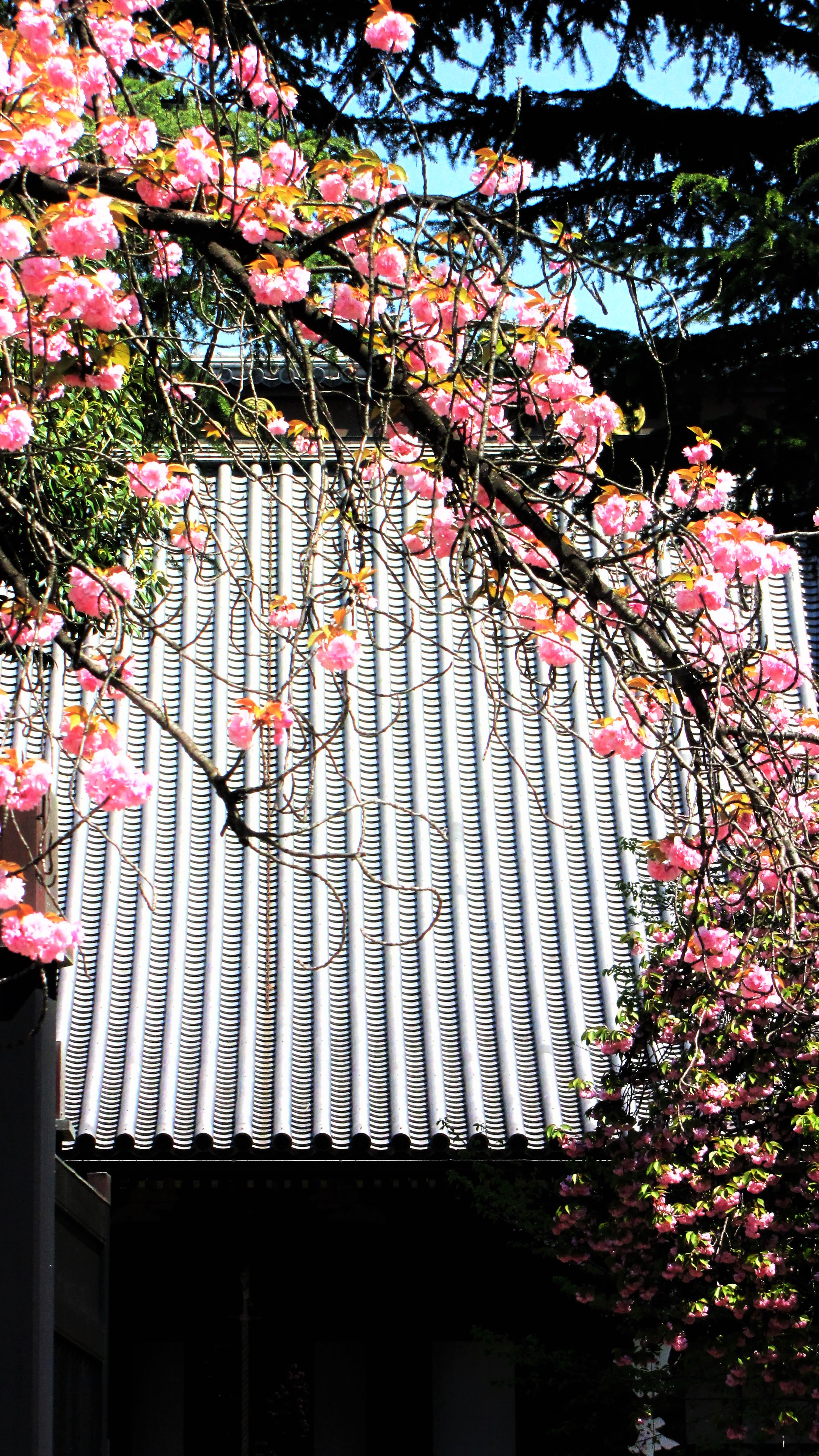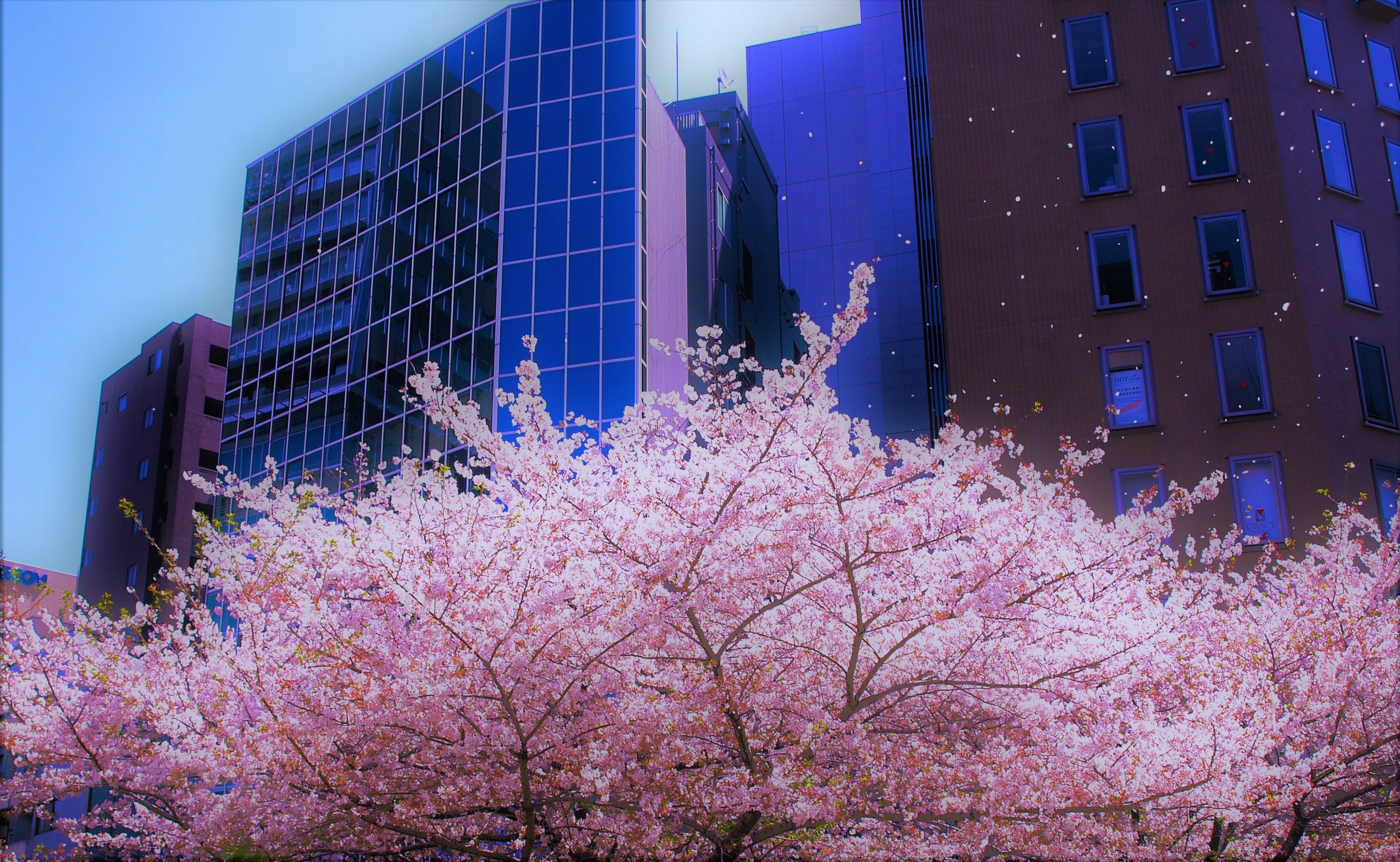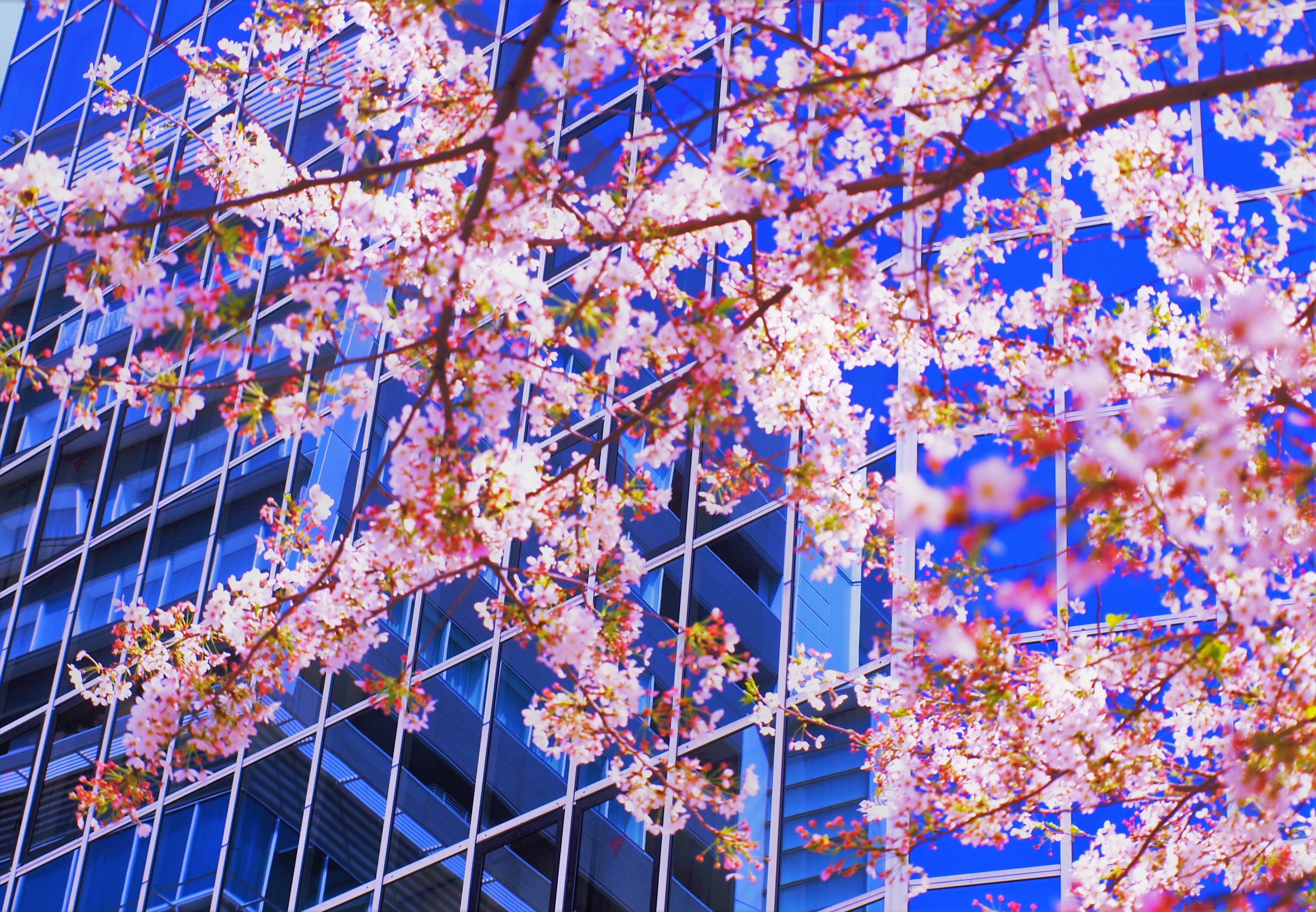 街の高層ビルと桜のハーモニーです
