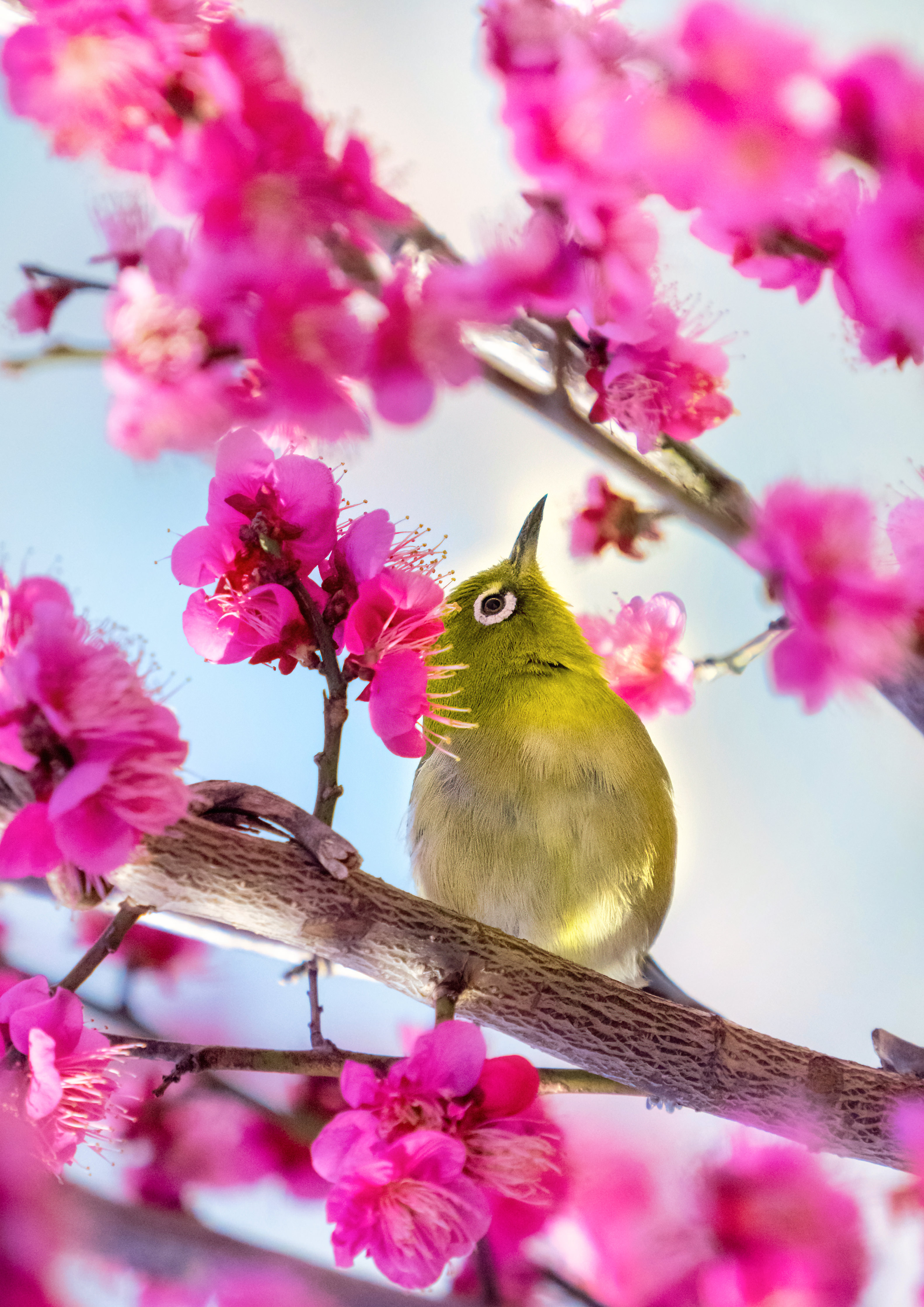 紅梅を飛び回るメジロ