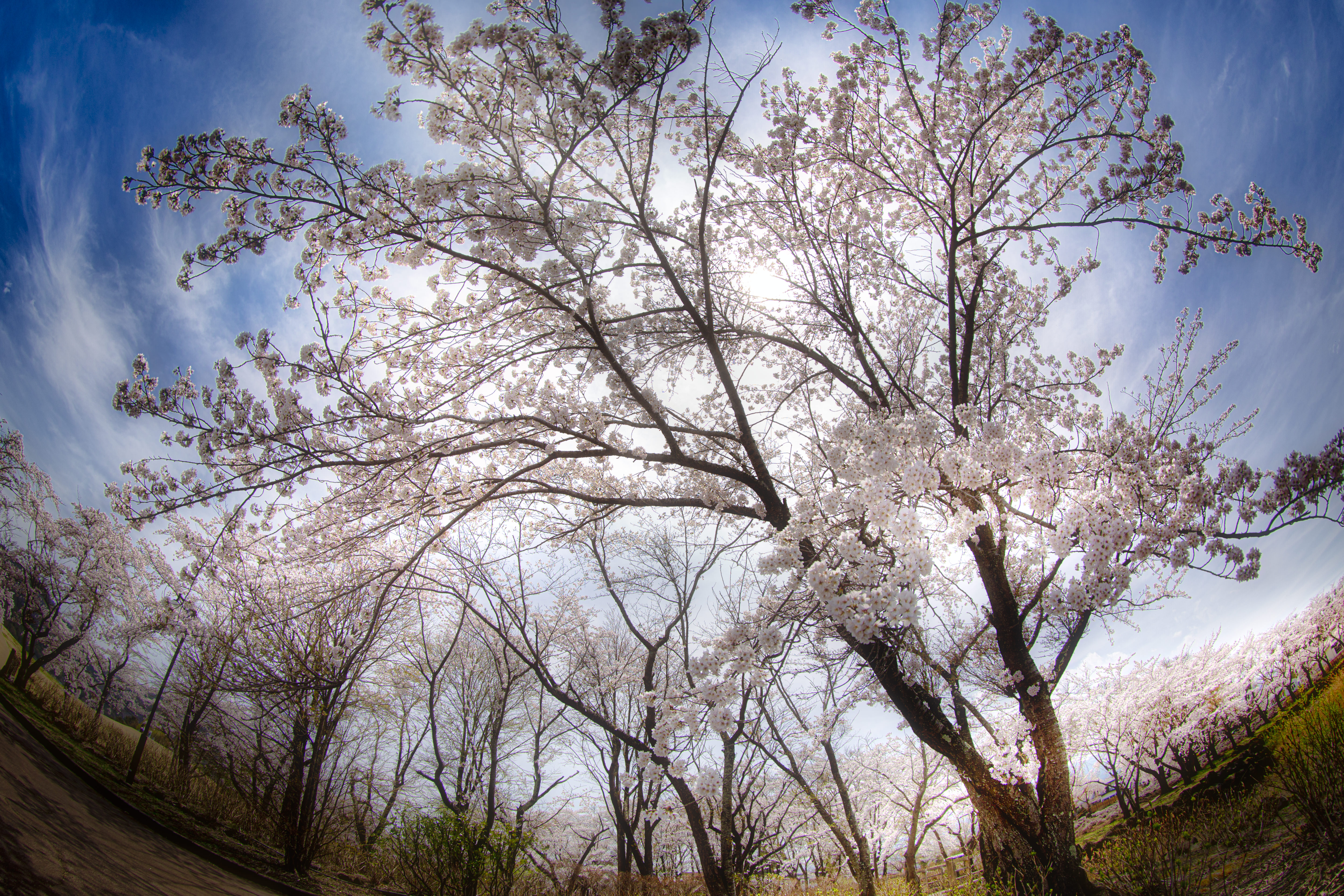 桜並木に風、数多くの桜が舞う
