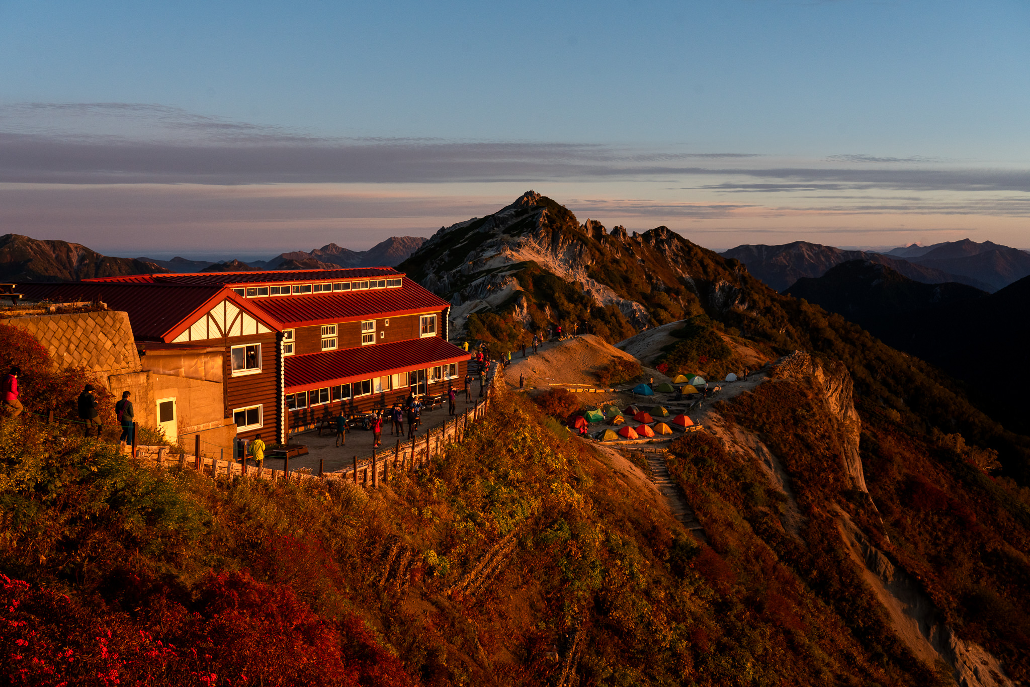 沈みゆく太陽を見ながら、残る光に照らされる燕岳を拝みました。