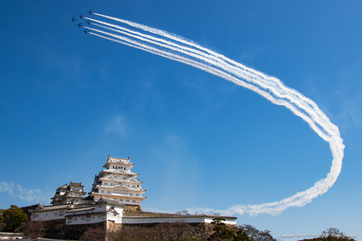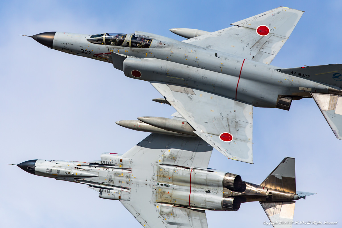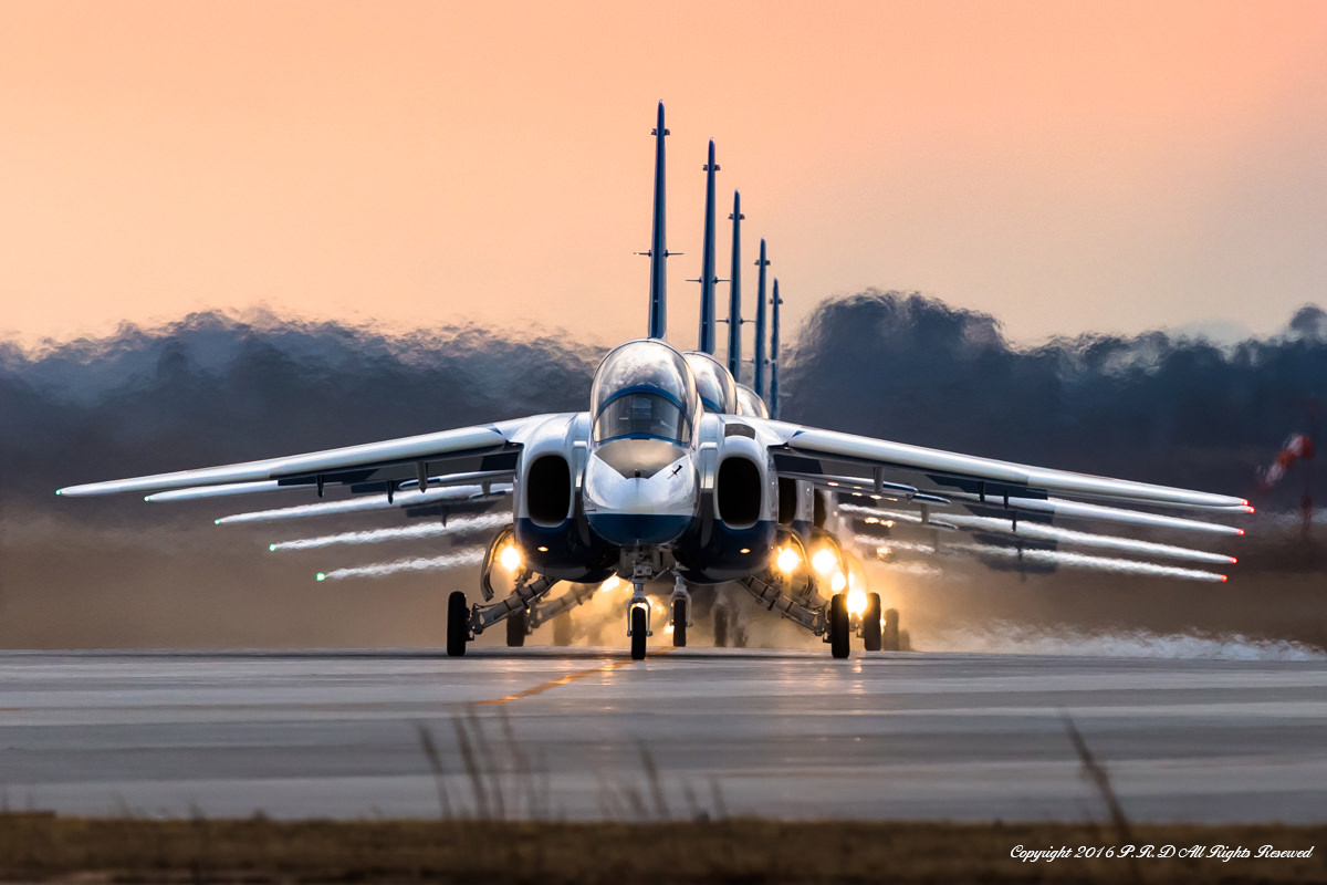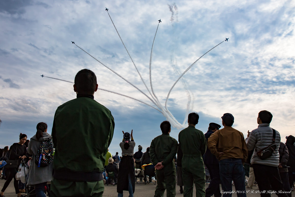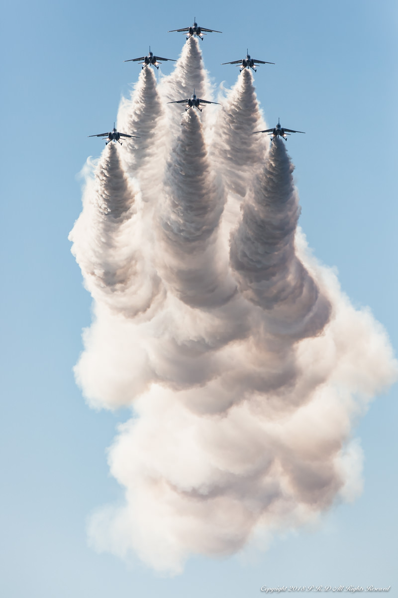 三沢基地航空祭2014での一コマ。左後方から突然会場を横切る「ファンブレイク」。機体間の距離は僅か90cm程度しか無く、まさにパイロット同士の信頼の結晶のような課目です。