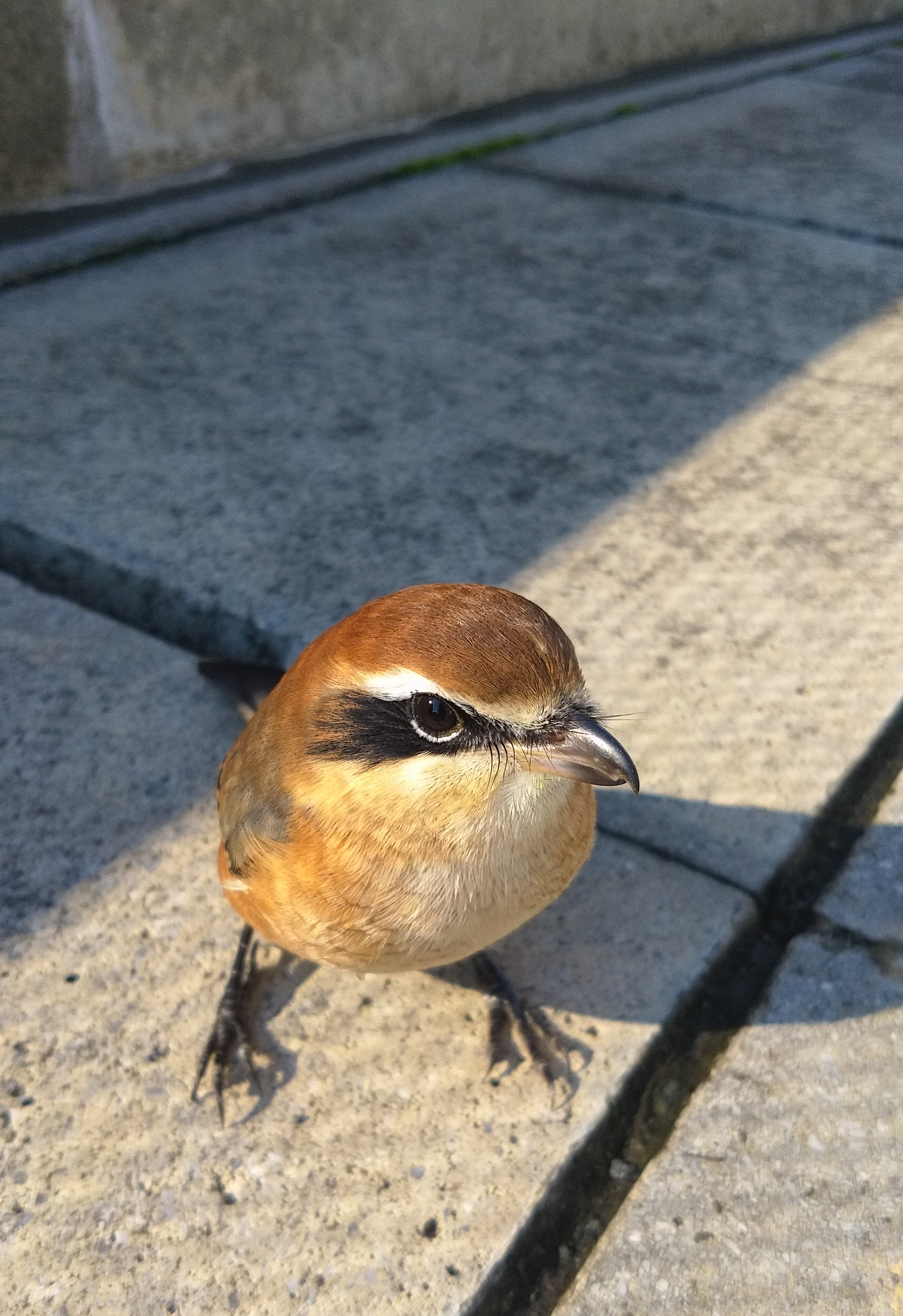 スマホで30センチほどの至近距離まで寄っても逃げるそぶりを見せない肝の座ったスズメ(ではなくモズ)。ケガで飛べないのかと思いきや、この後元気に飛び立っていきました。