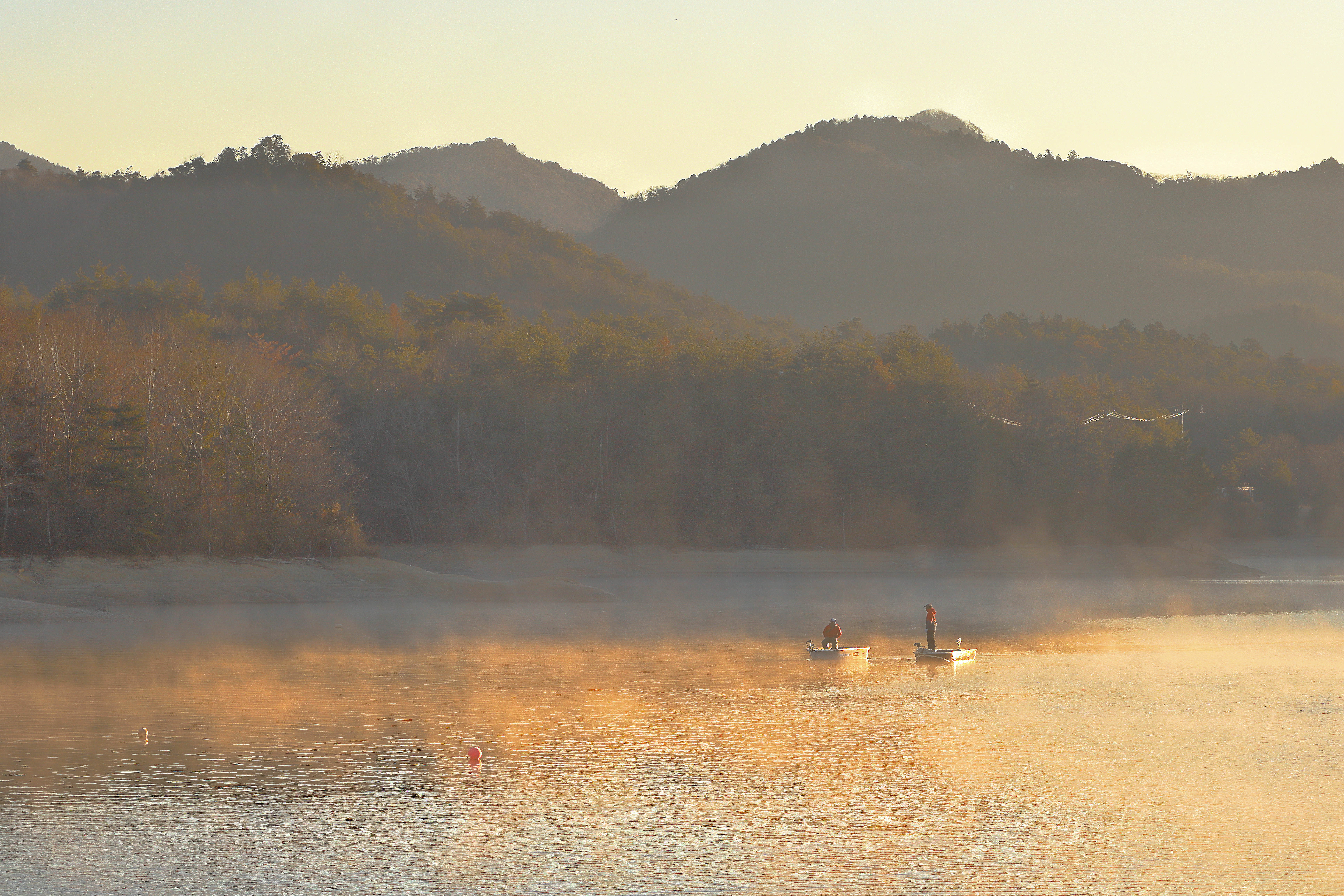 朝日が湖をオレンジ色に染め始め幻想的で美しかった冬の朝