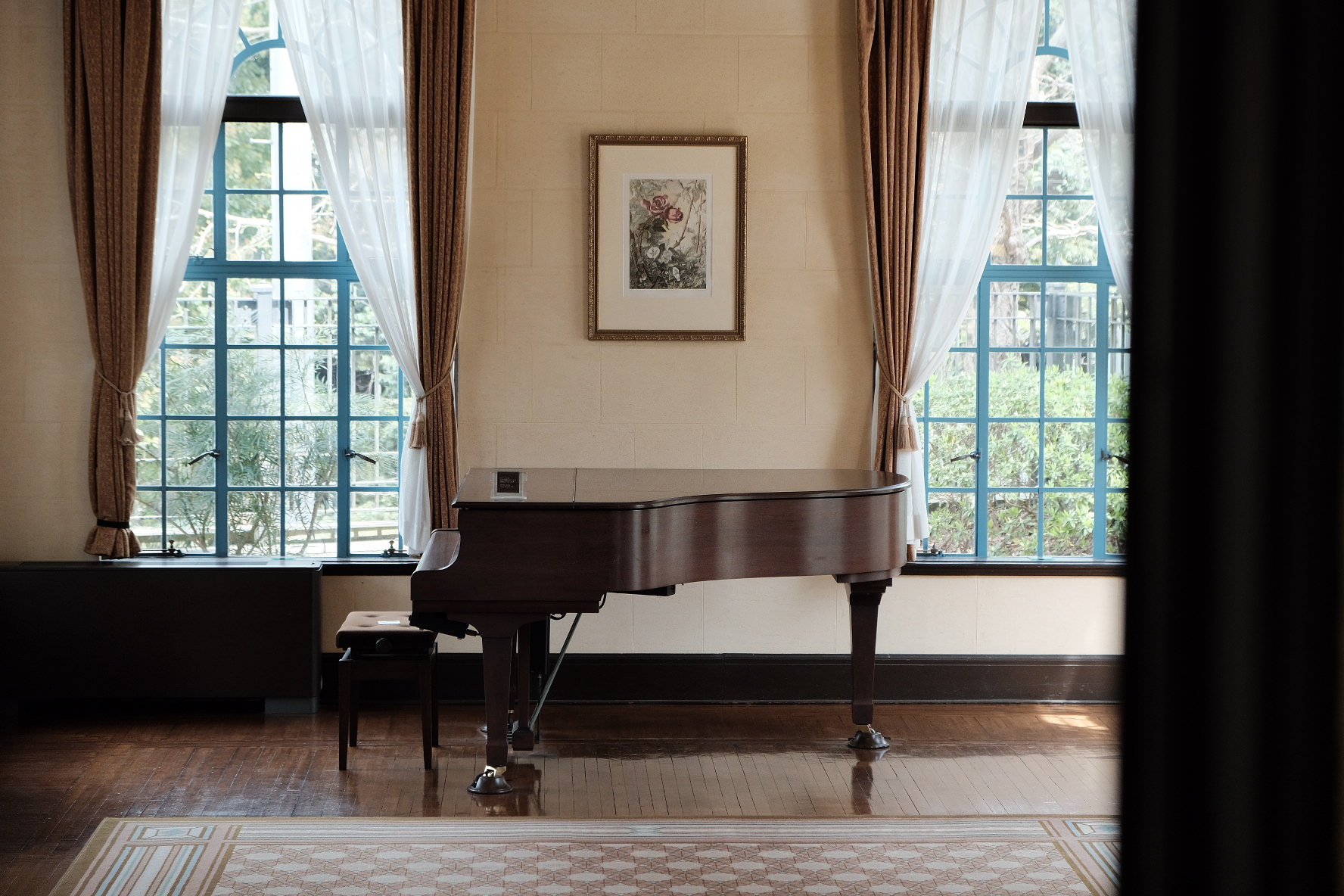 横浜の山手西洋館のひとつ、ベーリックホールのピアノです。柔らかな春の陽射しが窓から入ってきて、まだ弾かれていないのにシューベルトやモーツァルトが聴こえてきそうなピアノでした。撮って出しの清潔感を残したかったのでRAW現像はしませんでした。