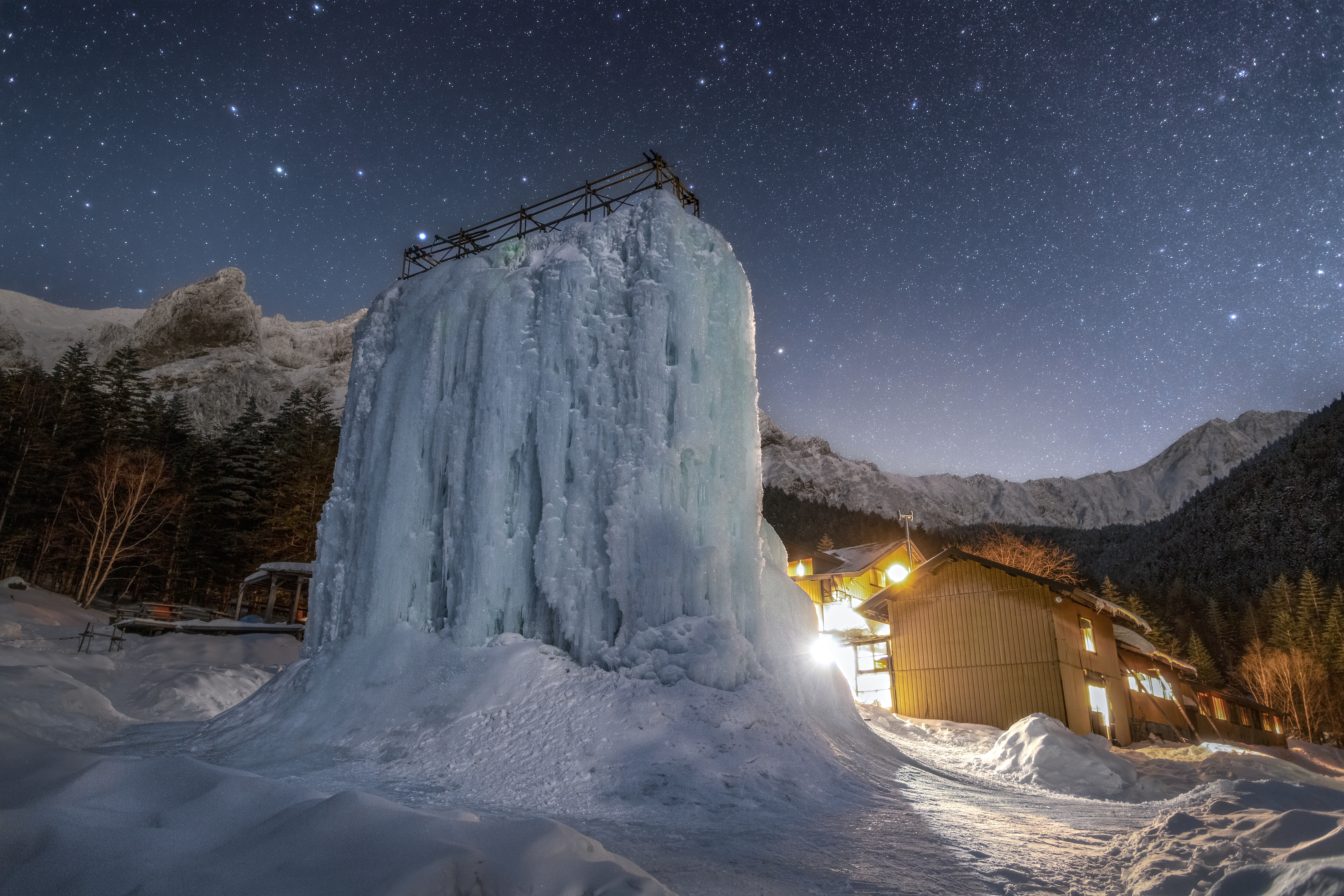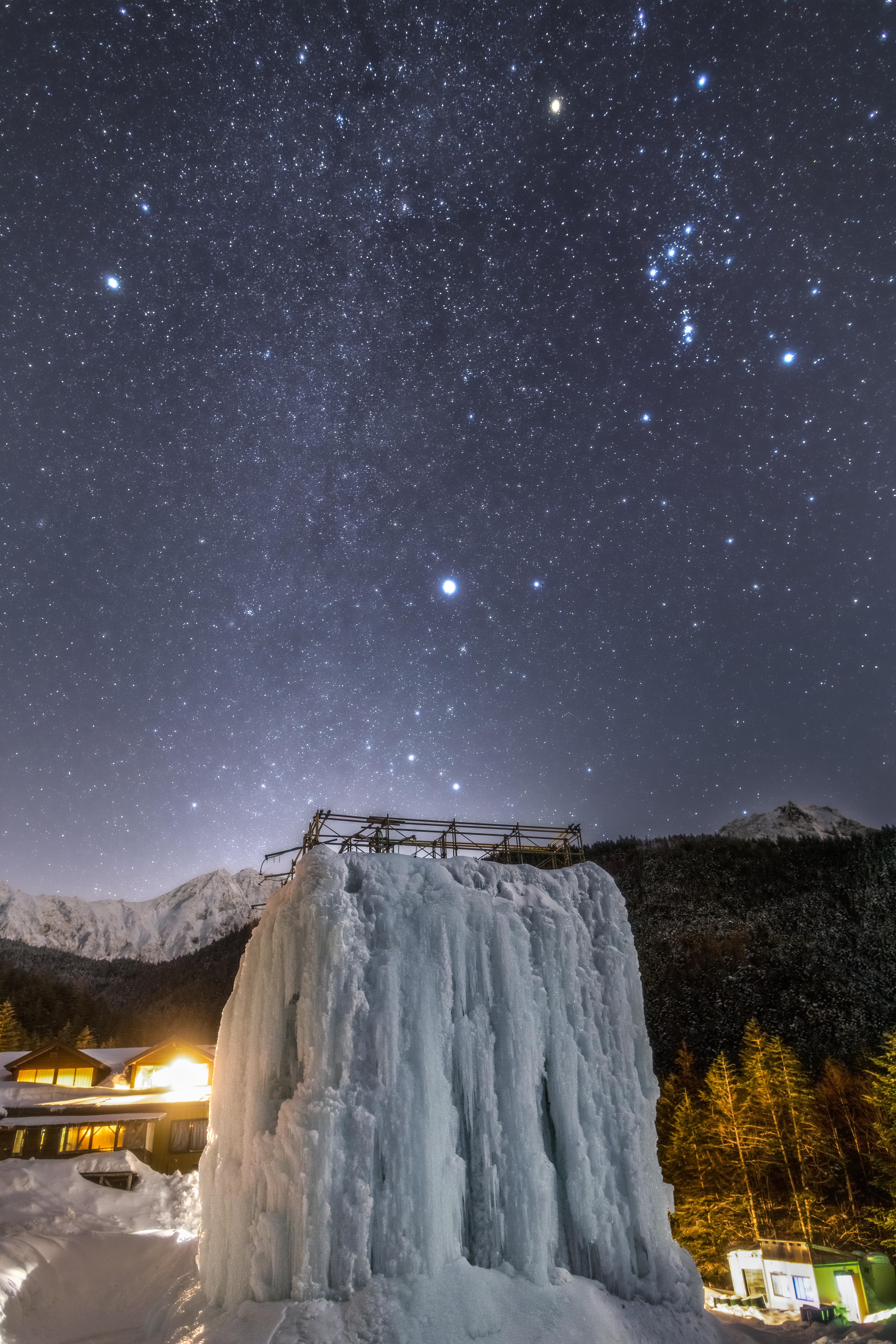 南八ヶ岳の山小屋、赤岳鉱泉。冬の期間に現れる人工氷瀑(アイスキャンディ)の真上に冬の星座が昇りました。