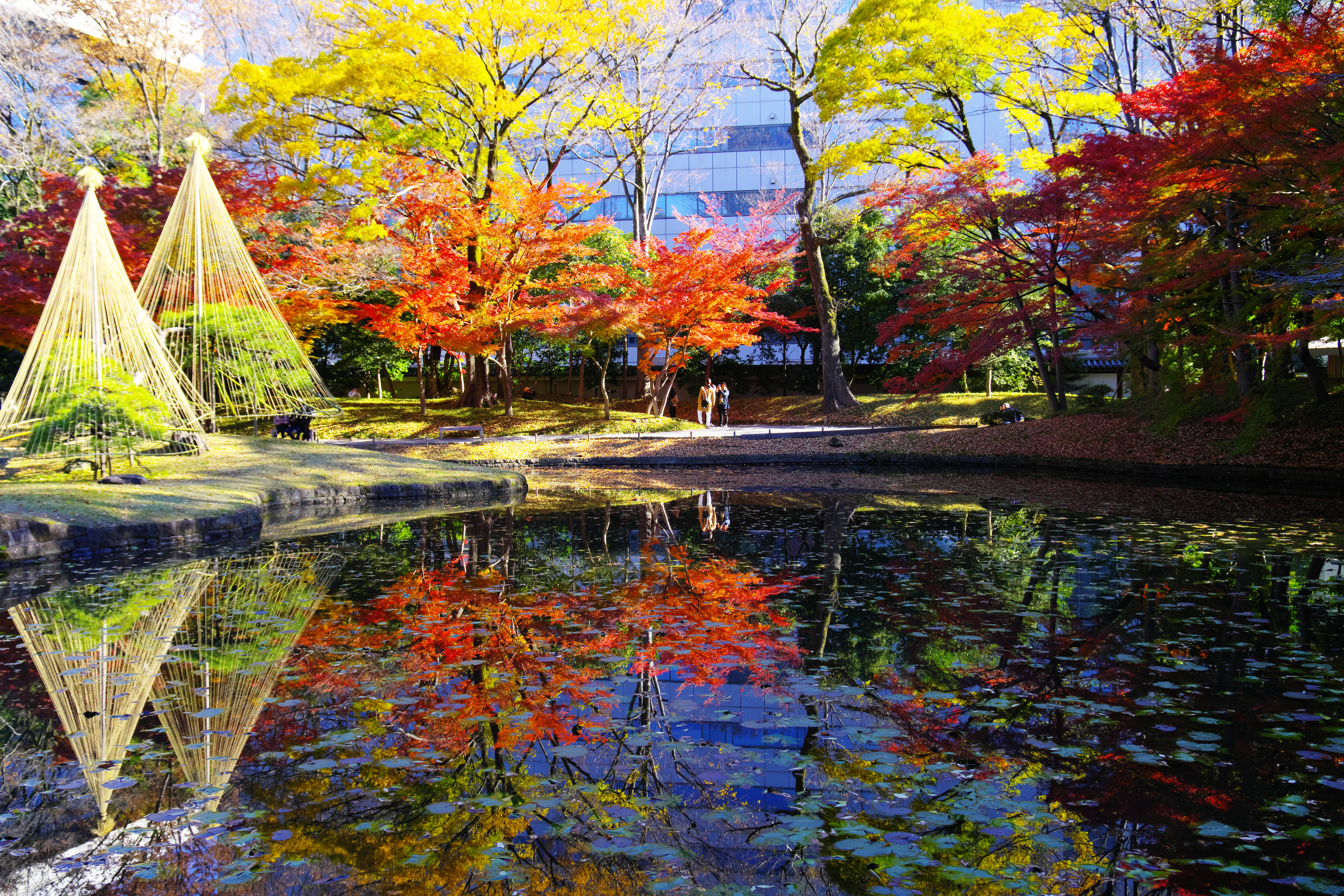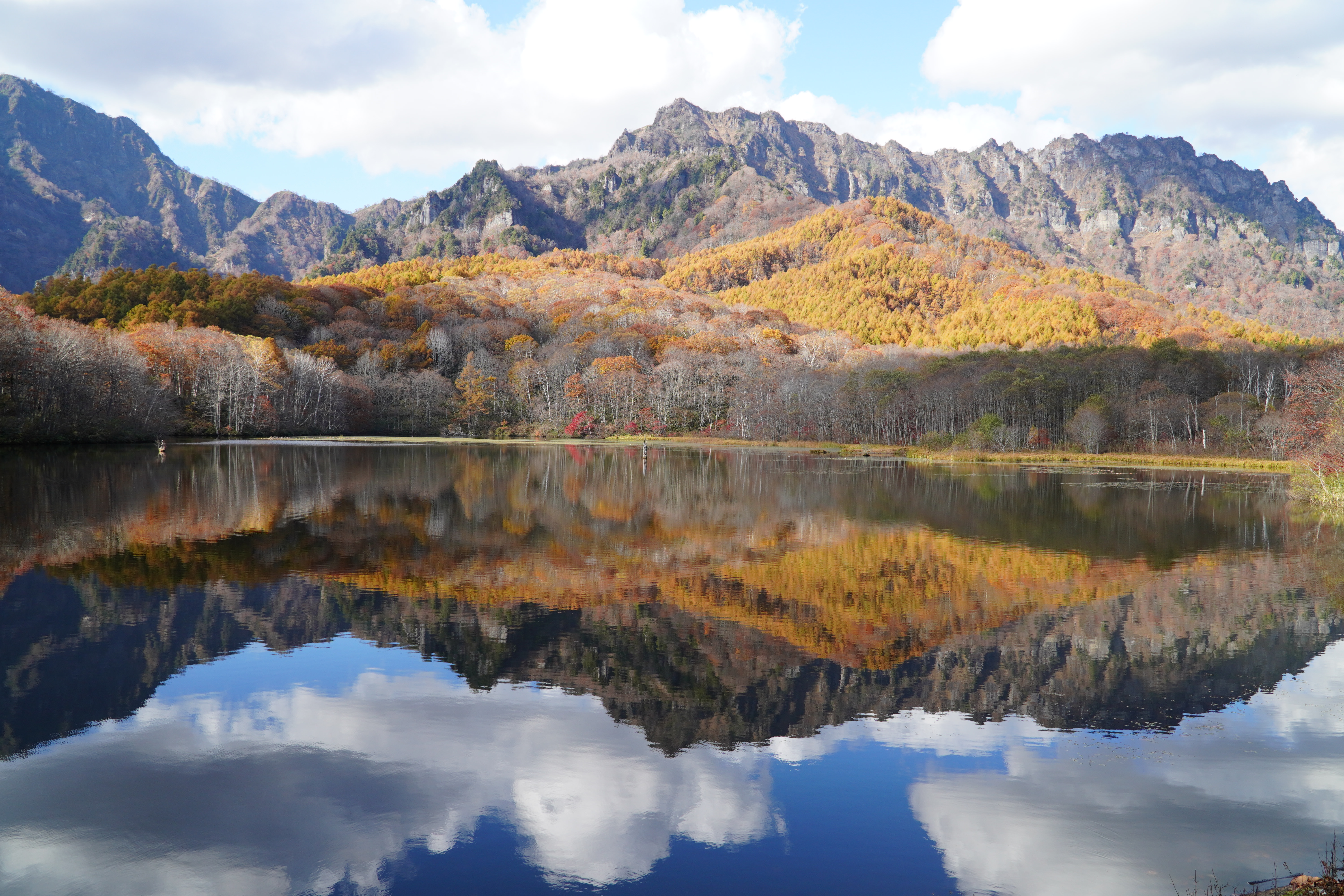 紅葉の最盛期は過ぎていましたが風が凪のためくっきりと戸隠連峰写っていました。