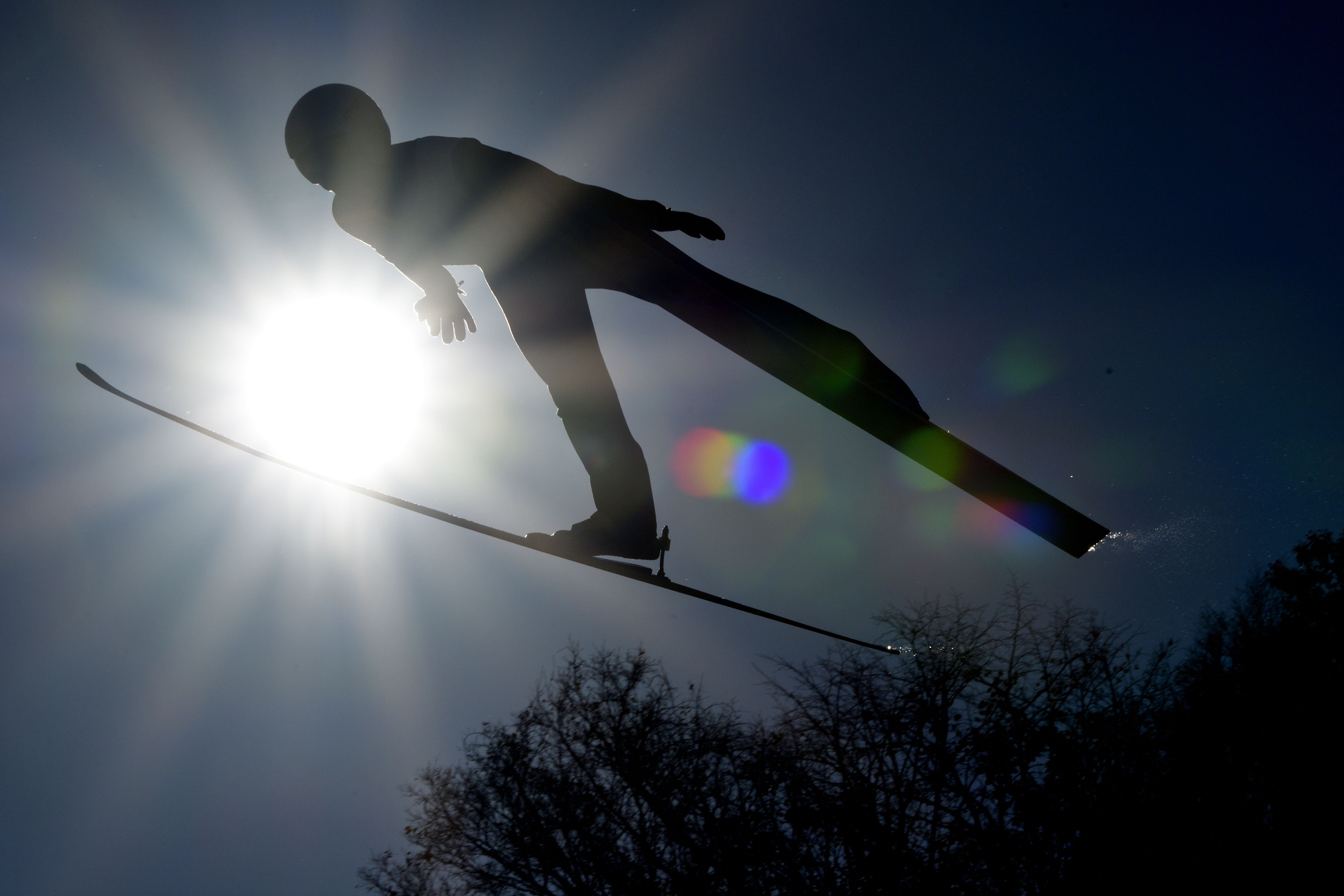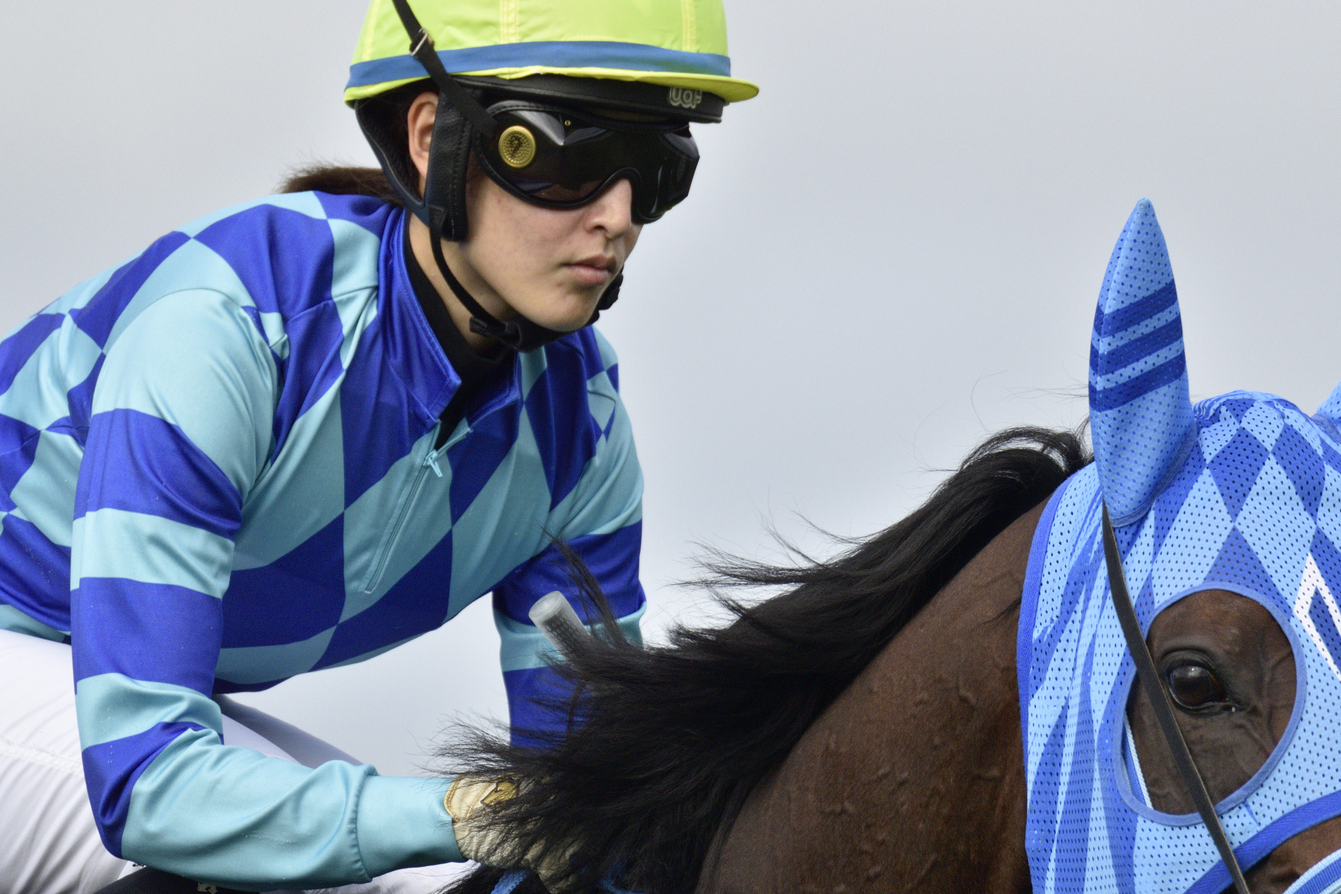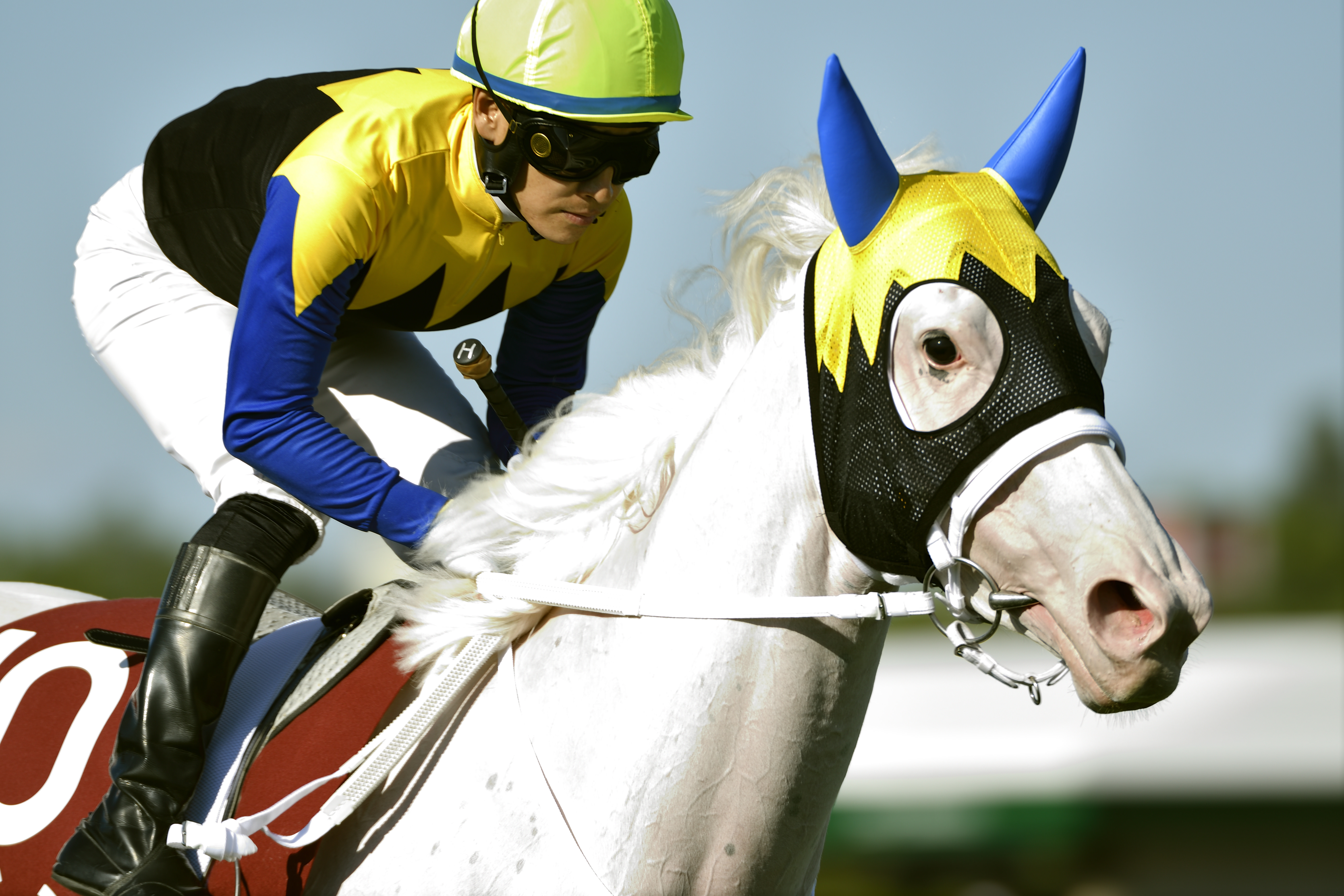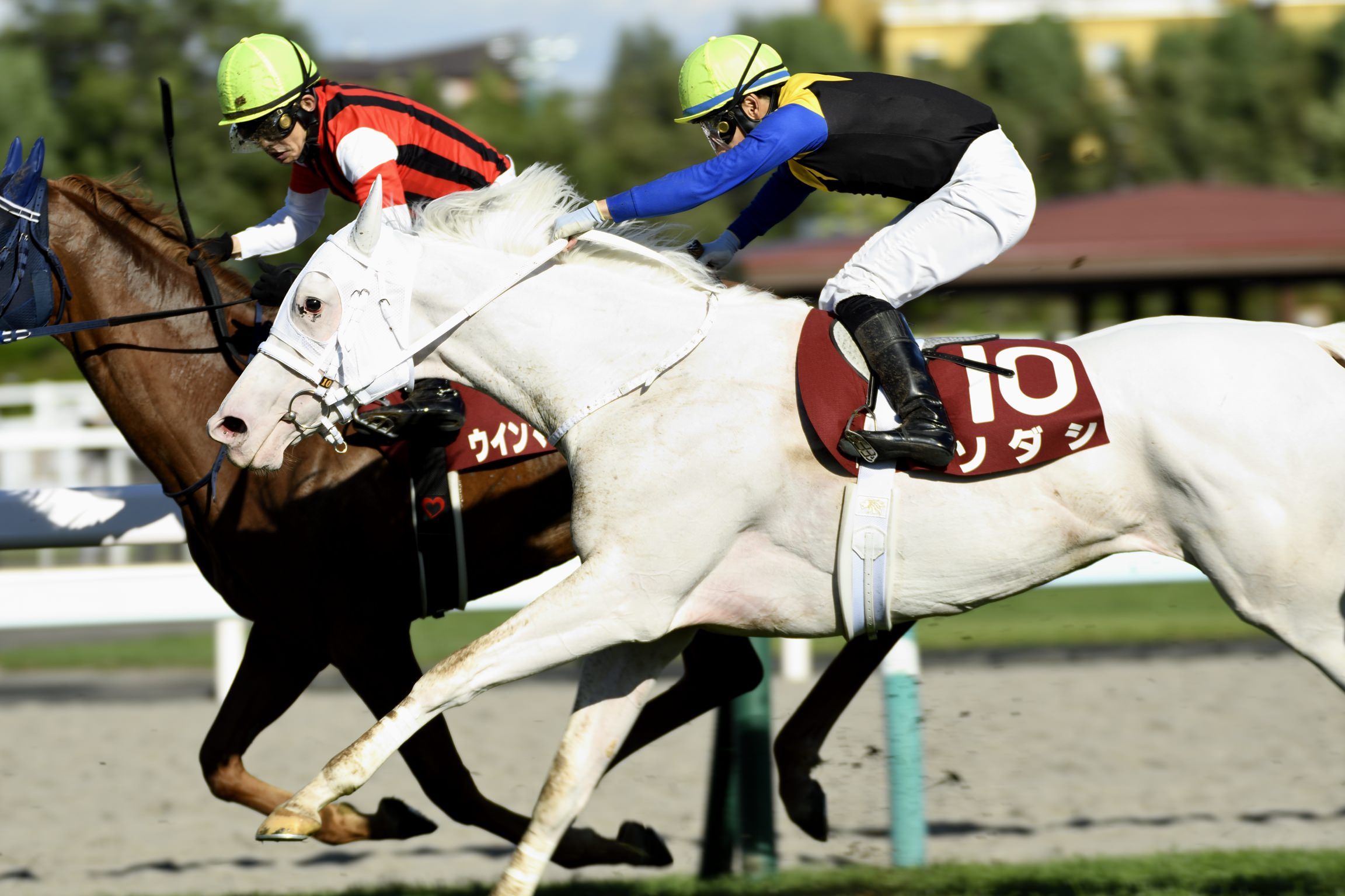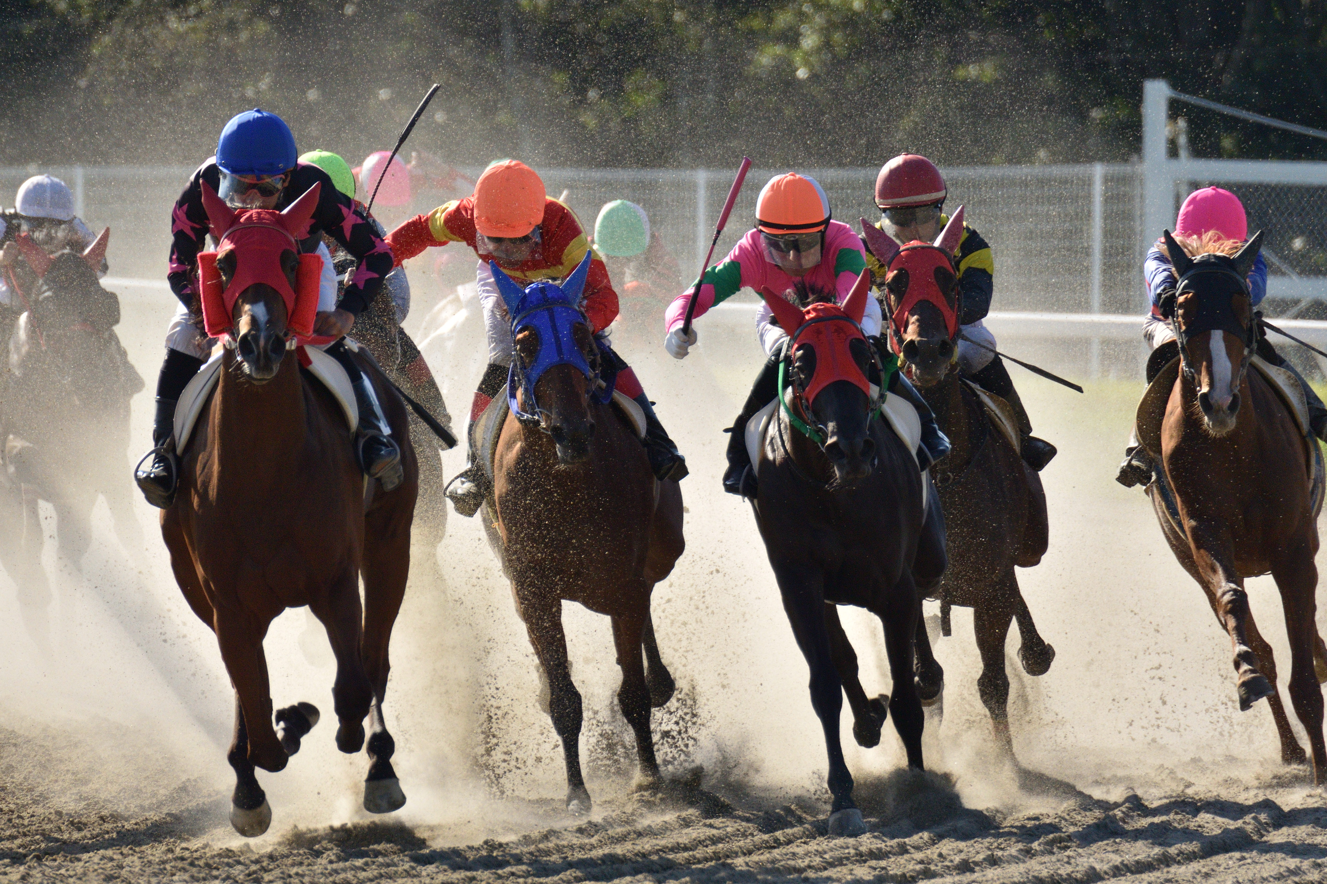 太陽を背に4コーナーでハナを切る馬と、それを追う馬たちとのしのぎあい。