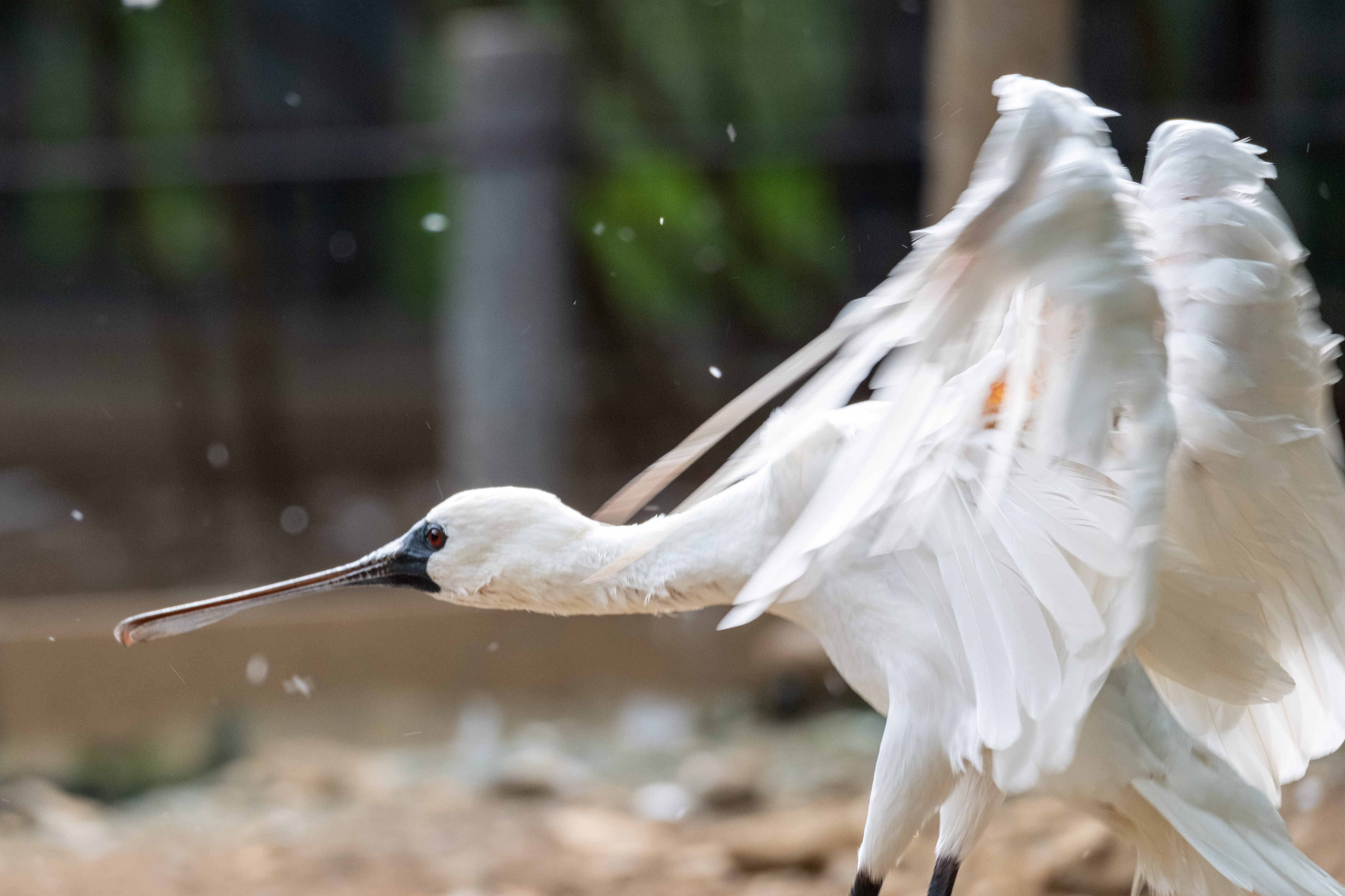 動物園の水場で水浴びをする鳥たち。