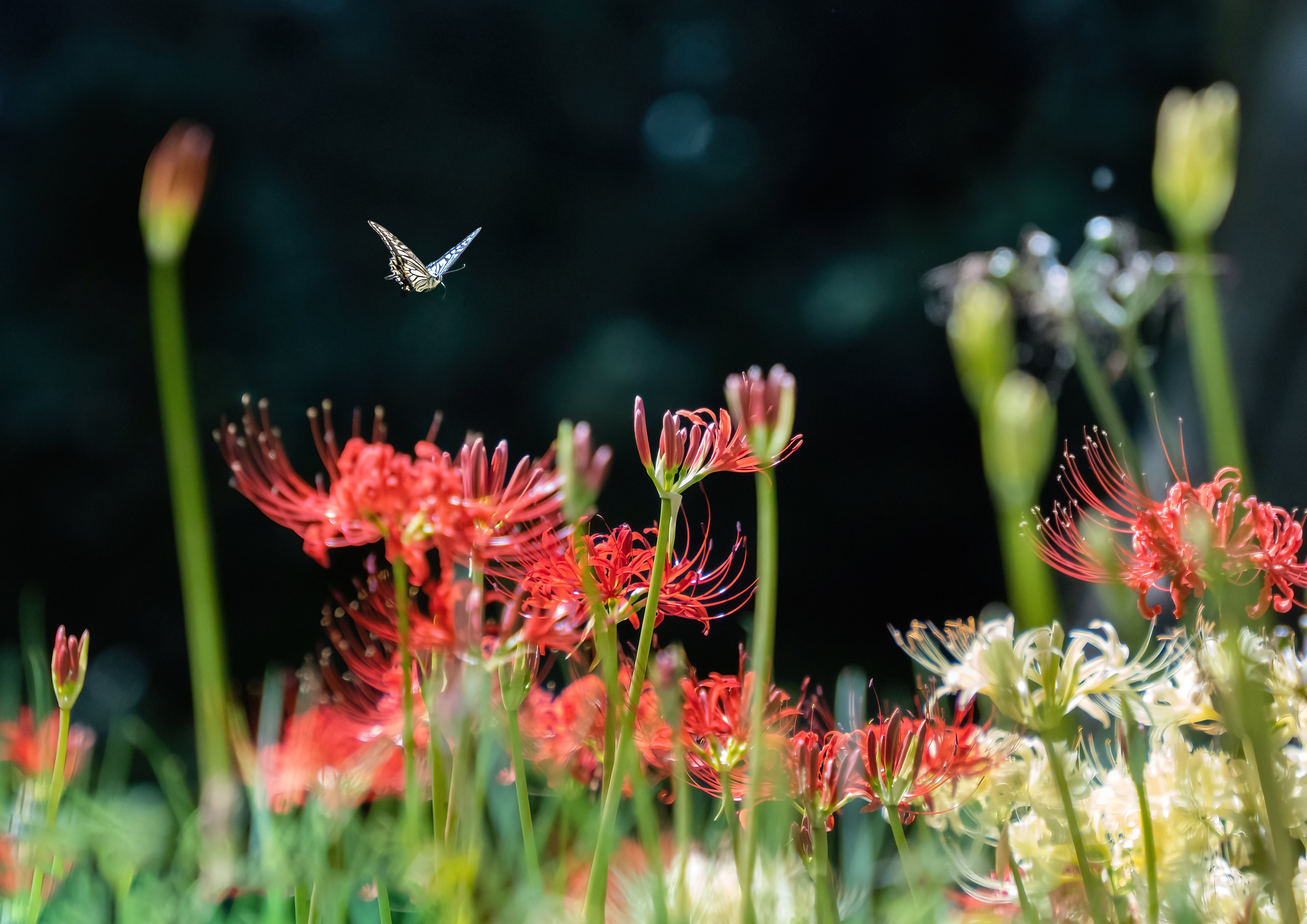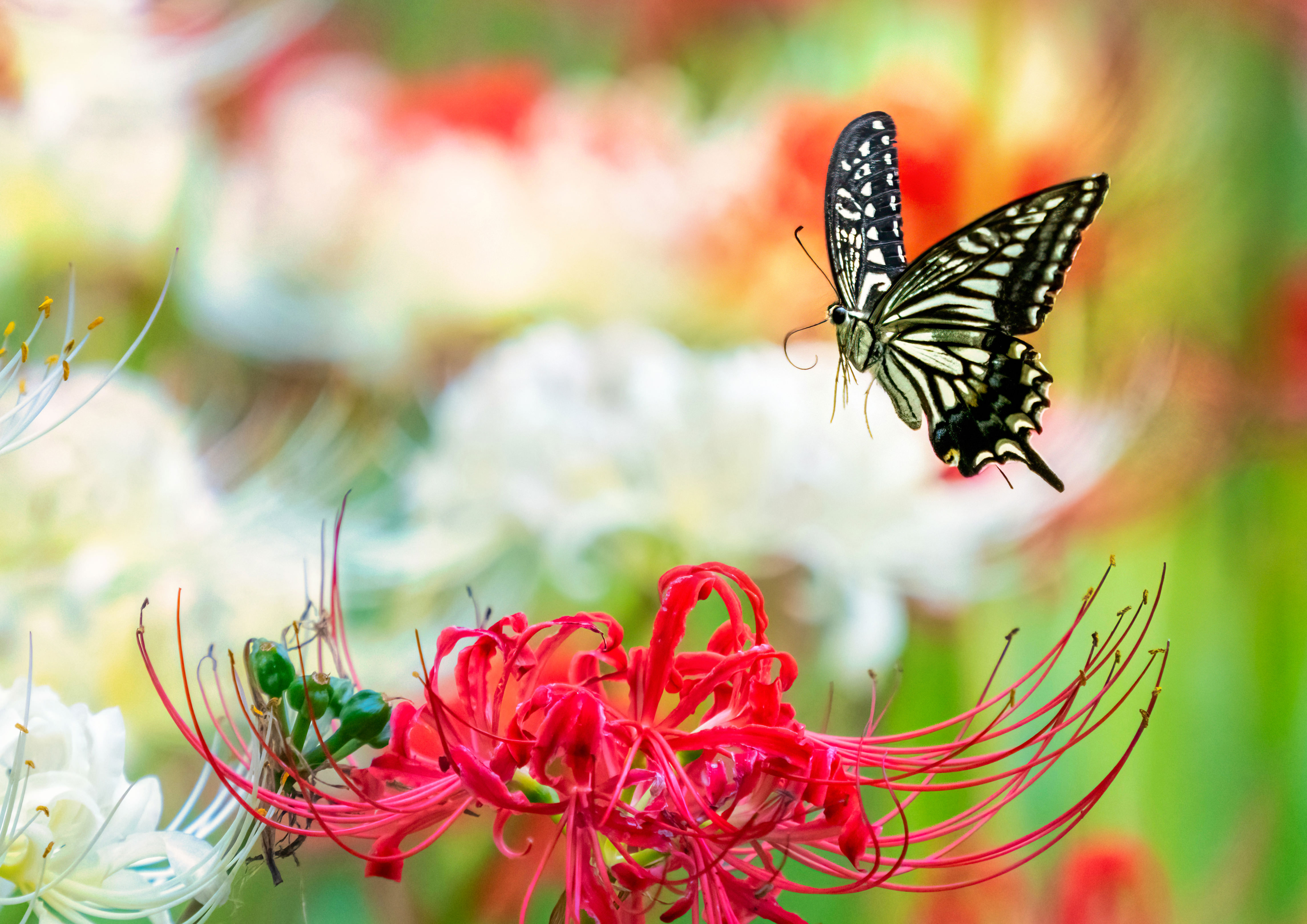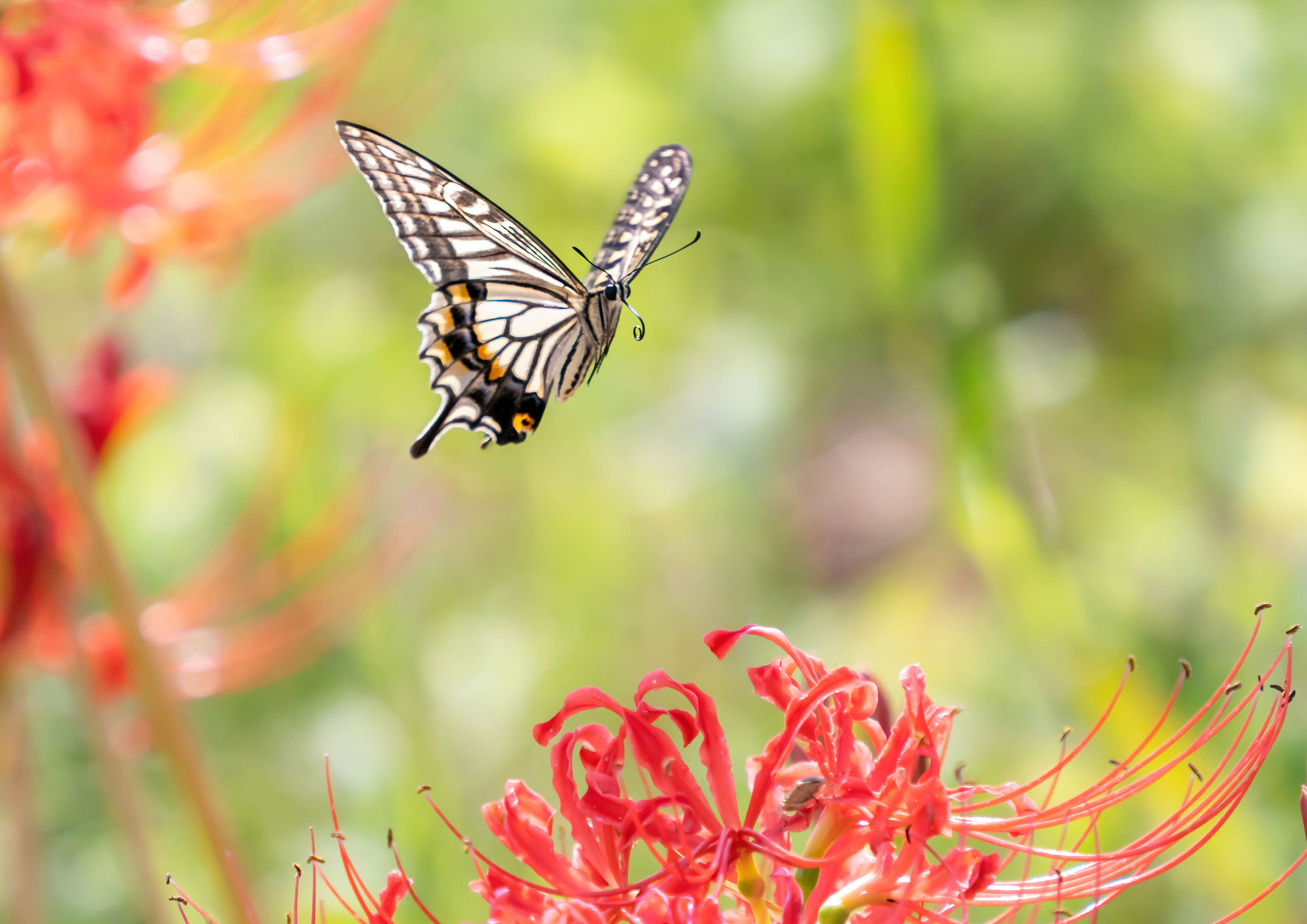 縄張りに入って来たナミアゲハのメスに喧嘩を売るモンキチョウのオス。