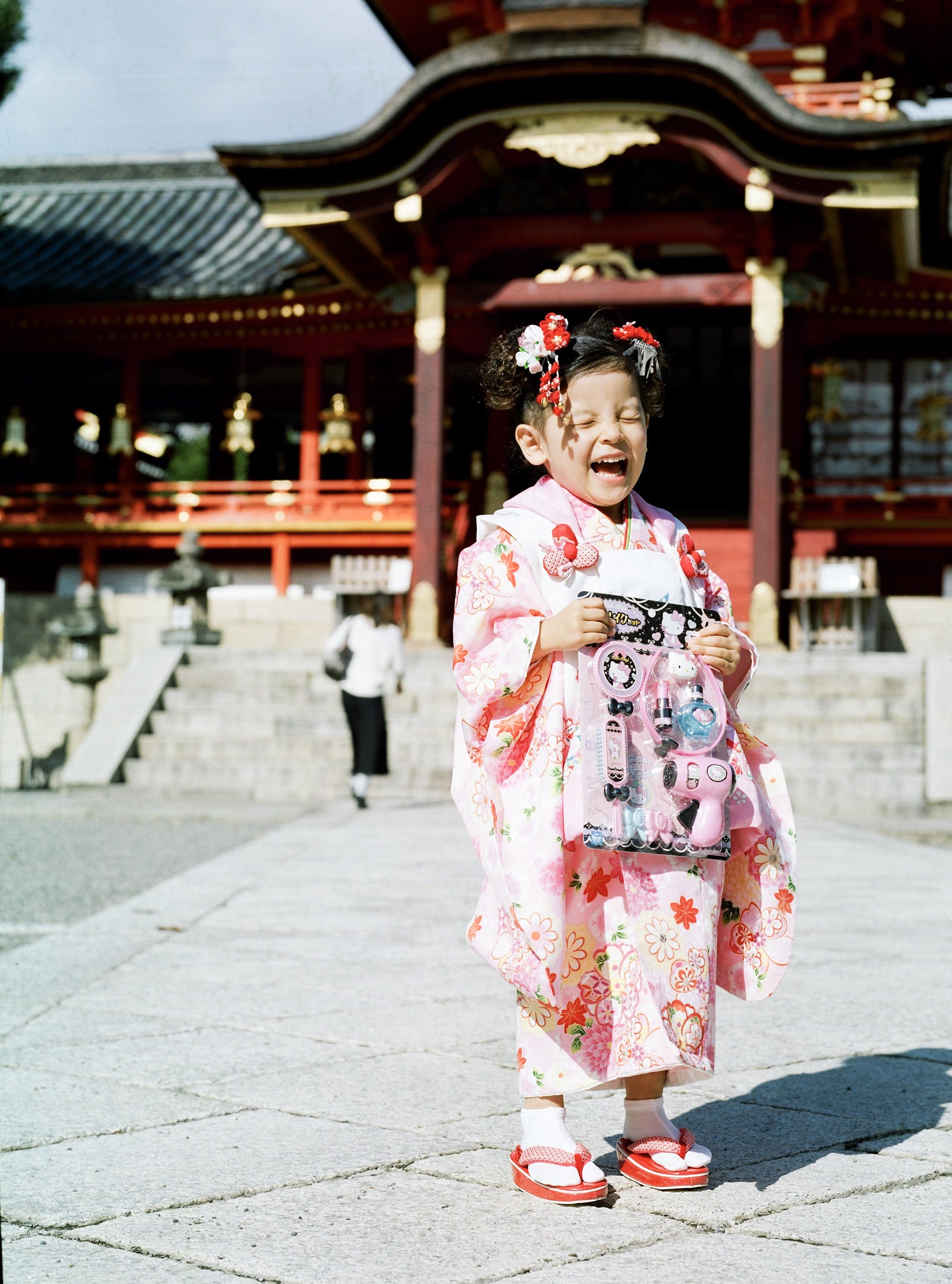 七五三の式中は表情が硬かったのですが、オモチャをもらったとたん満面の笑顔を見せてくれました。