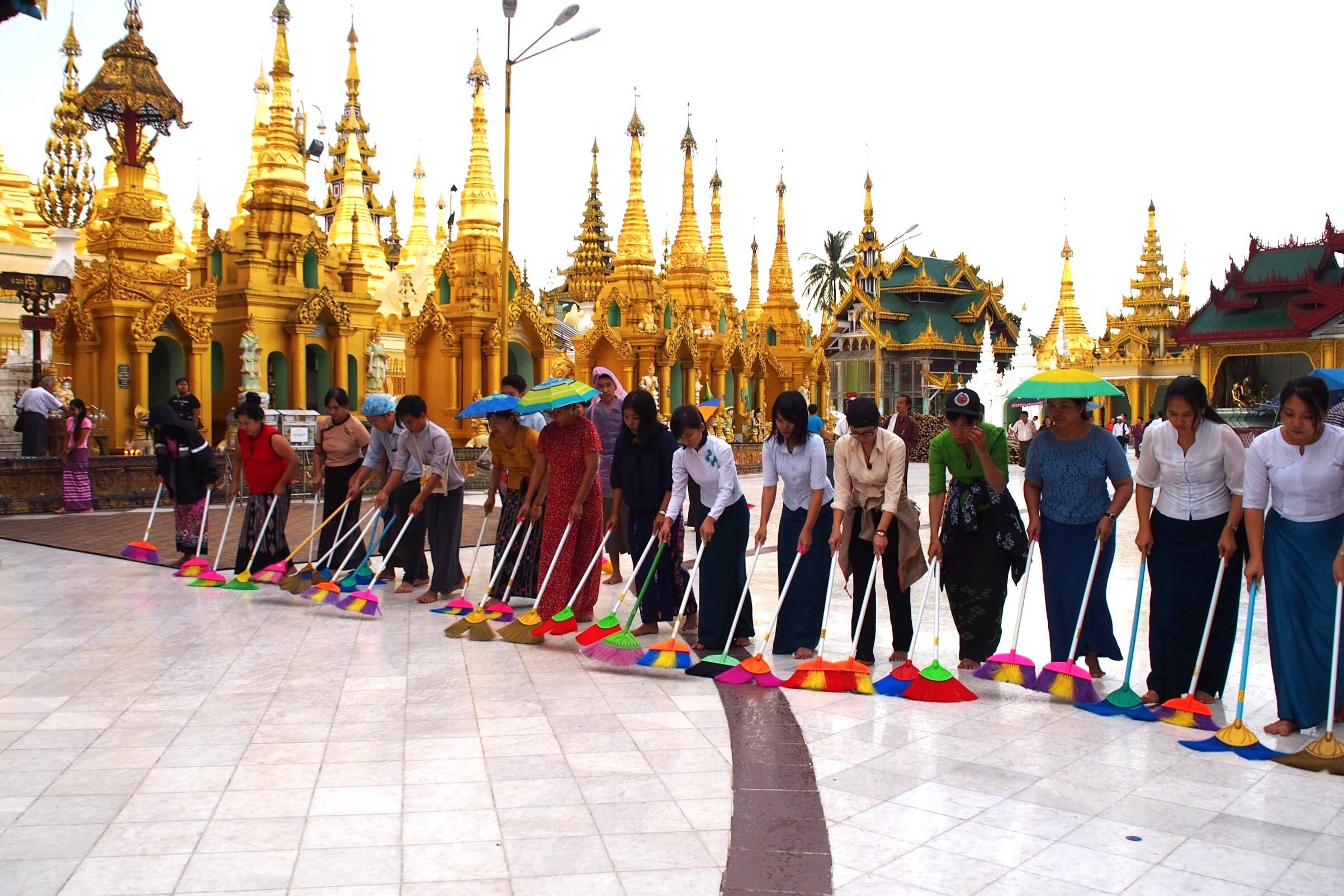 ミャンマーのシュエダゴンパゴダを掃除しているレアなショットです。