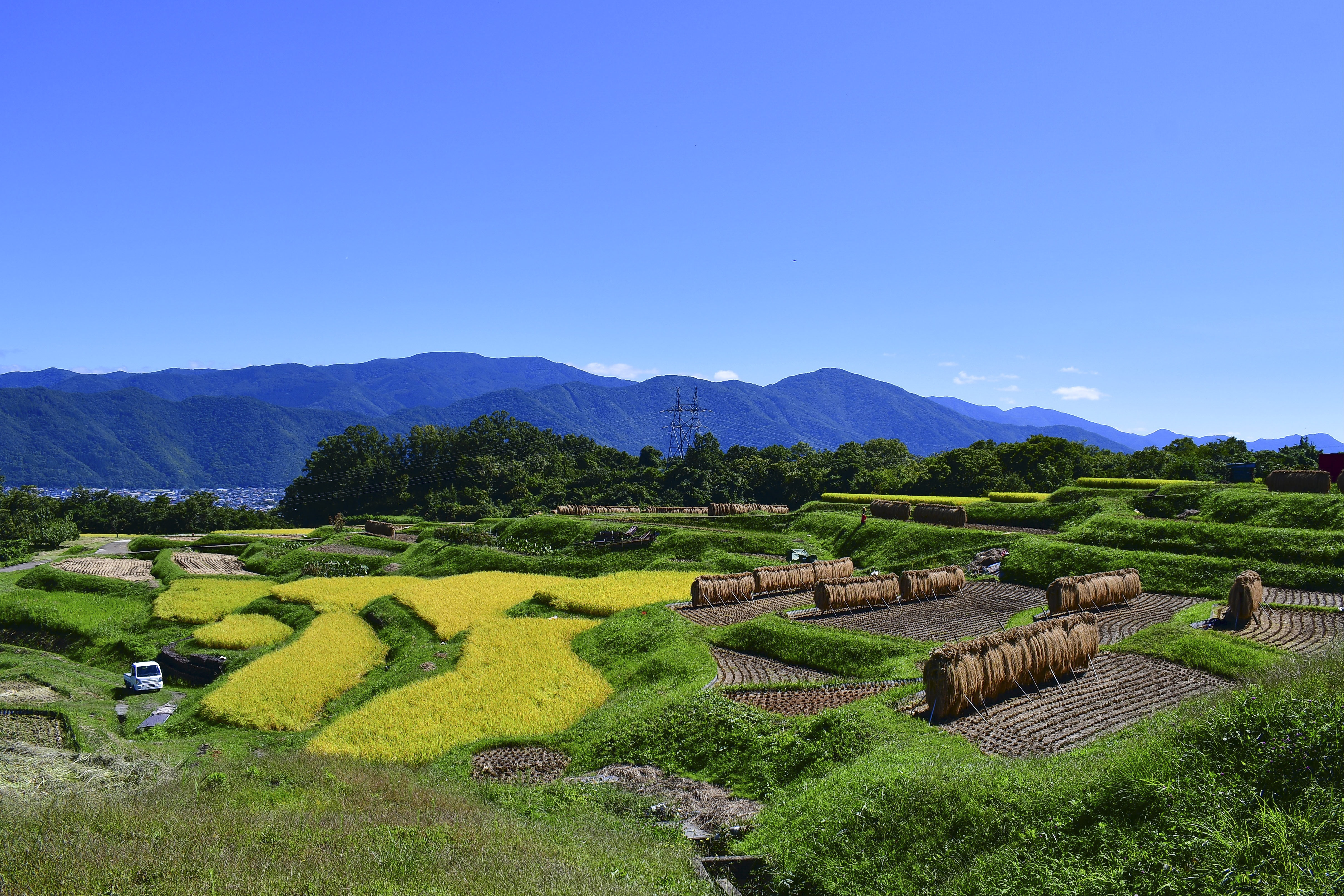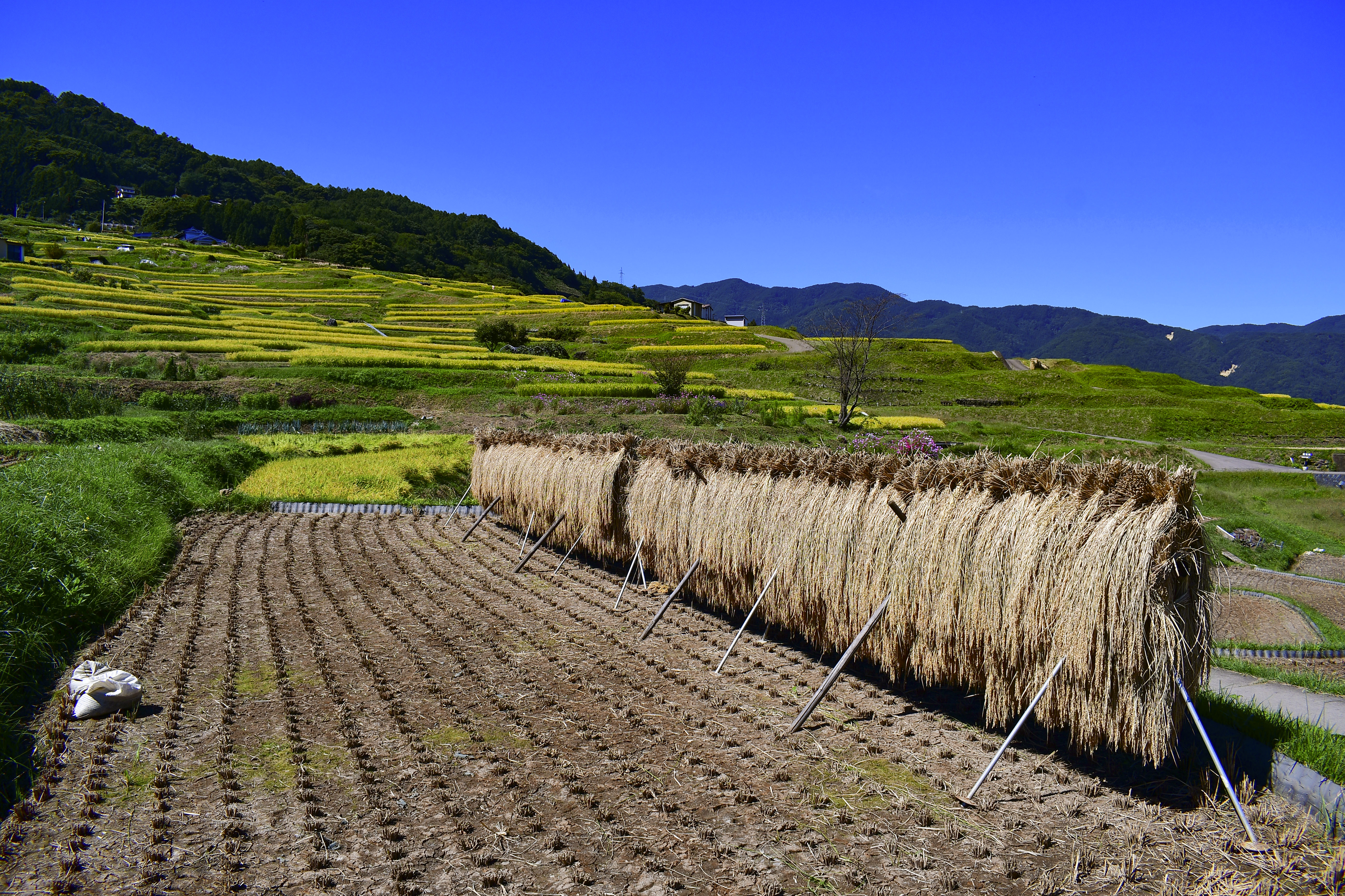 秋晴れのもと、整然と並ぶ稲架掛け。黄金の稲が太陽に照らされ、実りの季節の終わりを告げていた。