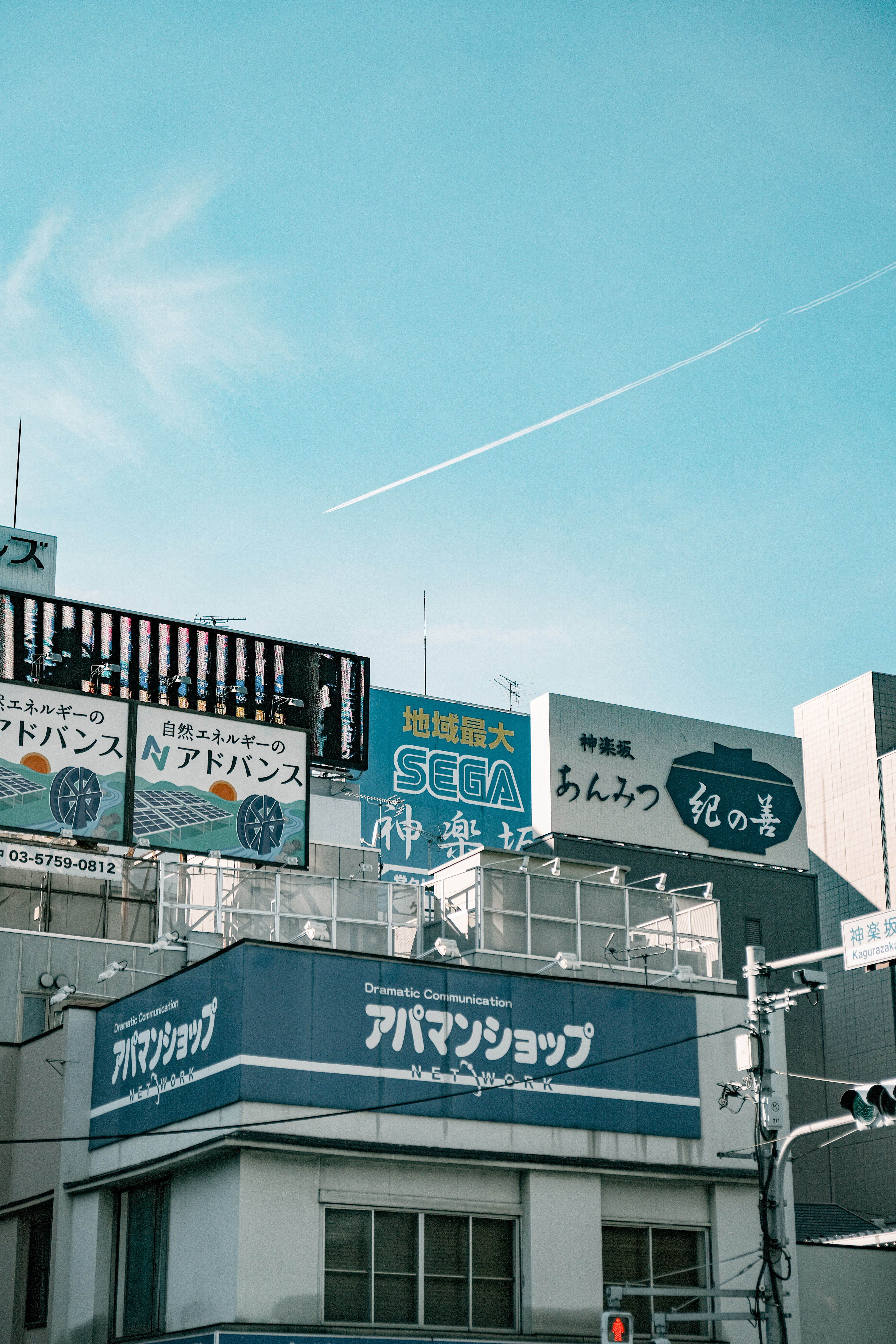 神楽坂を散歩中にふと空を見上げたら青空に1本白い線がかかってました
