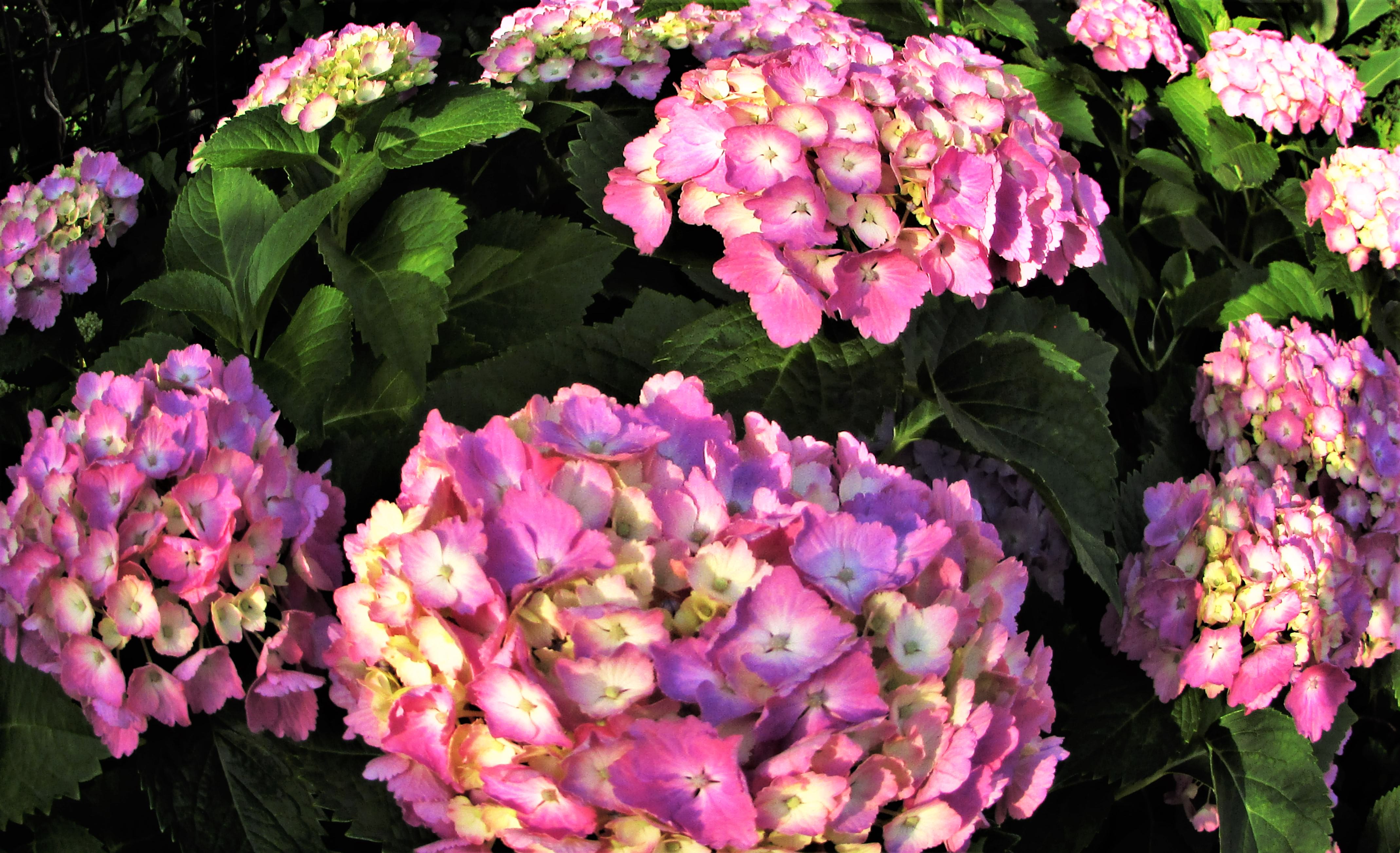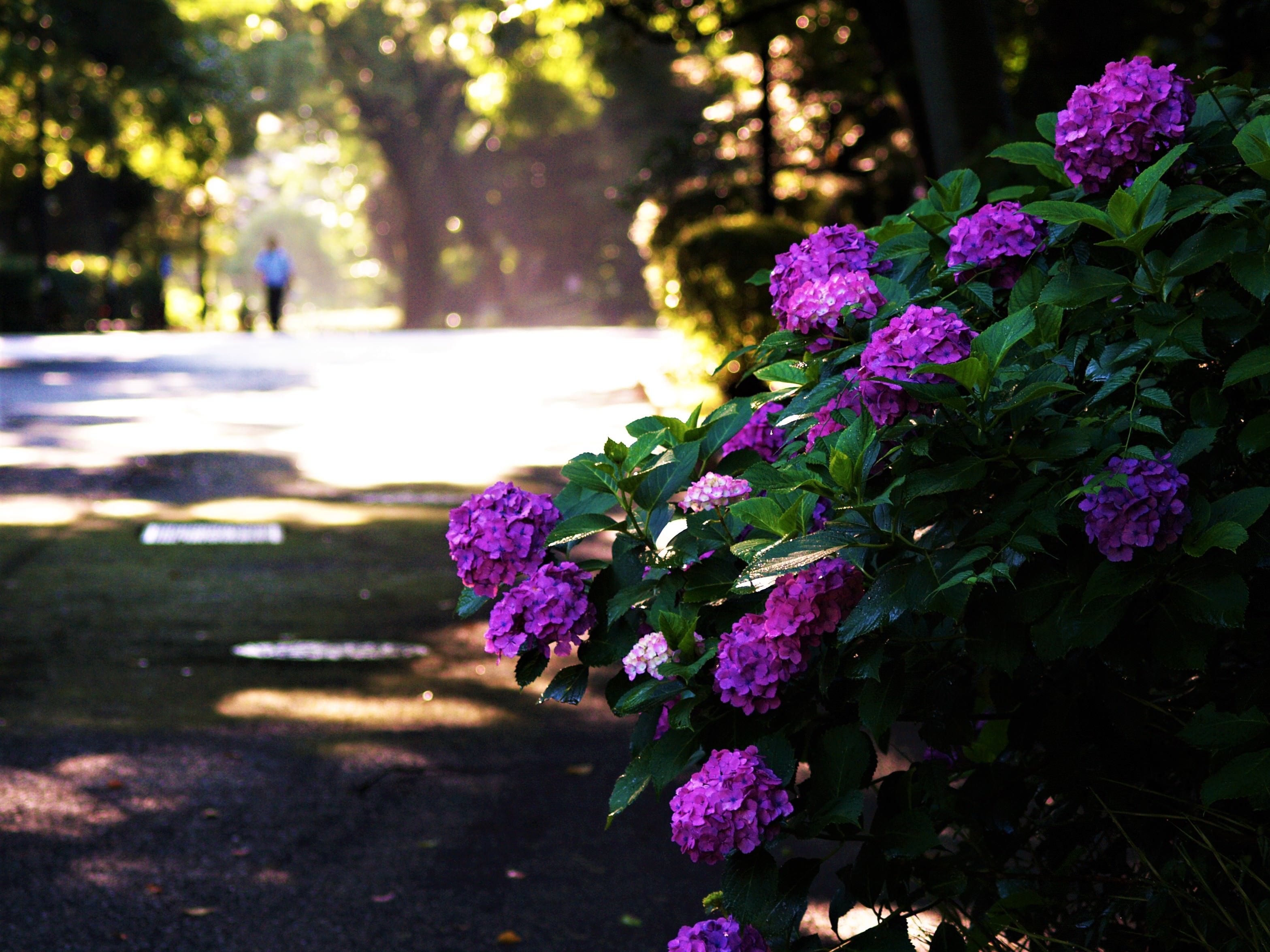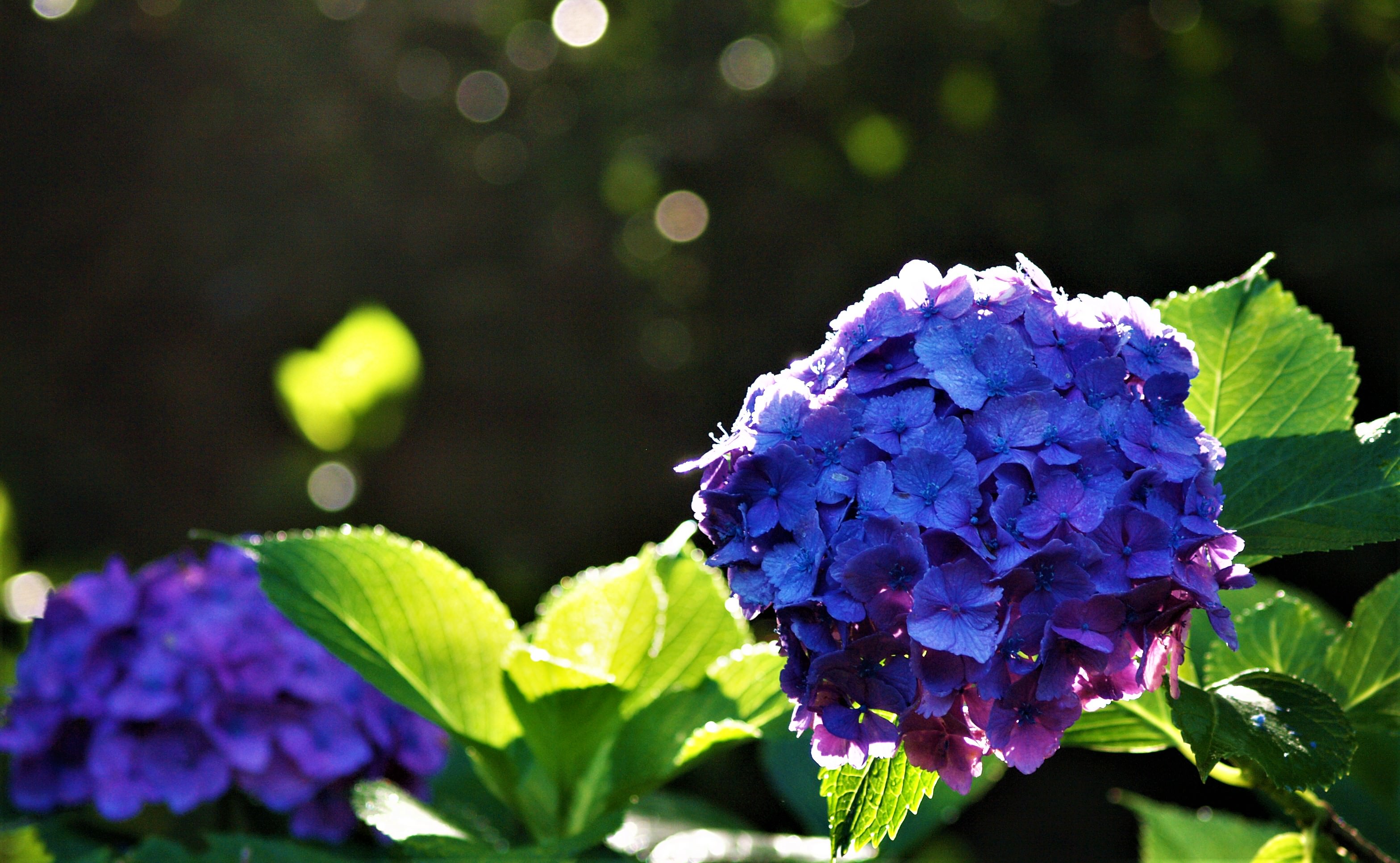 雨上がりの朝、まぶしい太陽が茂みに潜む花々を