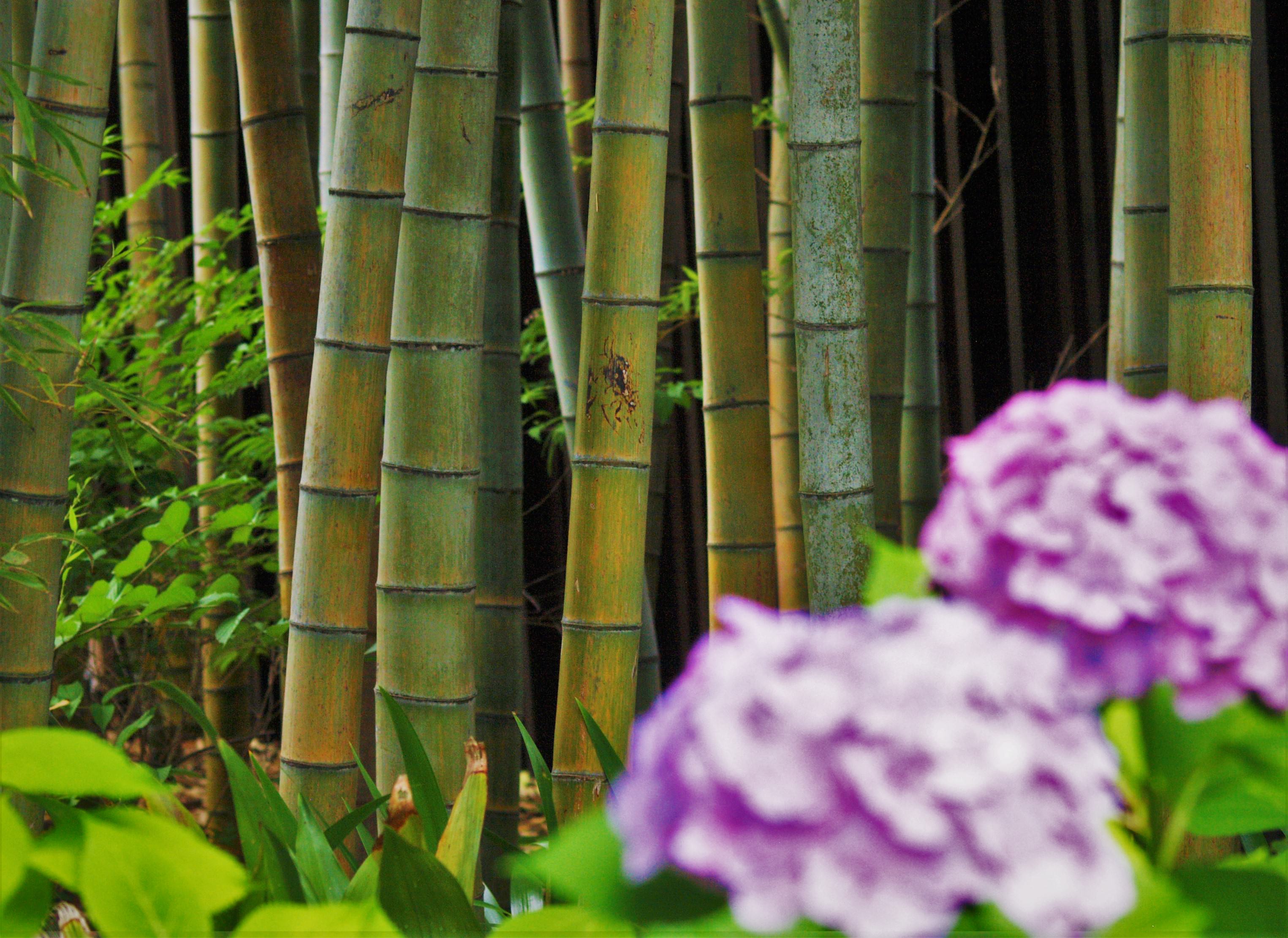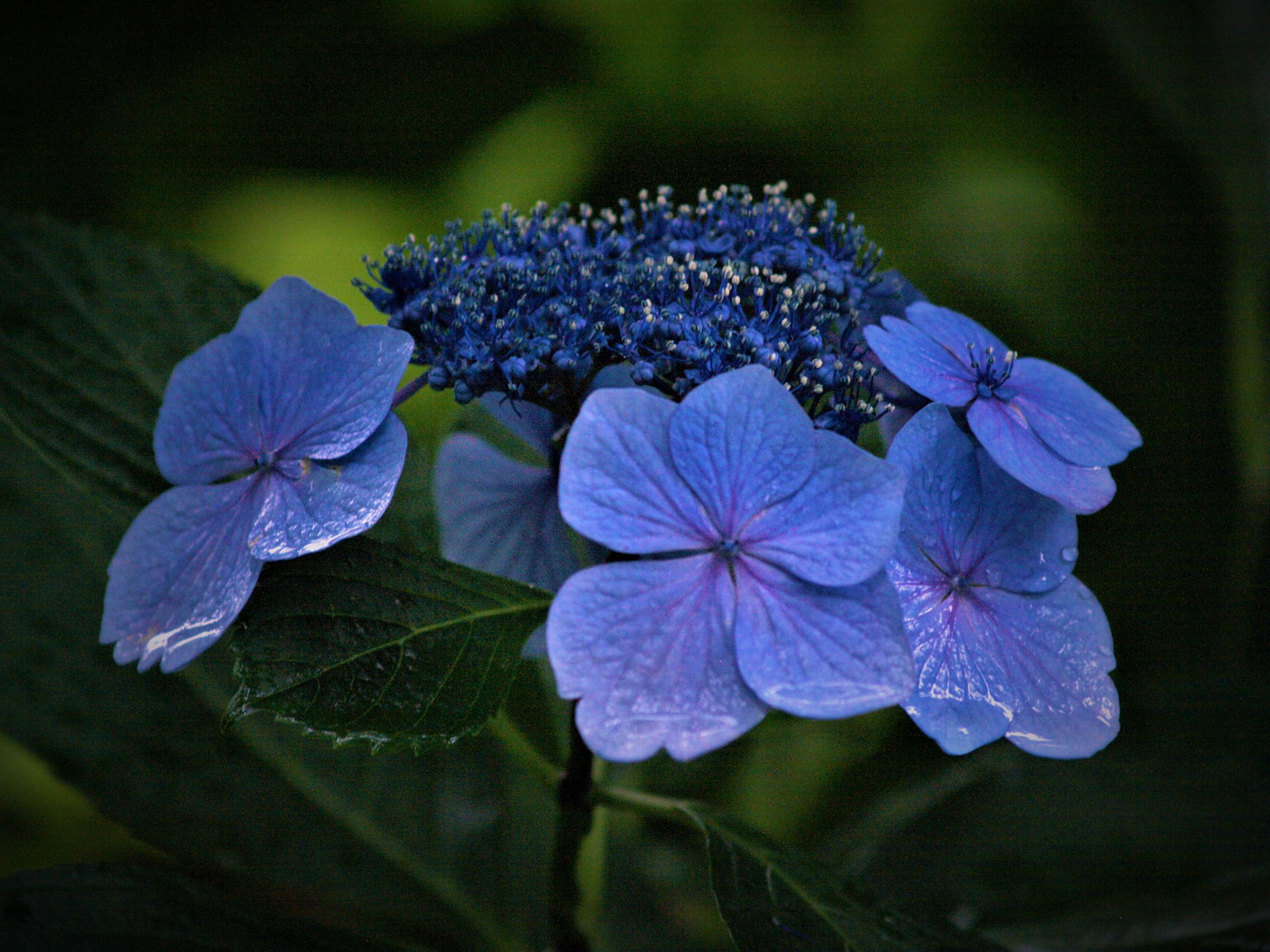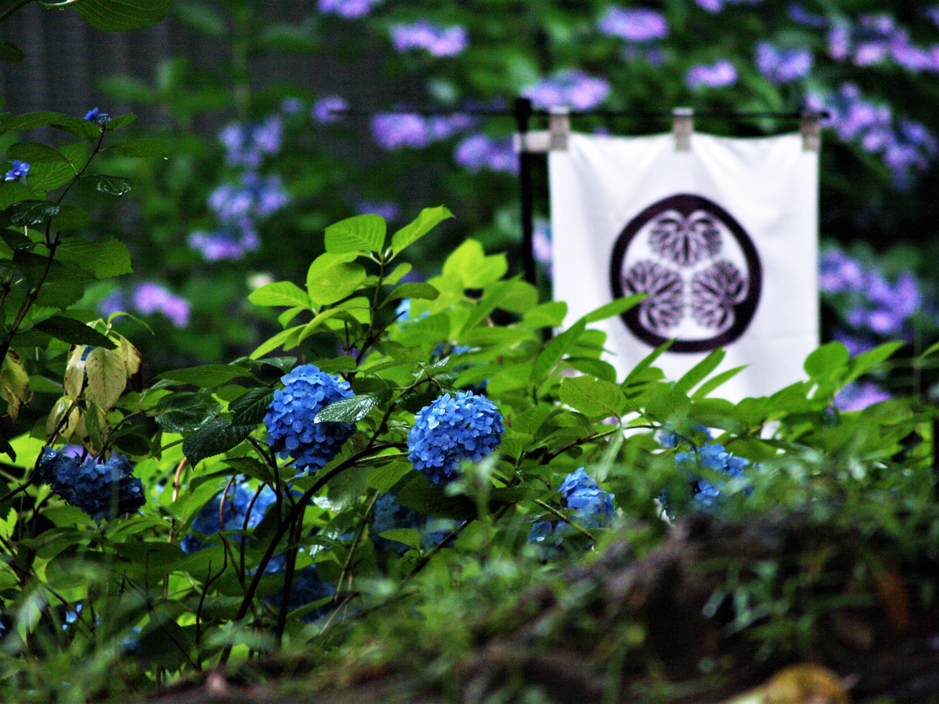 雨上がりの朝、まぶしい太陽が茂みに潜む花々を