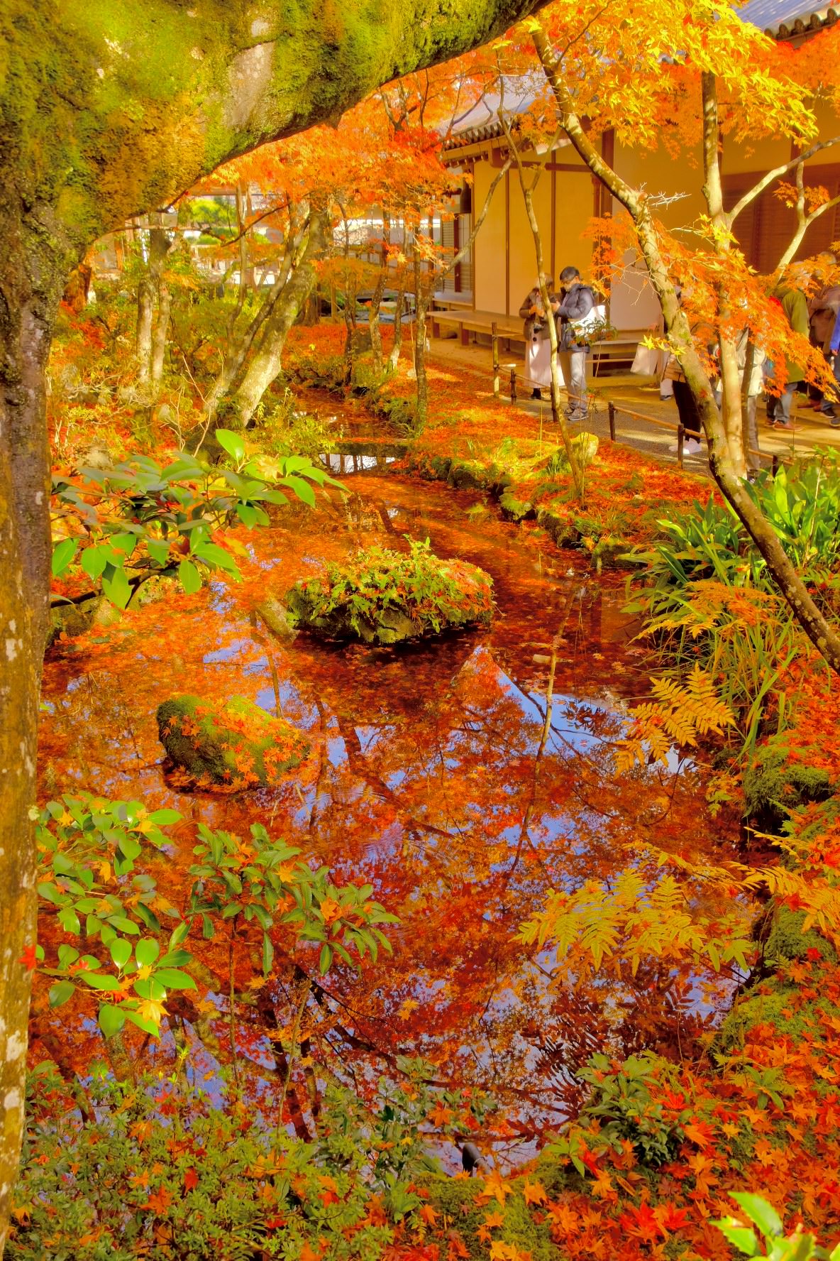 涸沢ヒュッテから山々の紅葉を見上げる人々