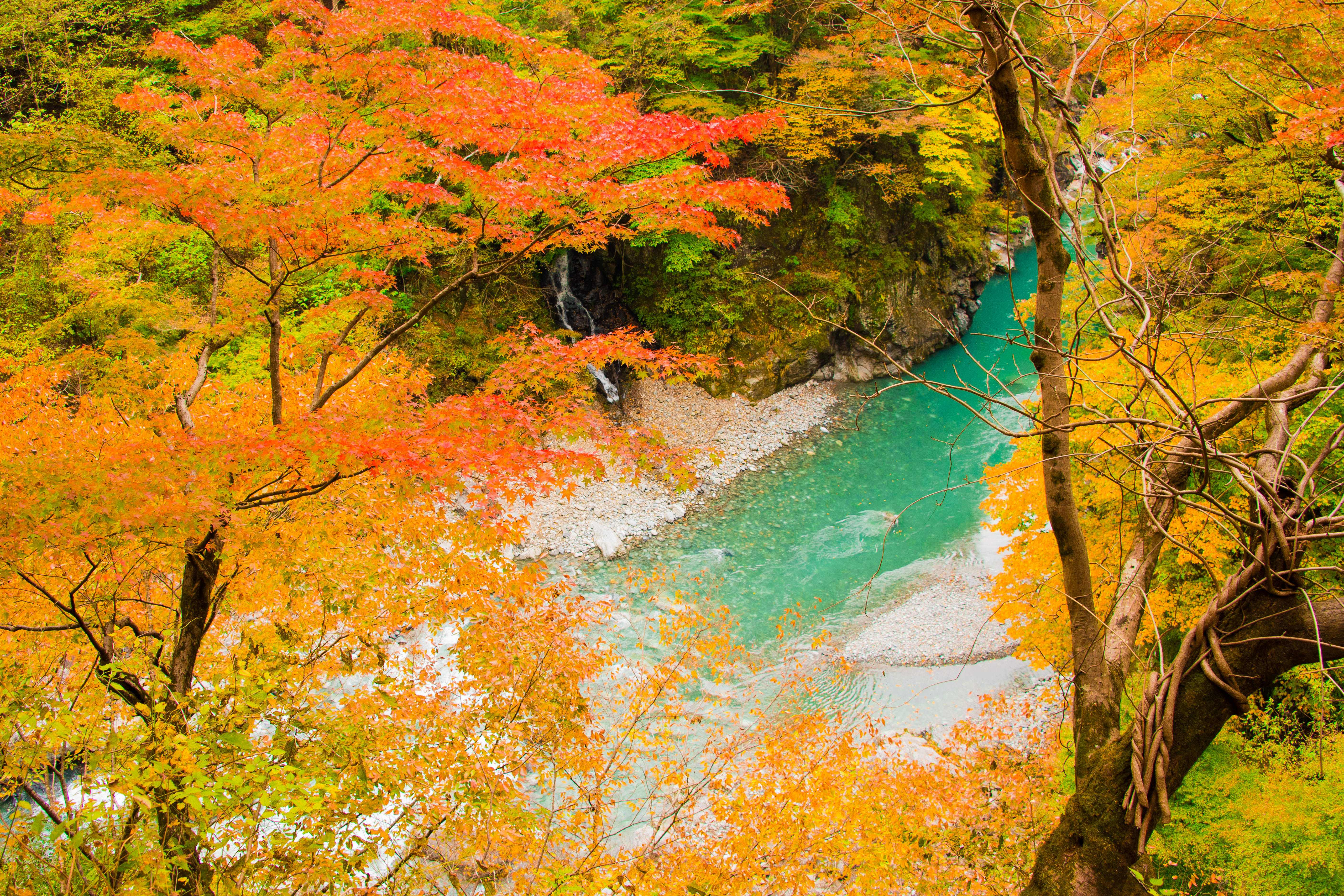 力強い緑の木々、踊るように流れるエメラルドグリーンの渓流、